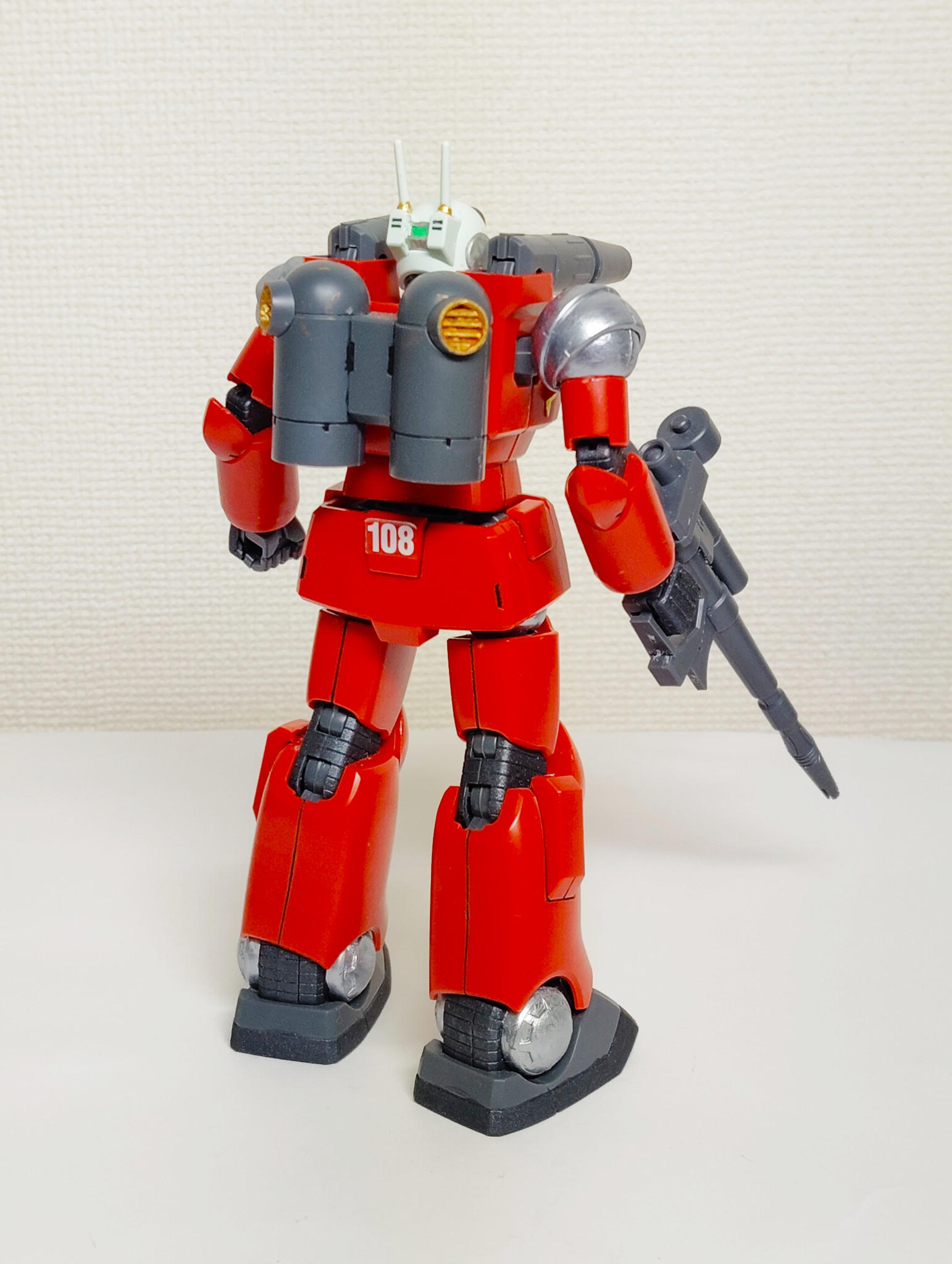 球形の関節部はメタリック・シルバーで、アクリルガッシュの黒の艶消しが墨入れ部を引き締める。赤・黄・黒がいい塩梅で形作る。昭和ロボット侮りがたし!