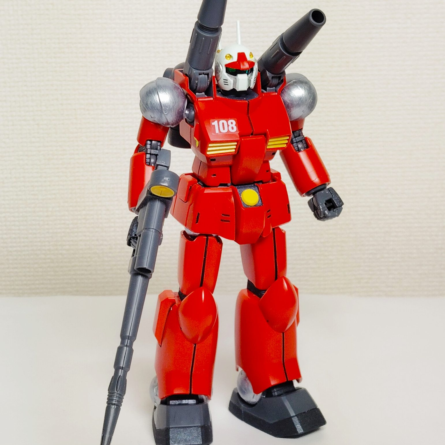 手に取ると出来の良さが分かるガンキャノン。20年以上前、友人宅で手にしたHGガンキャノン。凄く良く見えた。ガンキャノン、ガンタンクはデザイン的に昭和アニメの子供向け玩具感がありありと見えて、好きじゃなかった。なのに、このHGは実によくまとまって、武骨ながら洗練されて丁度いい小ささに出来上がっている。