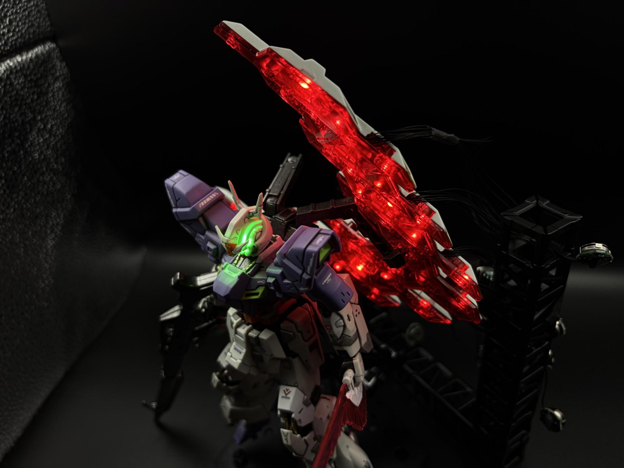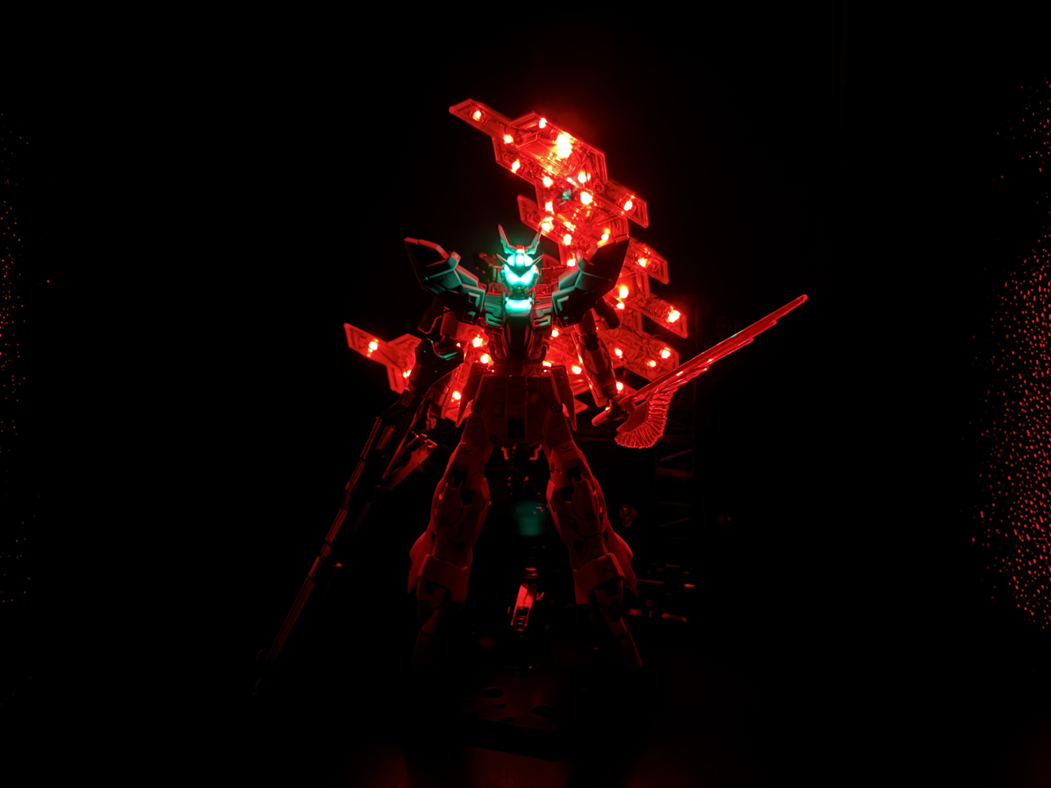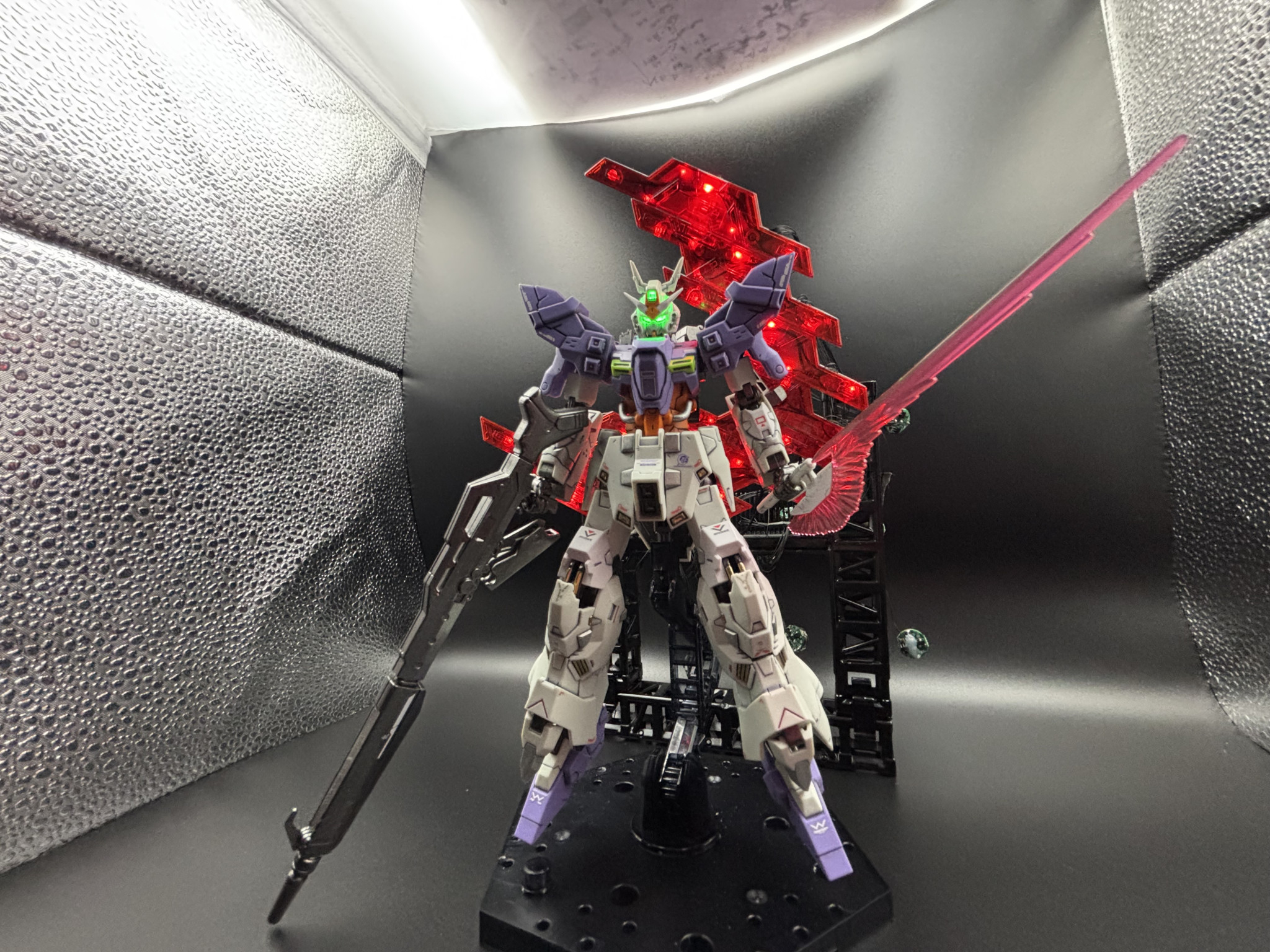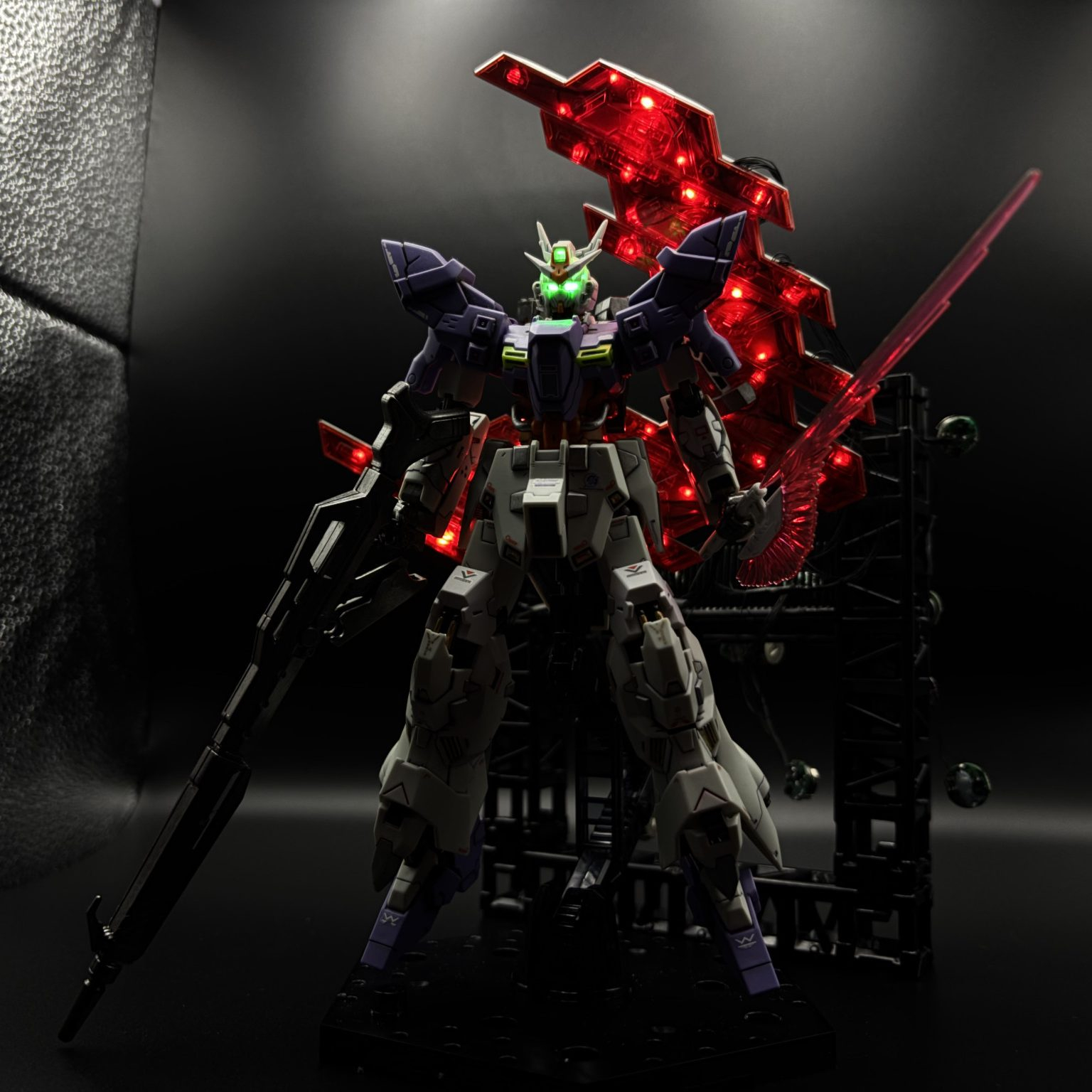 ベース限定のロングライフル装備ムーンガンダムを部分塗装して電飾で仕上げました。ムーンガンダム大好きなんで時間かけてこだわりました。