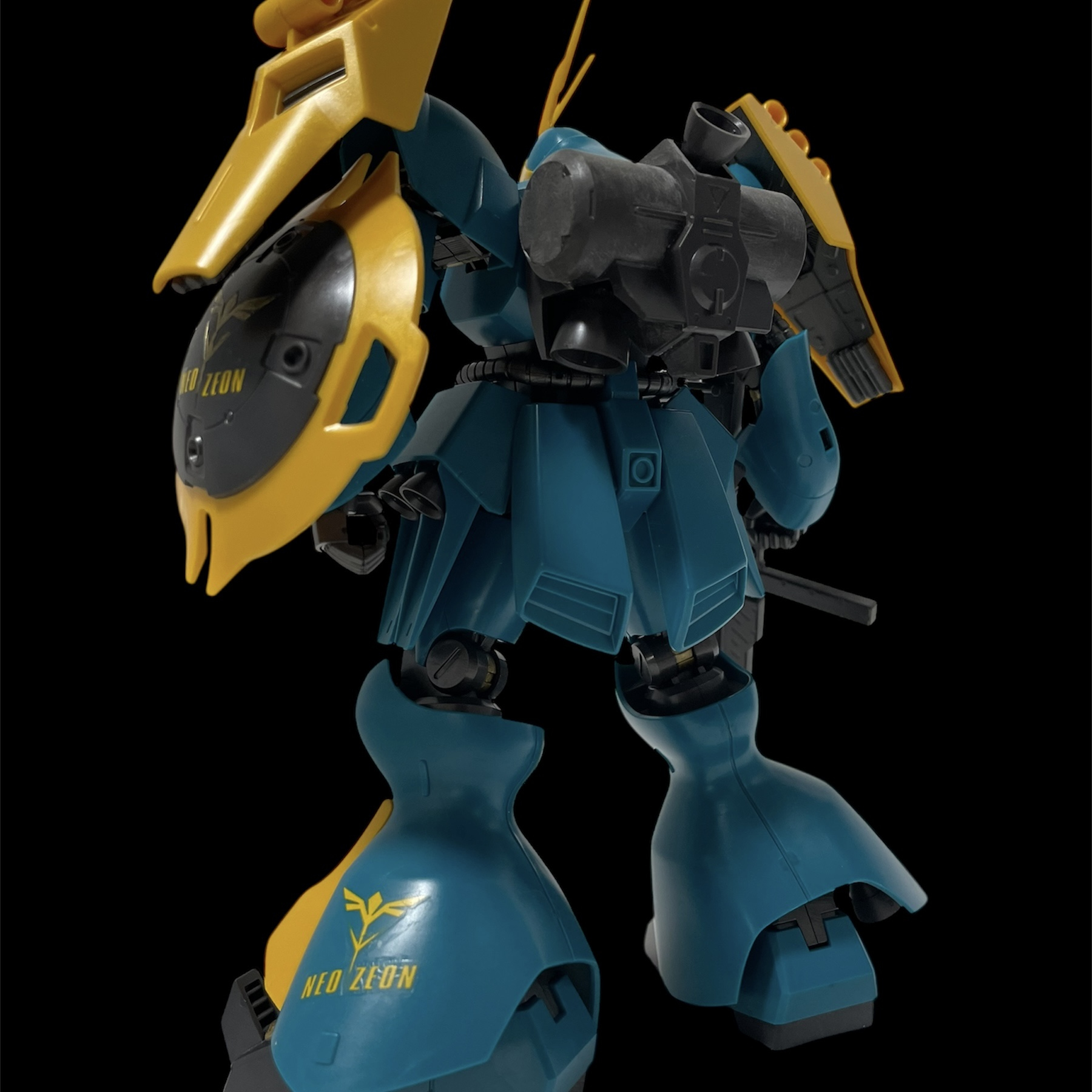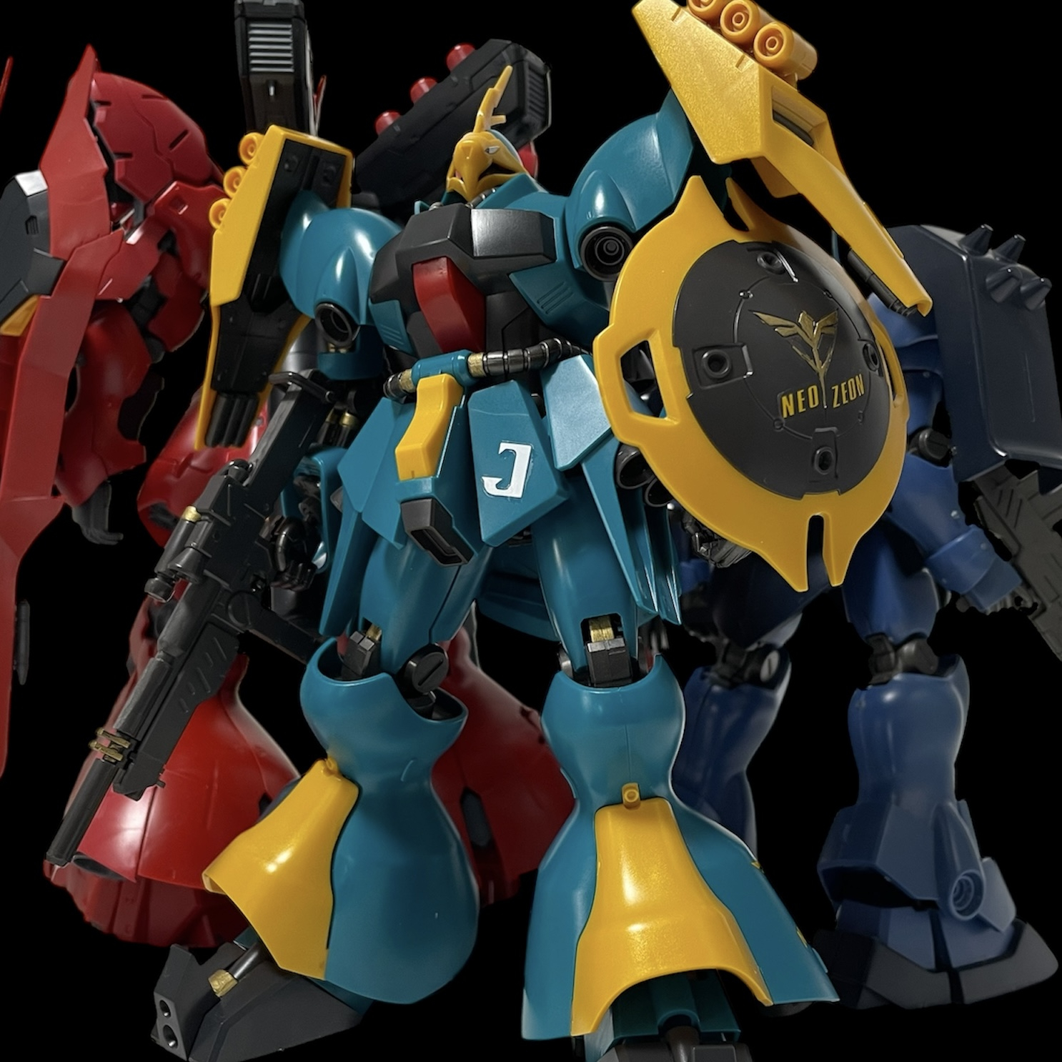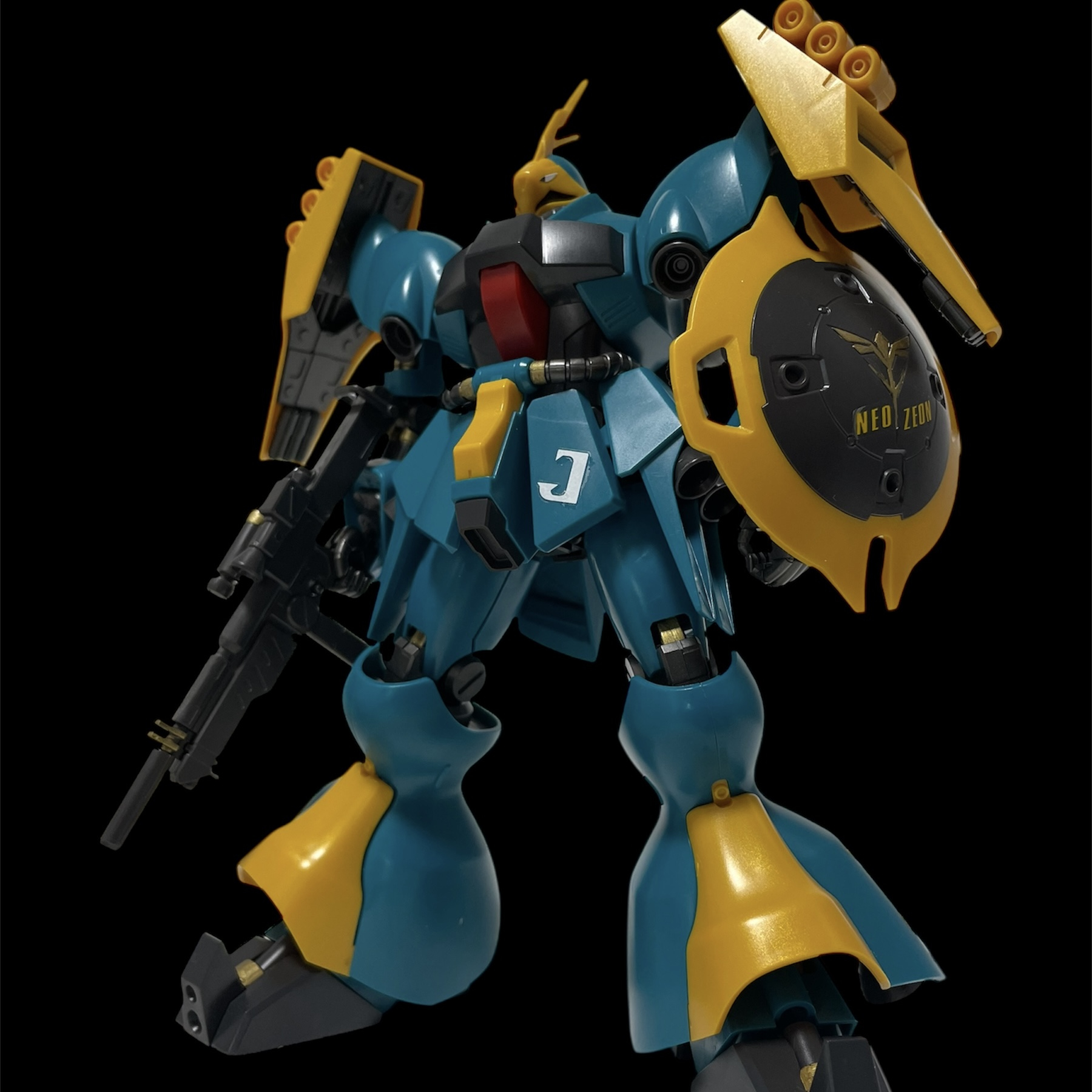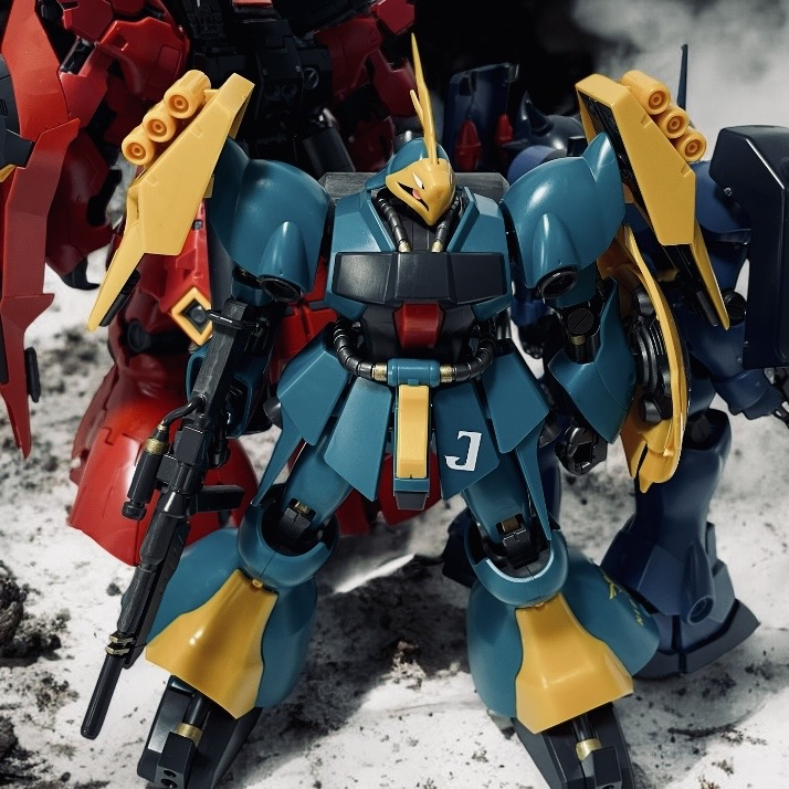 腰の【J】はヤクトドーガの頭文字ですね。ドイツ語で【狩猟】だとか。サザビーにはこの辺にマークが入っていたので余っていたキリル文字のJを貼り付け。