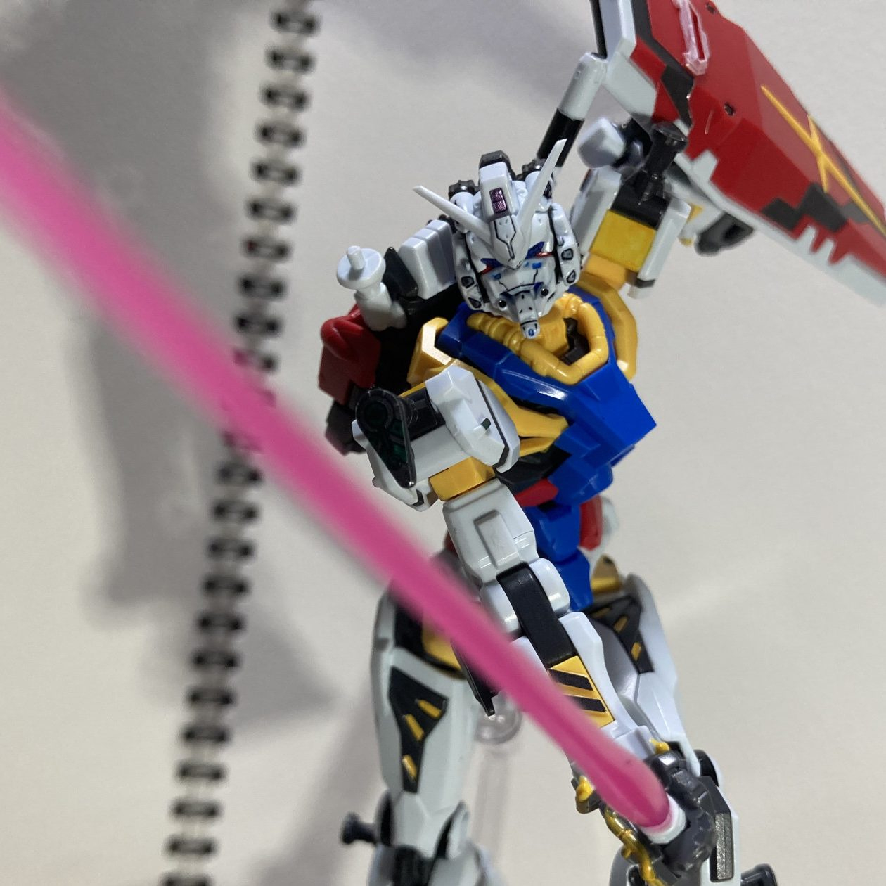 本編未使用のハイパー・バズーカは構えると様になりますね!そして、シールドは赤いガンダムと同様にジョイントパーツを使ってバックパックにマウントできます。