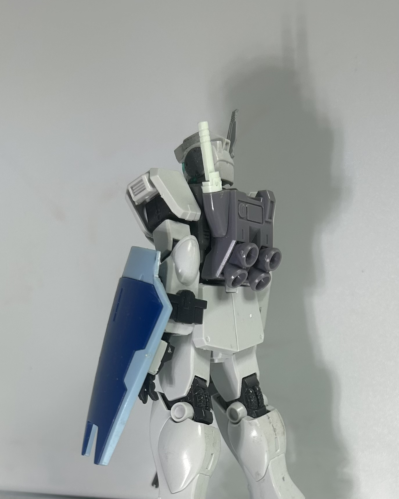 脳内設定では、ジムのバックパックのスラスター高出力化や後部センサーの強化してたら偶然後のジムⅡに似た形状になった感じ。