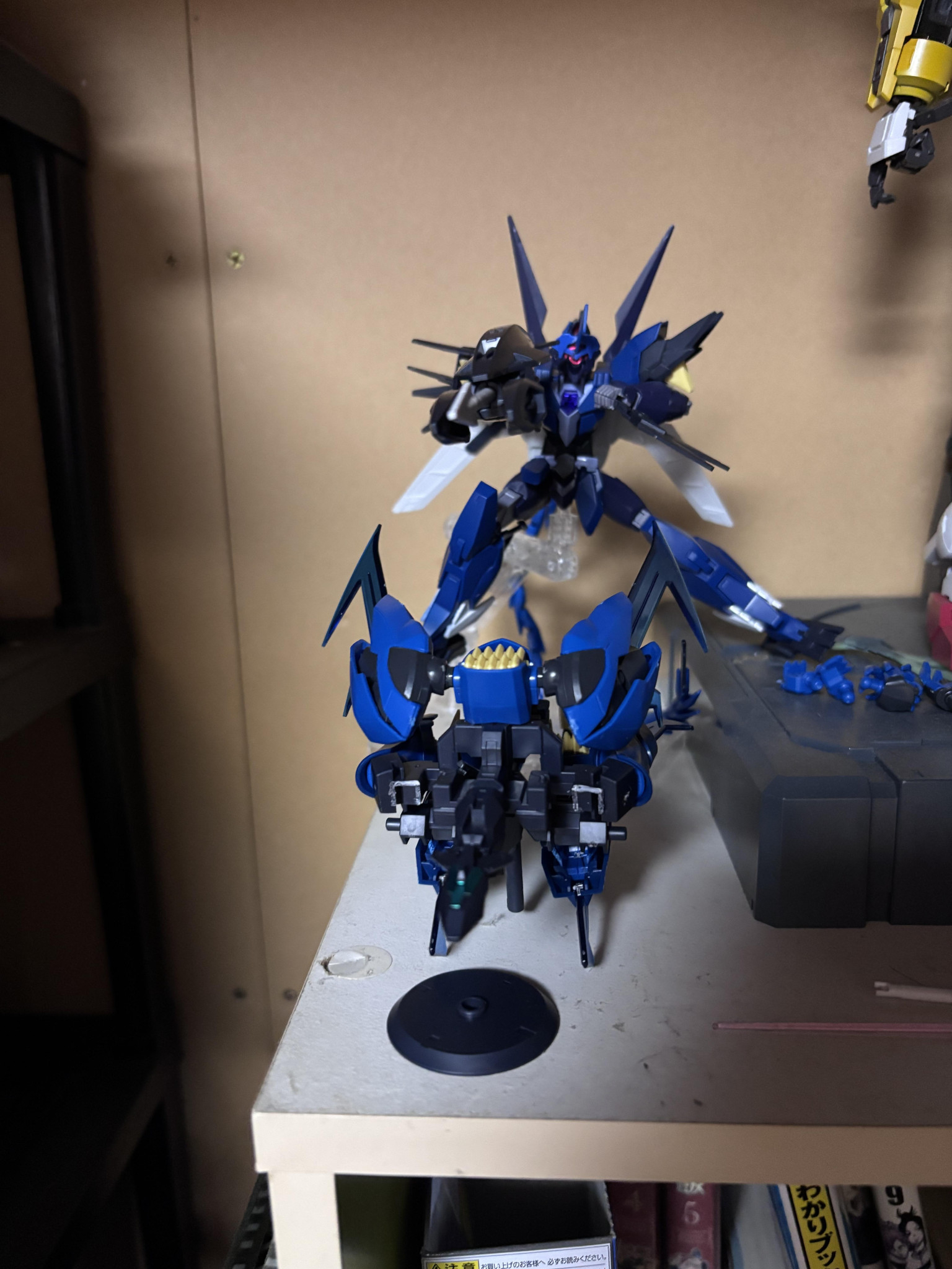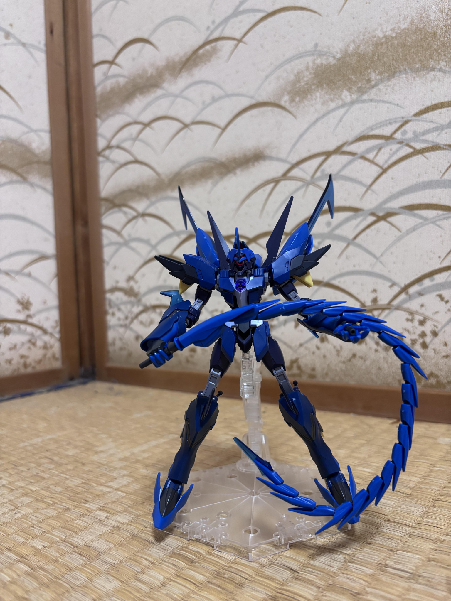 アルスコアガンダムと煌・ギラーガ、メルクワンユニット1部とアルスアースリィユニット1部をミキシング改造しました。テイルウィップ接続部分は接続軸の関係上アルスコアガンダムの背面腰部分に接着して接続しています。バックパックはアルスアースリィのバックパックから接続軸を移植して接続できるようにしています。アルスコアガンダムと煌・ギラーガの稼働域のお陰でポーズはがっちり決まります。腕部の接続はメルクワンユニットの腕部接続パーツにプラ板を2枚重ねたものをギラーガ腕部に接着しています