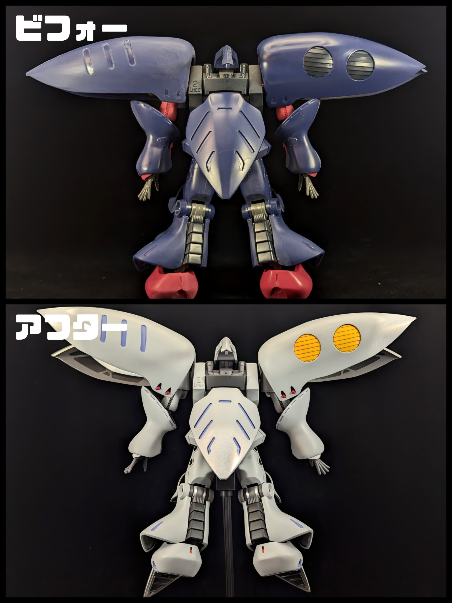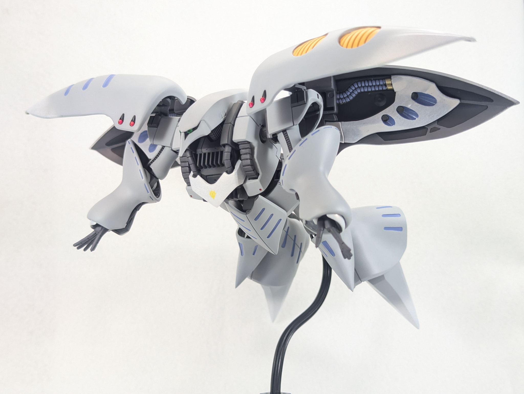 改修部分は、頭部クチバシを?若干短くし、首を若干持ち上げれる位置で固定出来るよう加工、腰約1ミリ延長、肩バインダーの形状若干変更&下がらないように動き制限、腕の合わせ目消し、足を少し開けるよう加工、膝装甲の先端尖らせ、腕、かかとの裏ディテール消し