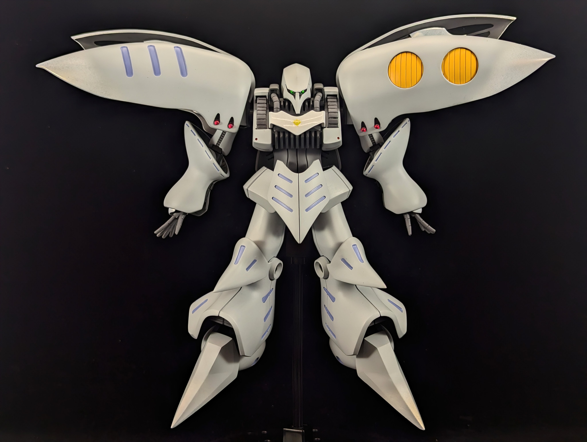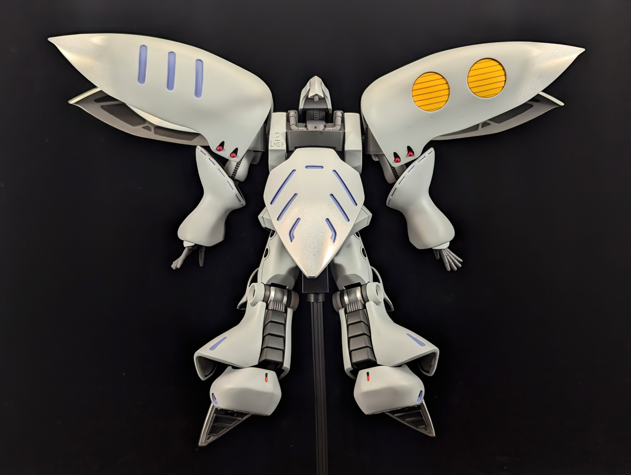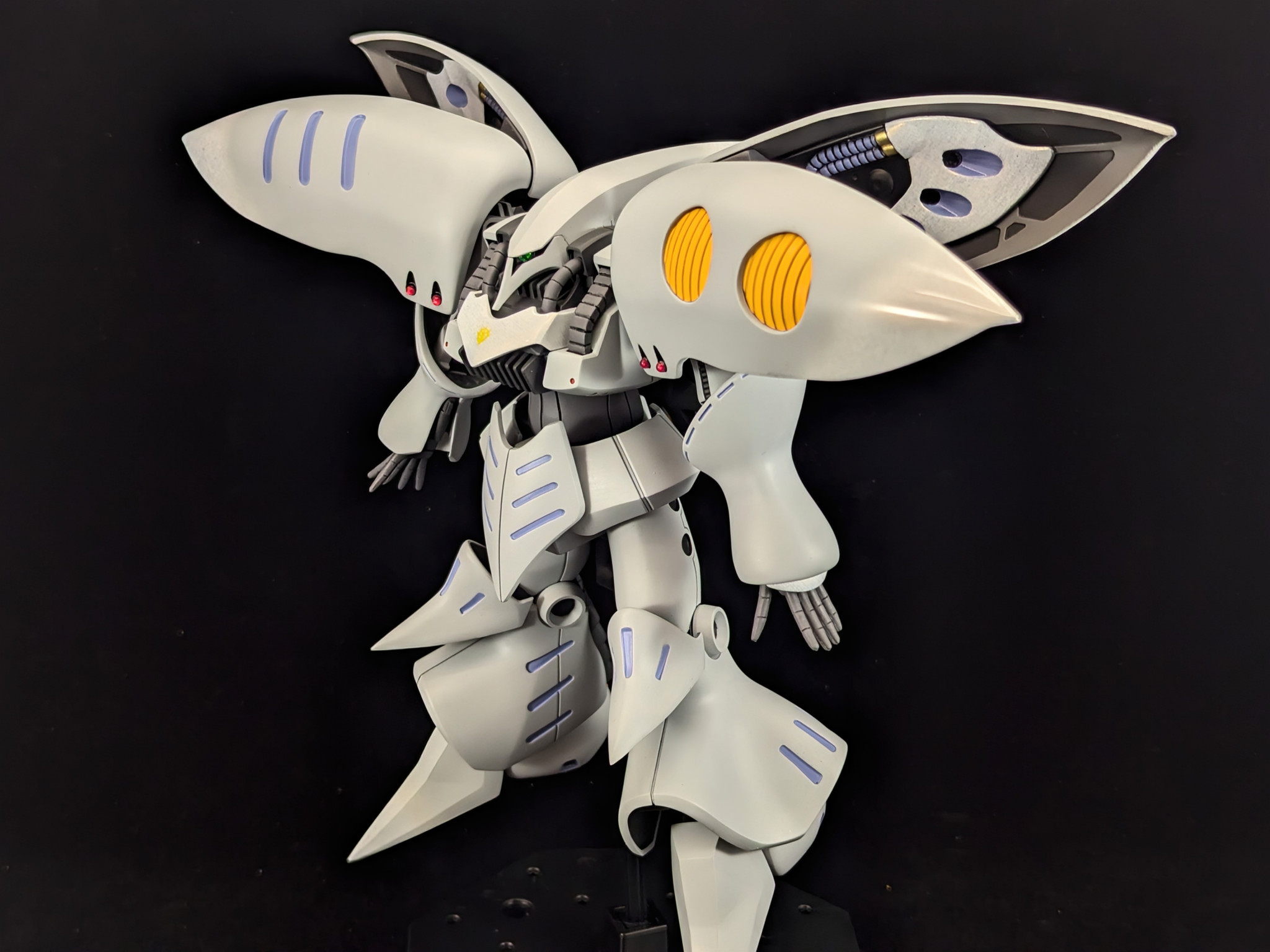 カラー配色はキュベレイのメカデザインをされた永野護氏が描かれたイラストの配色を参考にしつつ、一部白色部分をホワイトカーボン調に塗装し、ちょっとでも見応えあるようにしています(gandam-hand2)