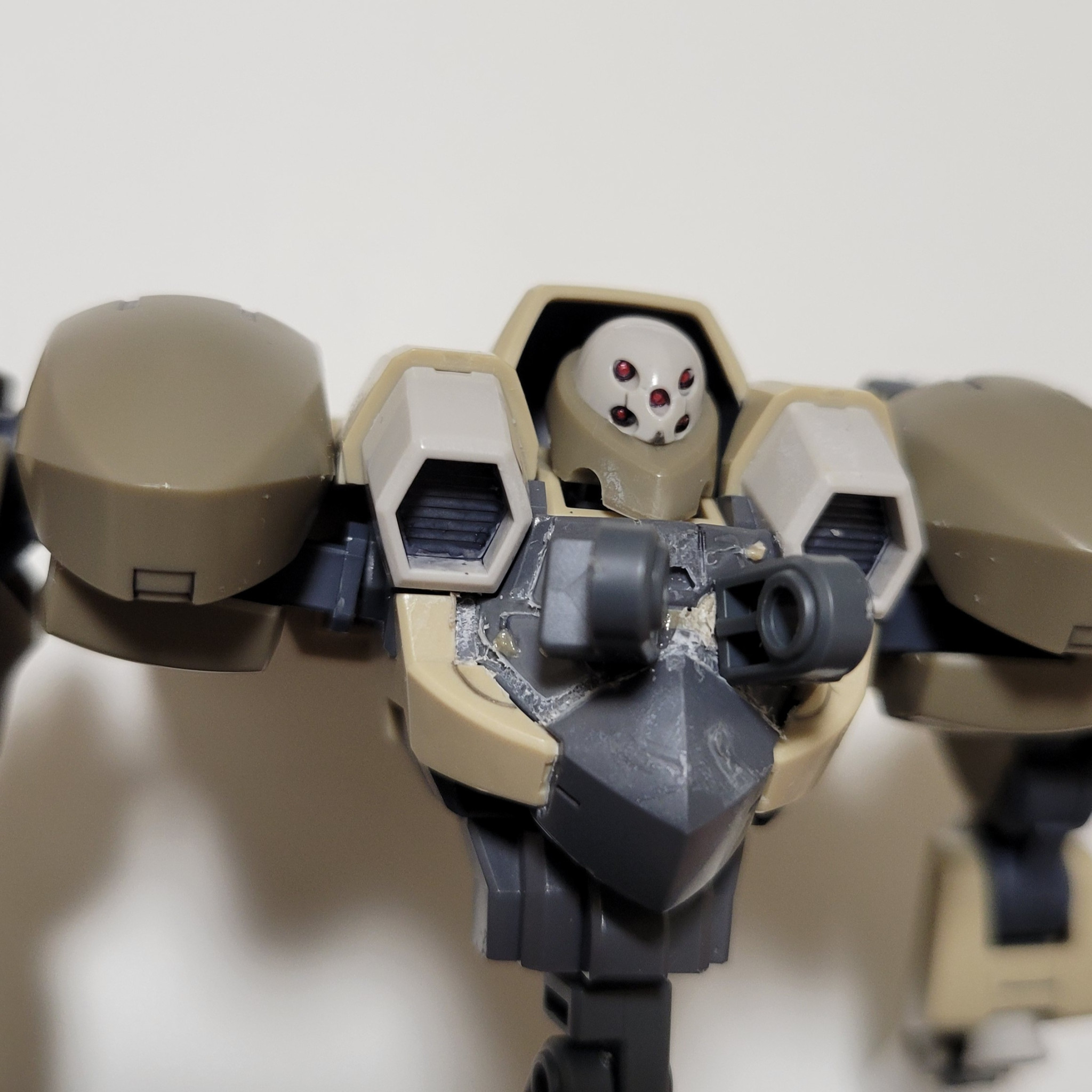 胸部。じつはここの部分、無理に改造してたら胸カバーがどこかに吹き飛びまして…直すのもこれまた面倒なのでアームアームズのジョイントを3㍉で穴あけしてアロンで接着いたしました。それと上の完成写真のもここのは塗装してません。剥き出しです(笑)。