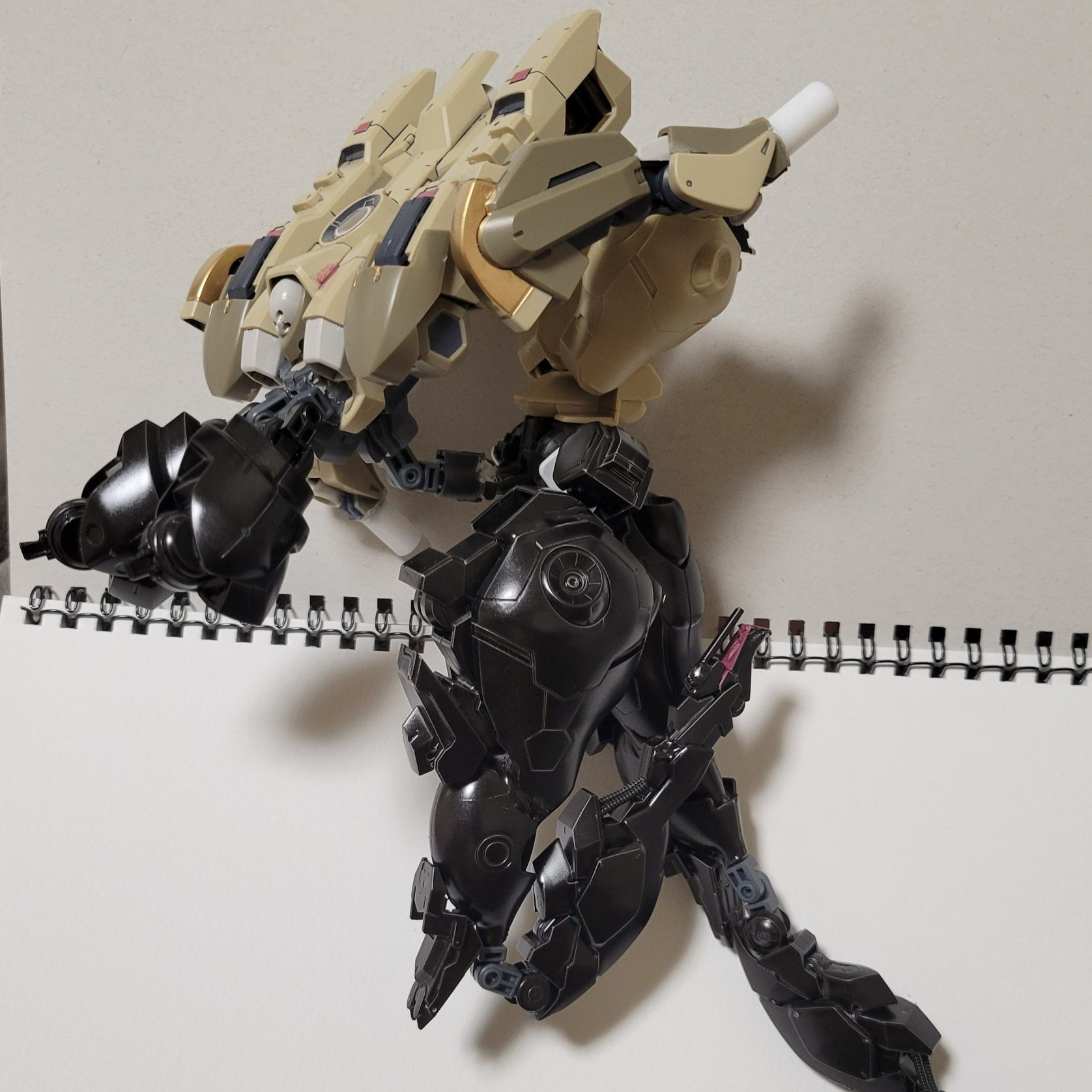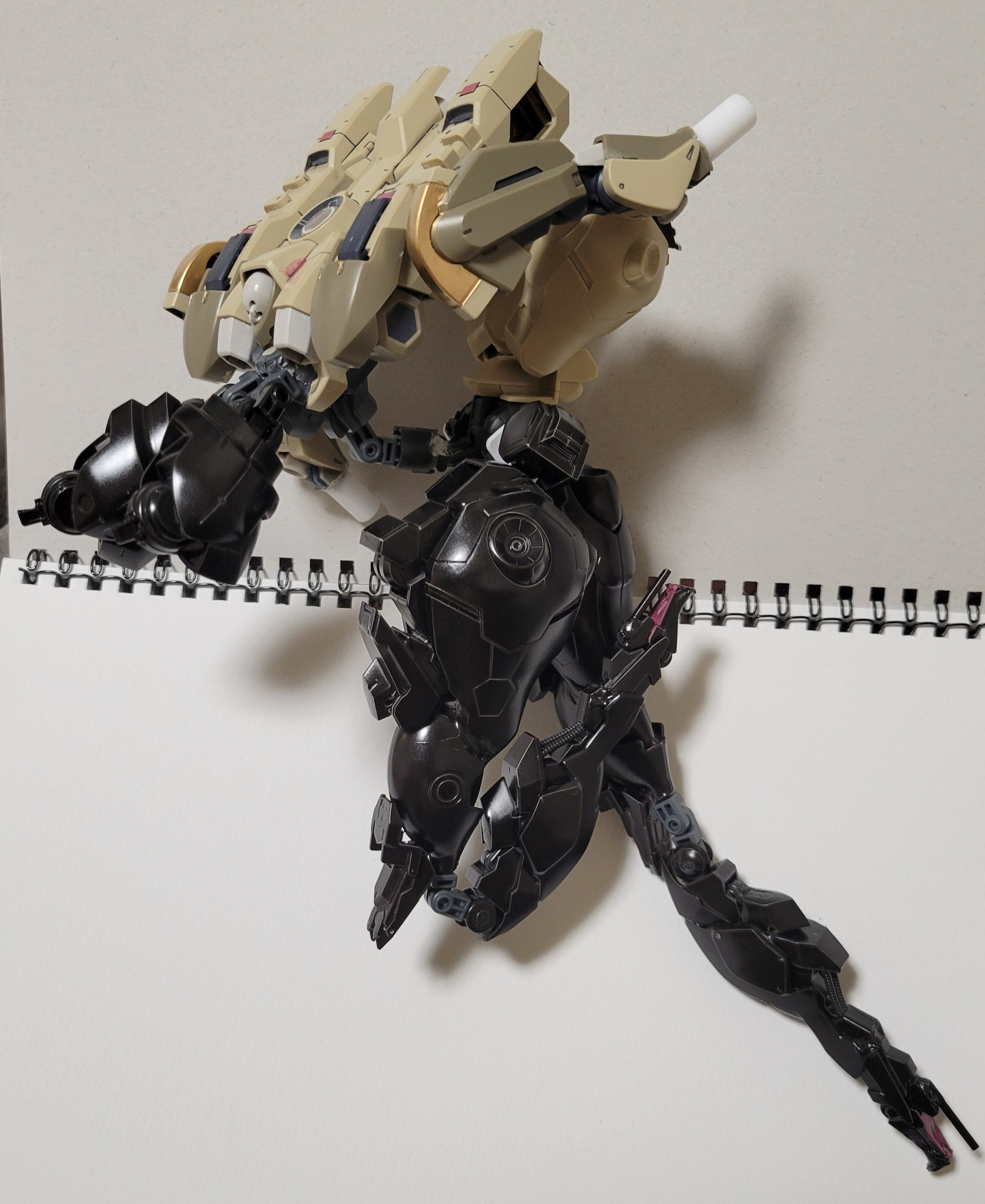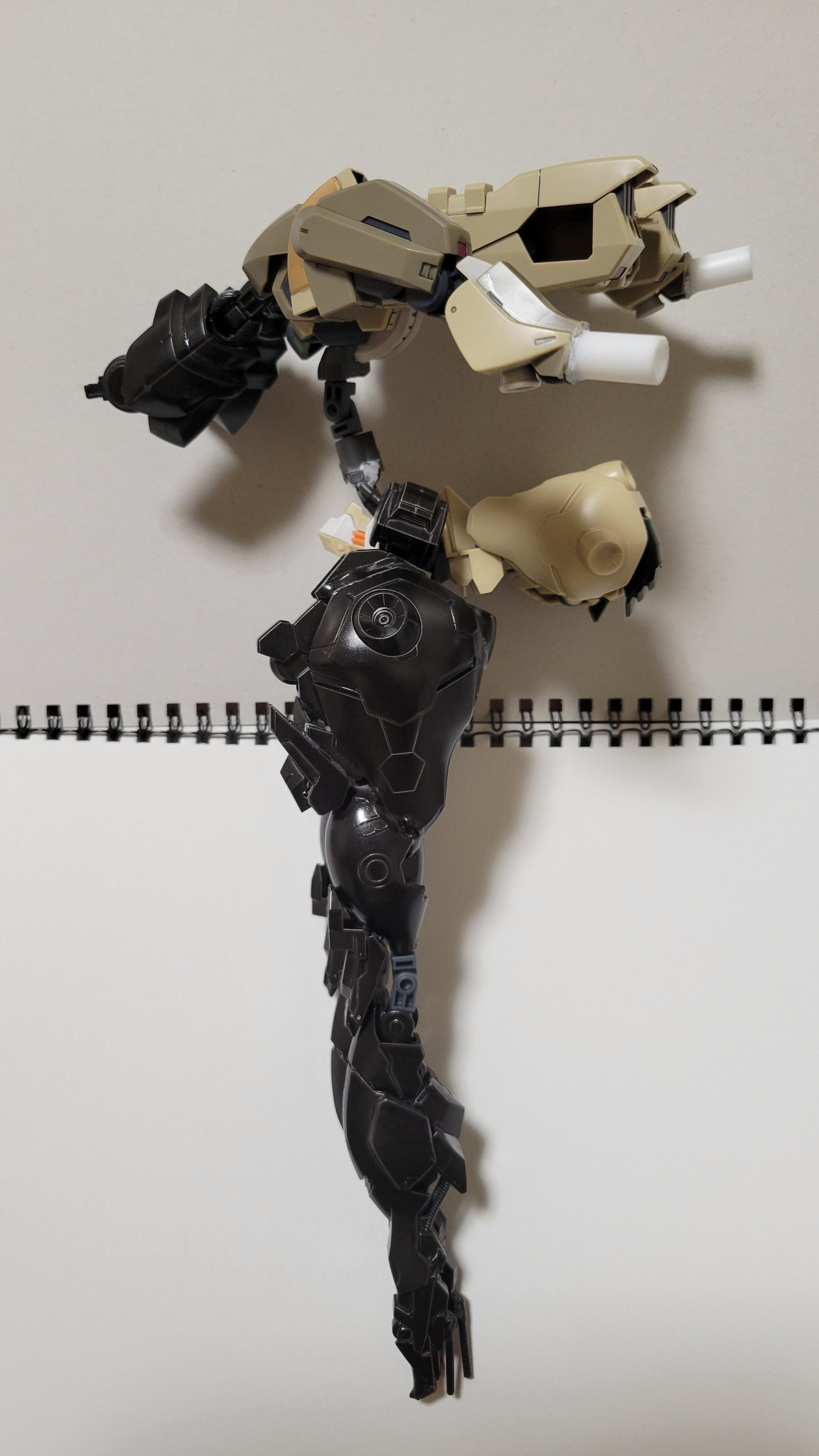 どうも、土緑です。今回は部屋にあった百里をベースに改造したオリジナル機体を紹介いたします。それと一つ…今回の作品は全体的に関節が緩いのでスケッチブックに寝かせて撮ってます。ご了承ください。