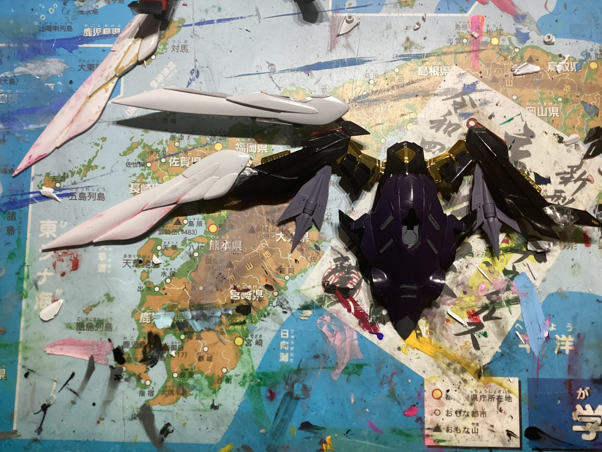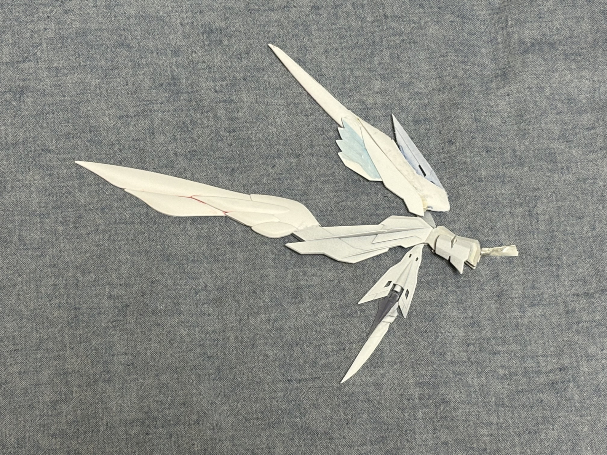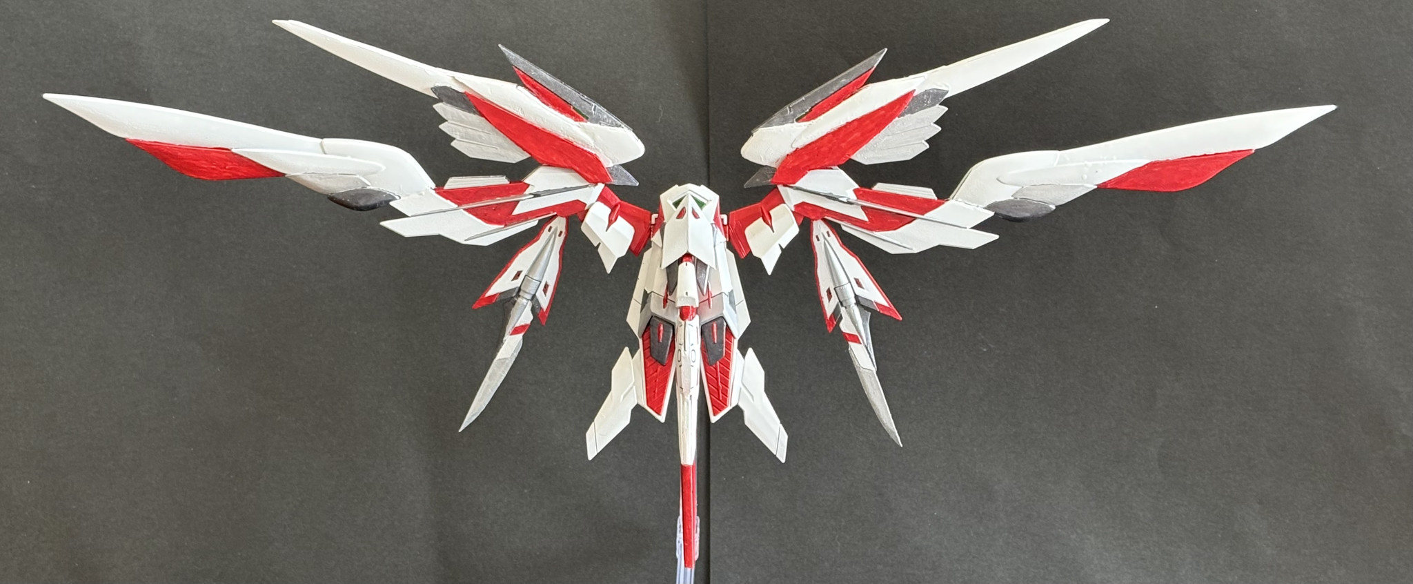 ベースはRGゴールドフレーム天のバックパック、マガノイクタチの代わりにRGウイングゼロEWの翼を2枚づつ装備、尾翼はRGデスティニーから拝借。マガノシラホコはナイフ状に改造し、後はあれこれジャンクを貼り付けてでき上がったものがこちらになります。