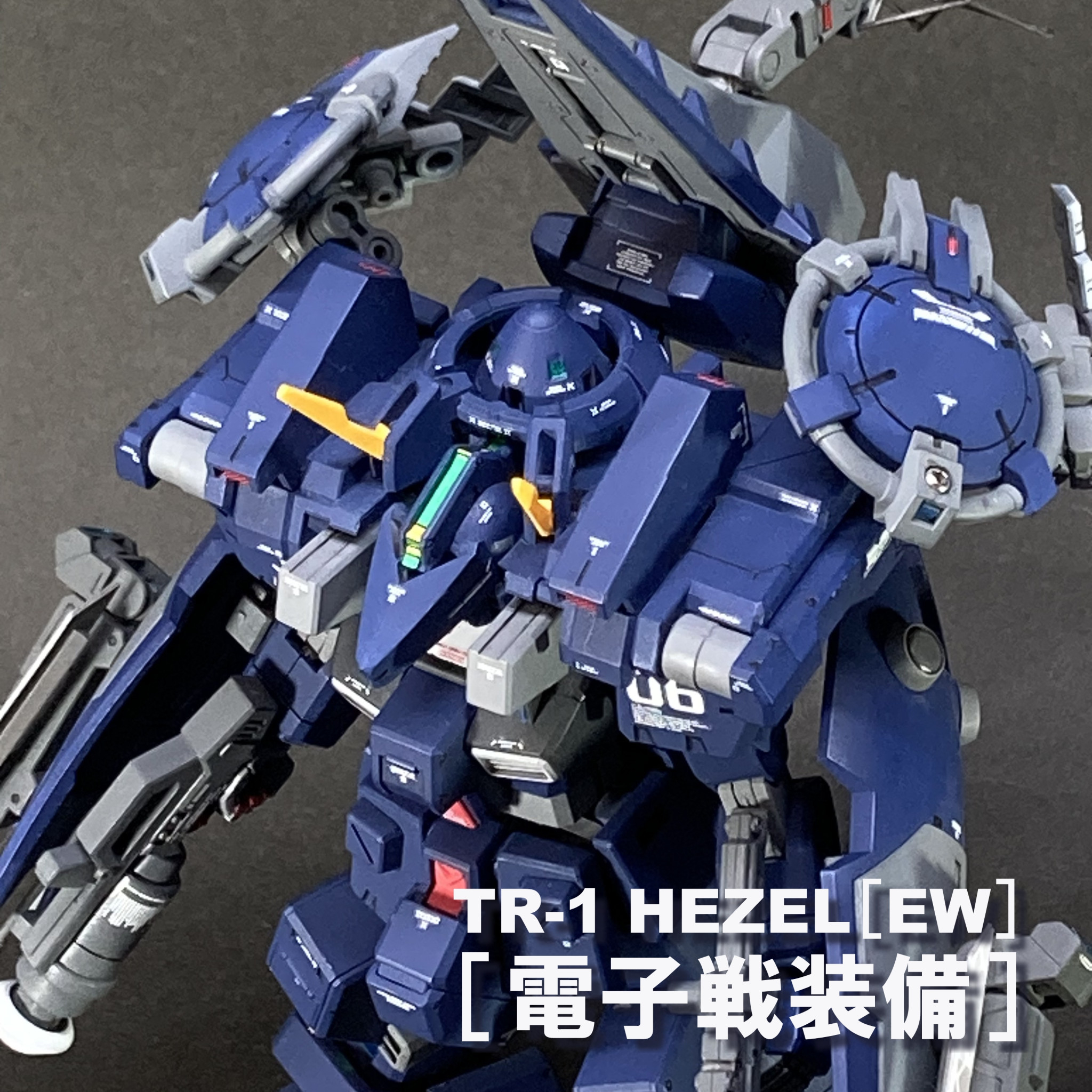 TR-1ヘイズルの電子戦装備機を製作しました。〔EW〕と言えばEWACジェガンなど偵察・索敵を行う機体が有名で、その場合のEWはEarly Warning And Controlの略ですが、このヘイズルの〔EW〕は電子戦(Electronic Warfare)の略です。