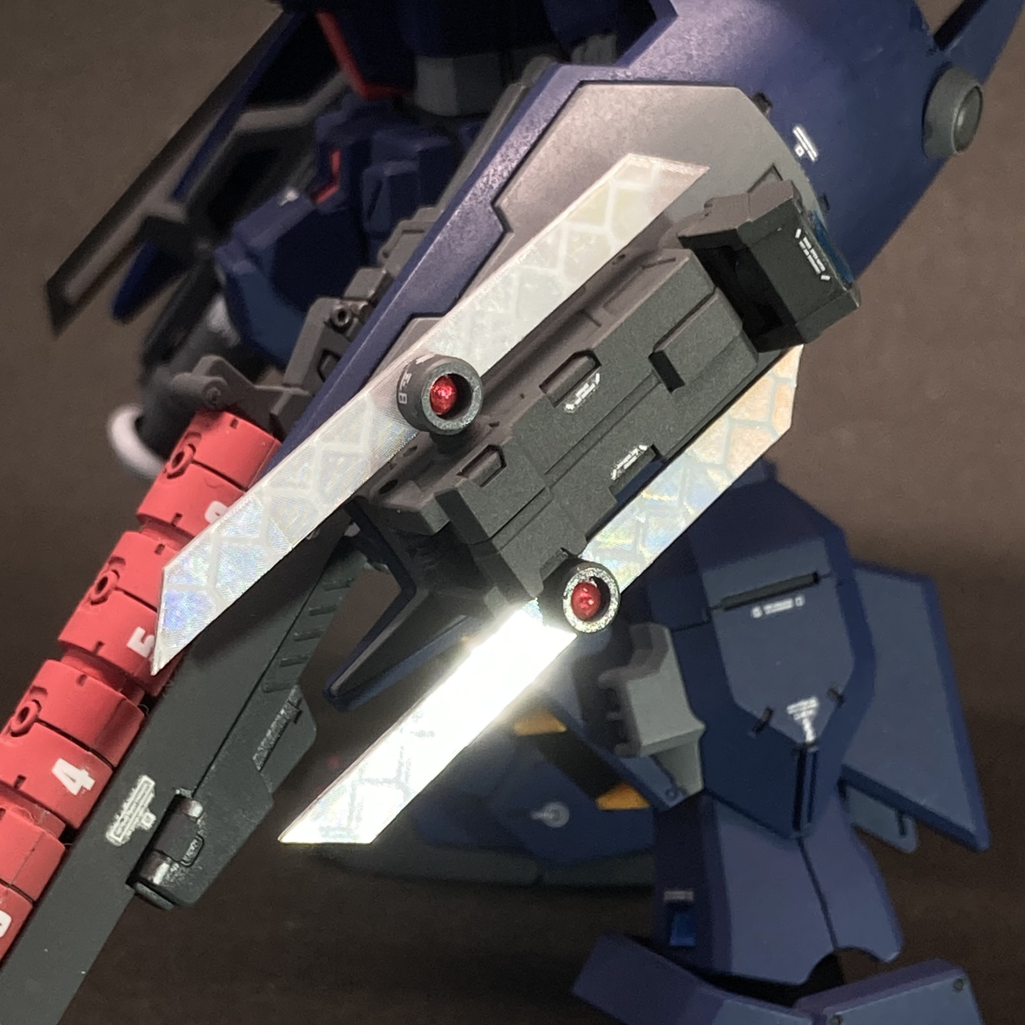 なお、現用のジャミング装置は航空機でも艦船でもこんな形はしていませんが、そこはロボットアニメ的な見栄え、ということで・・・。ちなみに、ギラッと光るブレード部分は自転車に貼る反射シートを使っています。