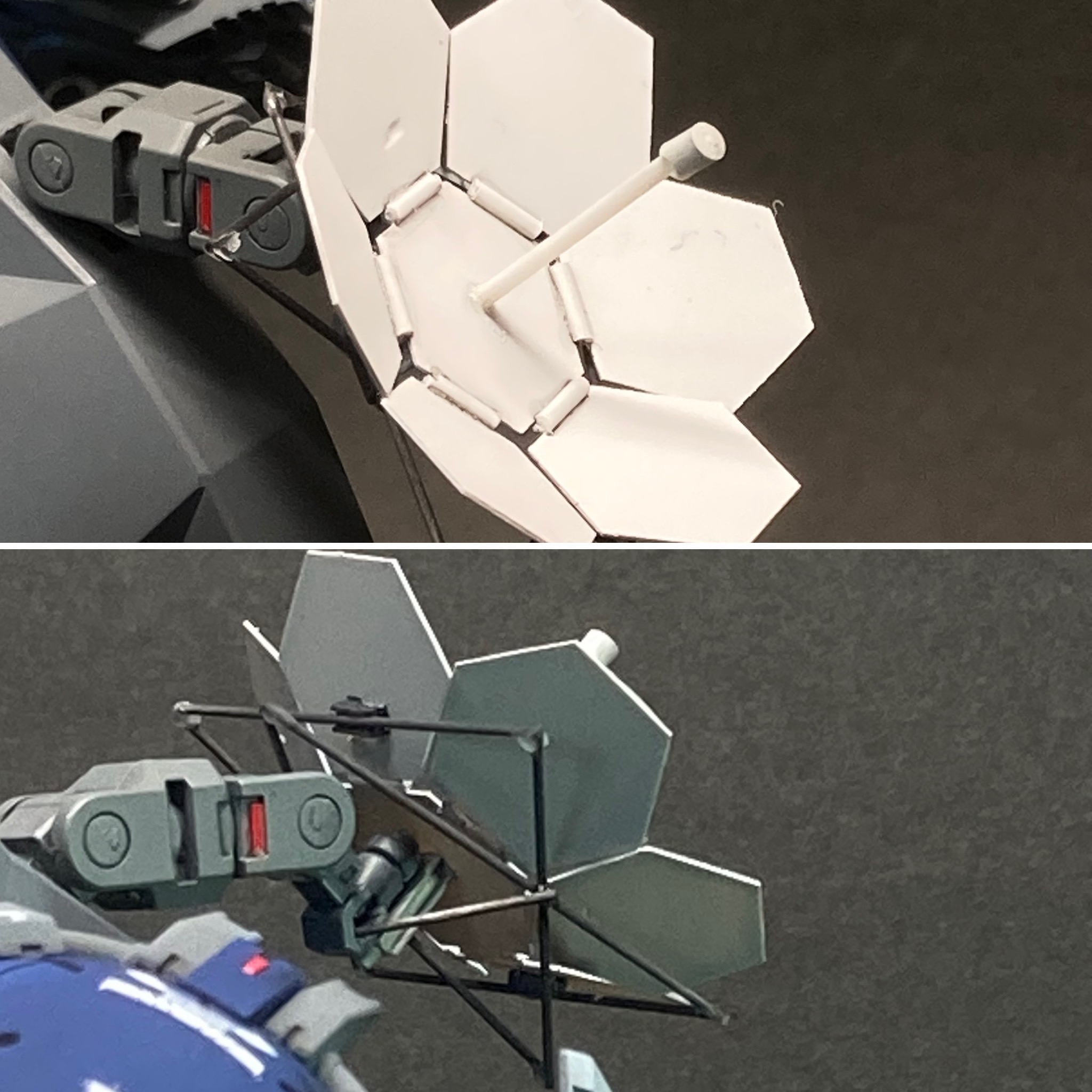 六角形プレートは0.3mmプラ板からの切り出し。実際には折りたためませんが、それっぽく見せたくて、裏面の折りたたみ用フレームをジャープペンシルの芯(0.5mm)で作りました。