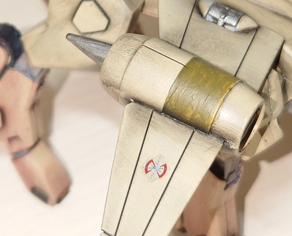 ミサイルポッド装備 関節部は、シルバーに塗装 ウエザリングはリアルタッチマーカーのグレー3で汚してます 脚と胴体の下部は更にレッドとイエローを重ねて、砂塵汚れを演出 これでいいのか?