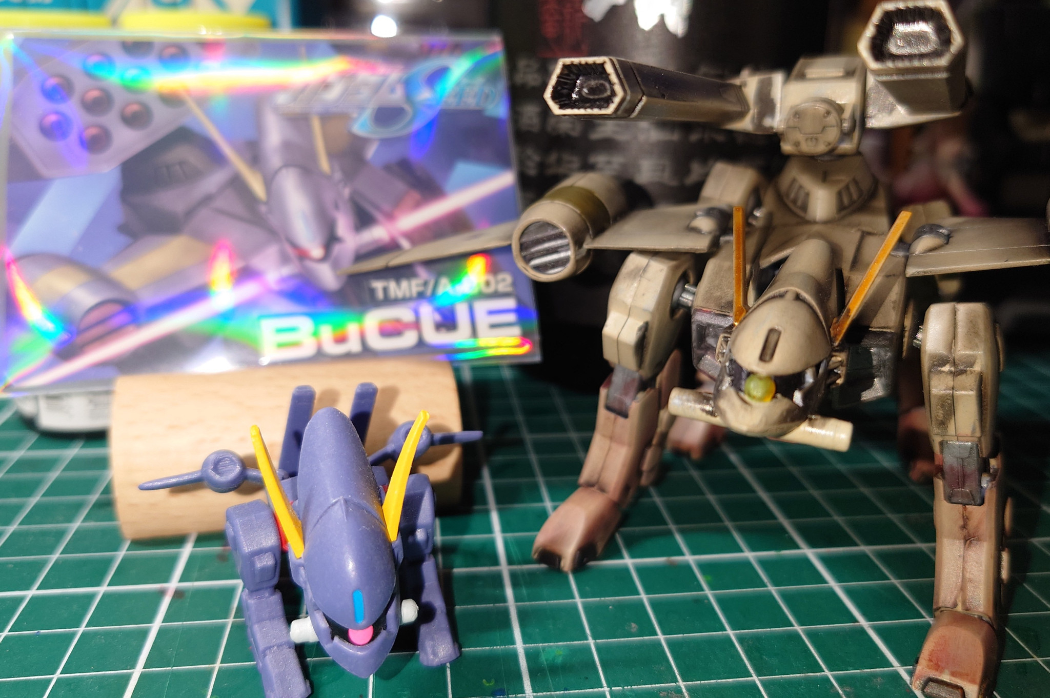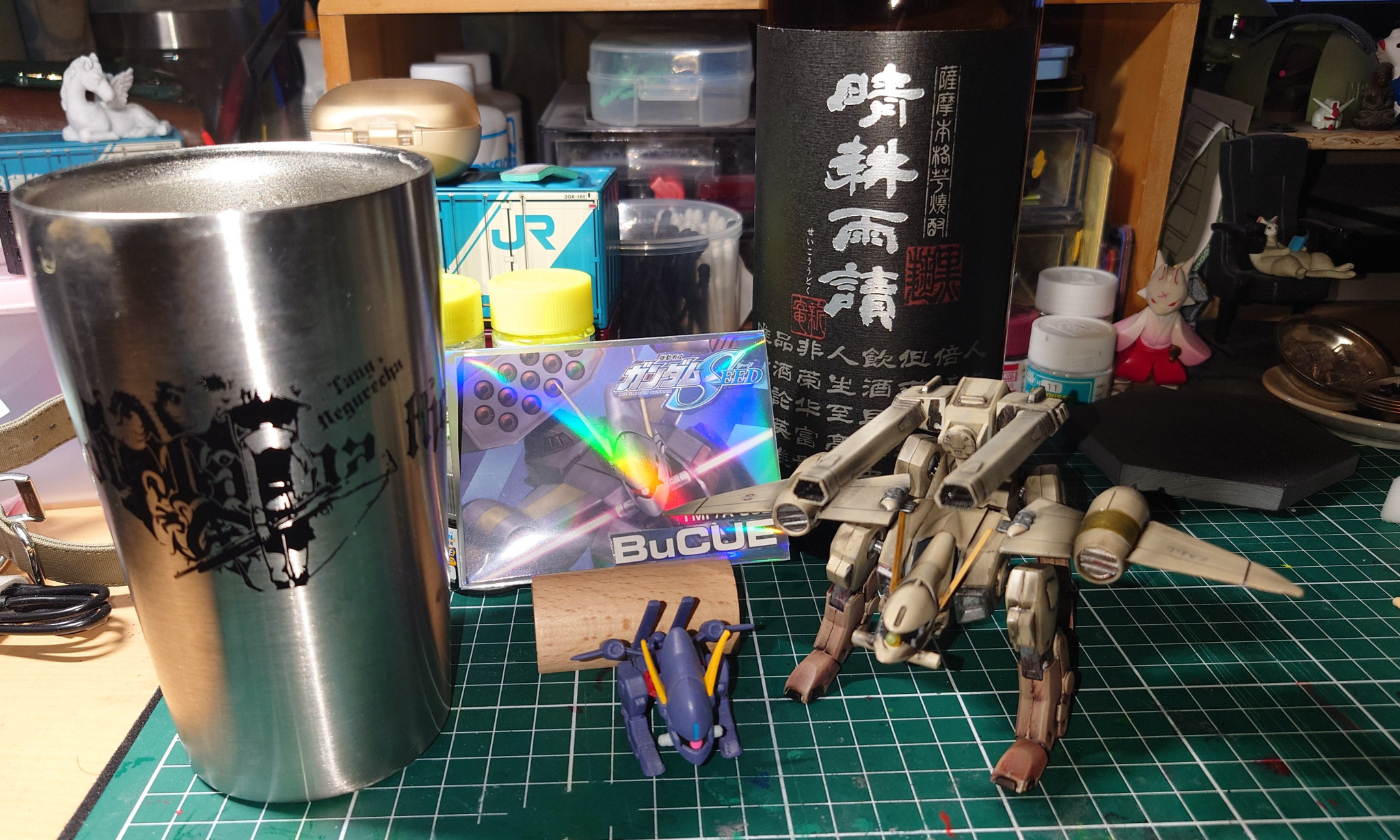 完成した砂漠仕様の偵察型バクゥを眺めながら、焼酎お湯割りで乾杯 待ちぼうけのバクゥもいますよ 焼酎は芋の「晴耕雨読」 口の中に広がる香りがたまらんですよね