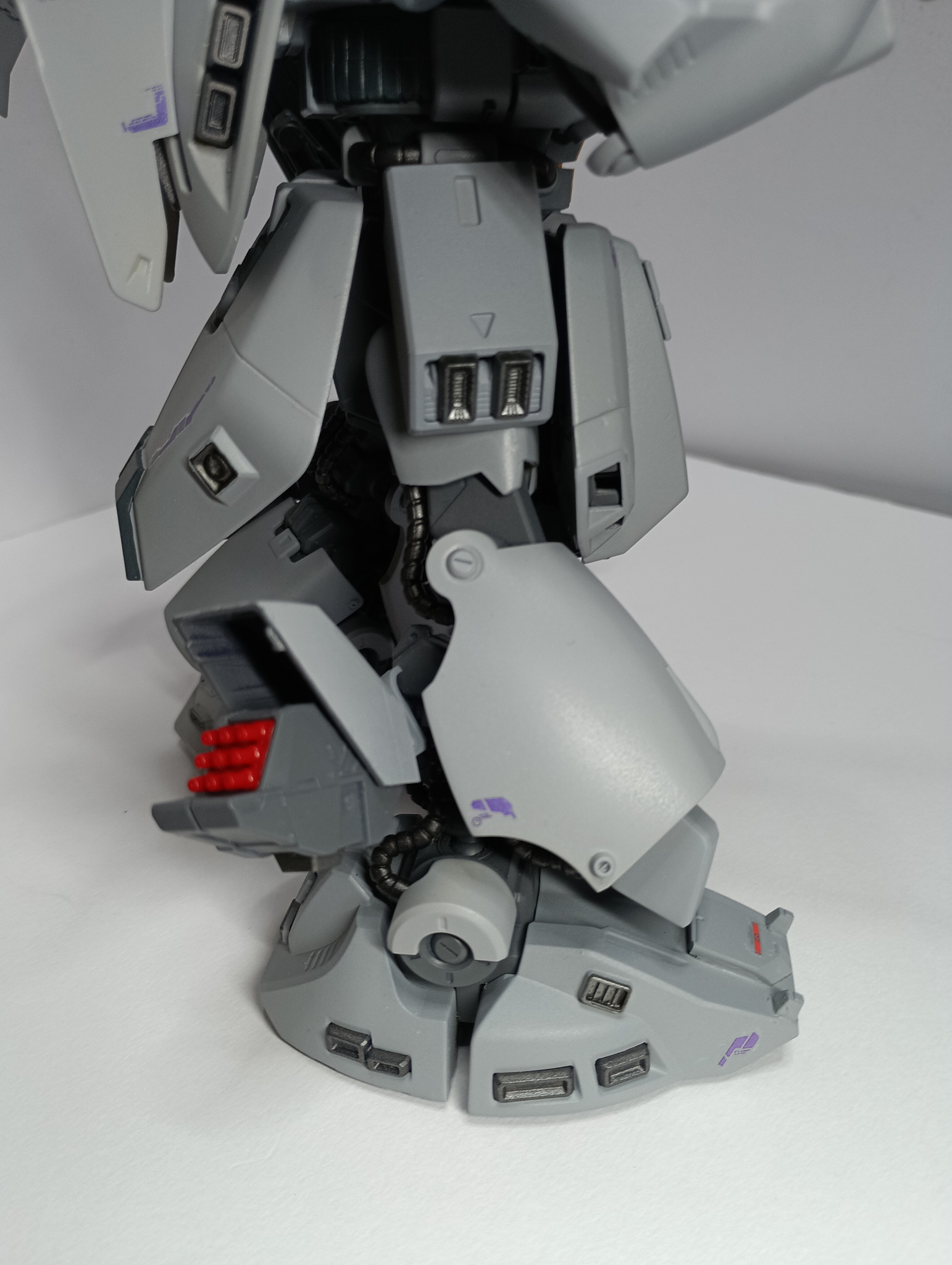 主な改造点は、各所にパーツの貼り付け。太ももを4.8mmほど延長。サザビーの腰部を移植等を行っています。