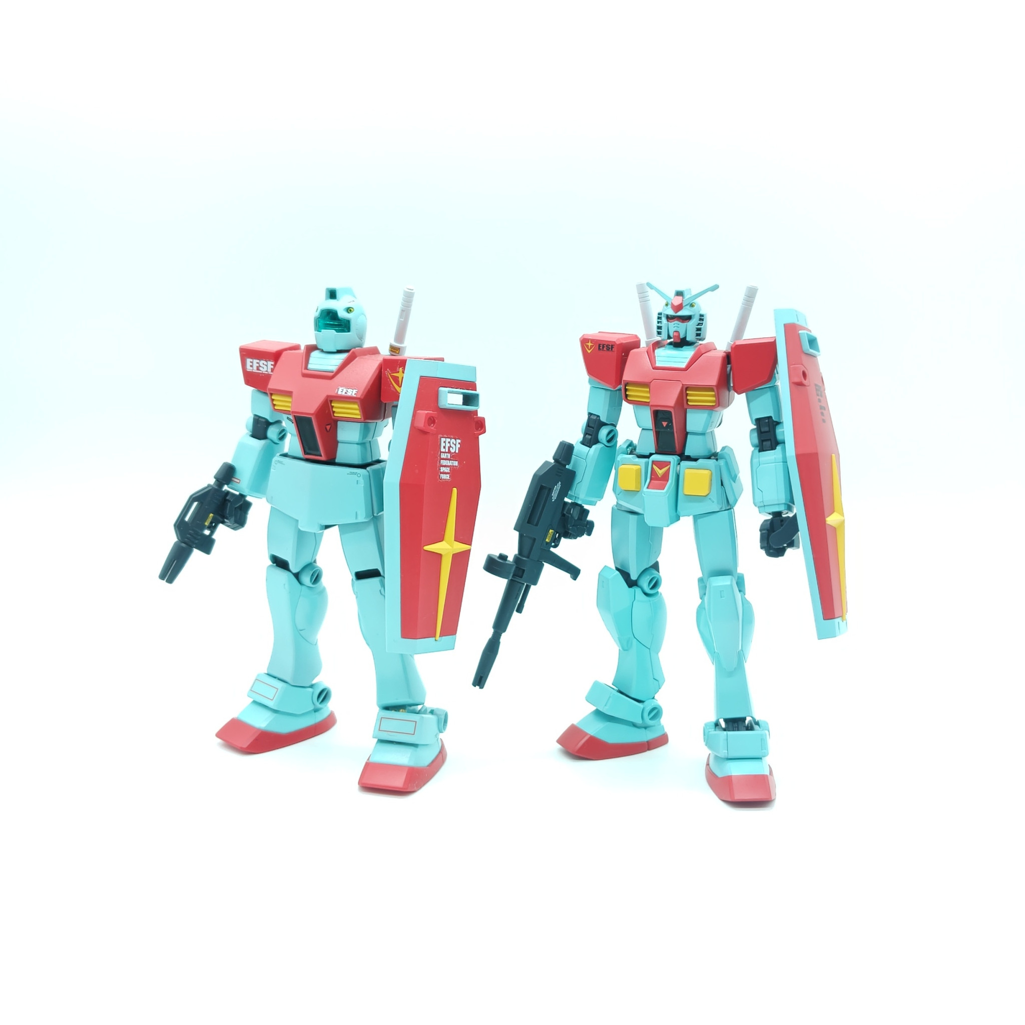 GMの生産ラインでGUNDAMを生産する際のコスト等検証の名目で、少数ながらも前線へガンダムを欲するエースへ供給するために生産され苦し紛れに監査やらを誤魔化すためにGMカラーに塗られたガンダム…という妄想で製作しました。