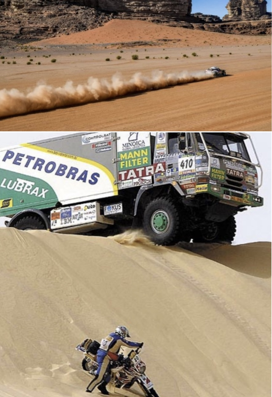 ジオラマのイメージを膨らます為に色々資料を漁りインスピレーションを受けたのがこの写真です。「砂煙を巻き上げ爆走」といったら「パリ-ダカール・ラリー」が真っ先にに思い浮かびました…その中でもこのトラックとバイクの対比とアングルが目に止まりました。