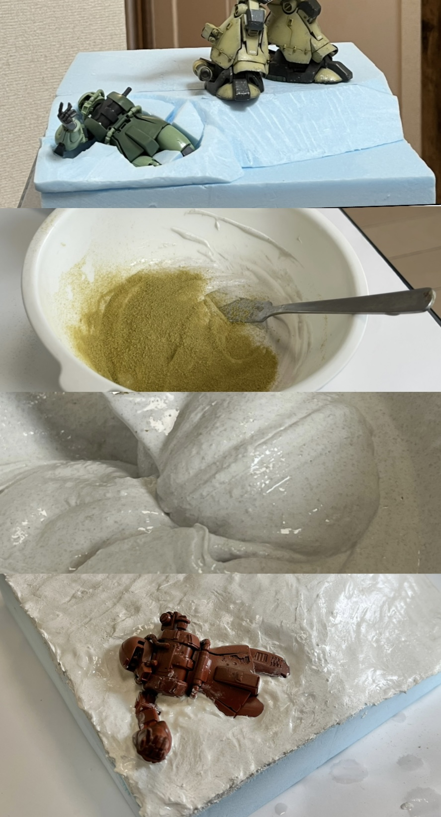 ジオラマベースの制作です。スタイロフォームを切り出しMSの配置や高低差を決めたら木工ボンドを表面に塗布し乾く手前で壁補修材(石膏)と鉄道模型のパウダーを混合したのもをバターナイフで左官の様に塗布します。石膏の水分がかなり多い為、乾燥するとひび割れが発生します。そのヒビ割れを補修するのと砂漠の様に表面を滑らかにする為今度は指を使って表現を被りながら再度、石膏を塗布して行きます。