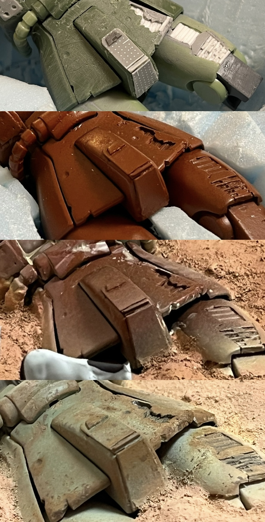 ザクのダメージ加工です。装甲が剥がれている箇所はニッパーでカットしてプラの角材等で装甲下地を表現しました。全体的に荒めにサンディングしピンバイスで弾痕等を表現してます。錆び付きはタミヤのウェザリングマスター「錆」を使用してます。