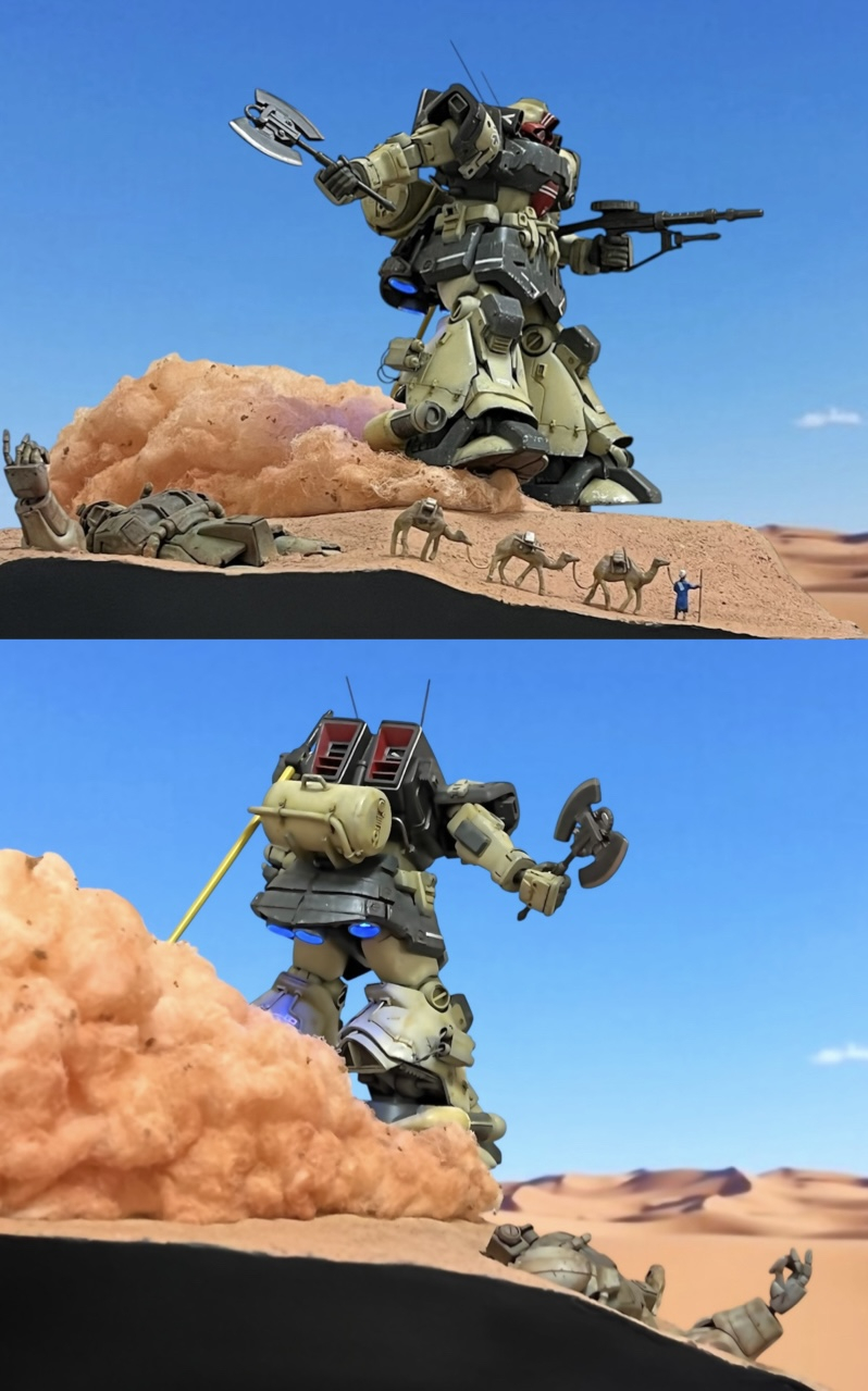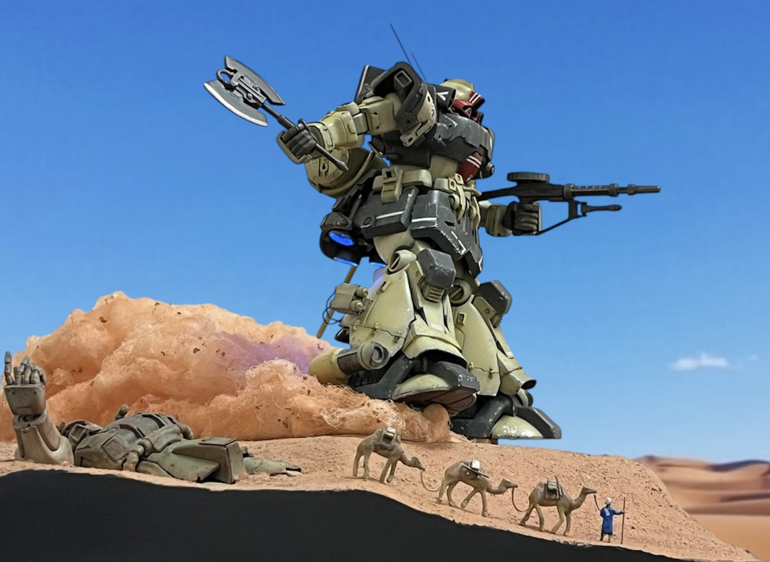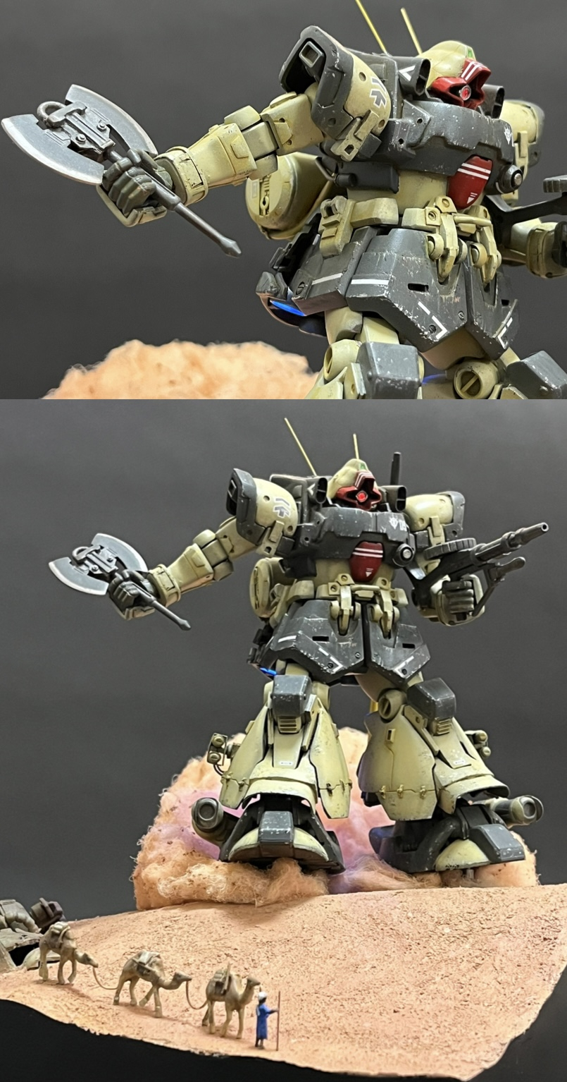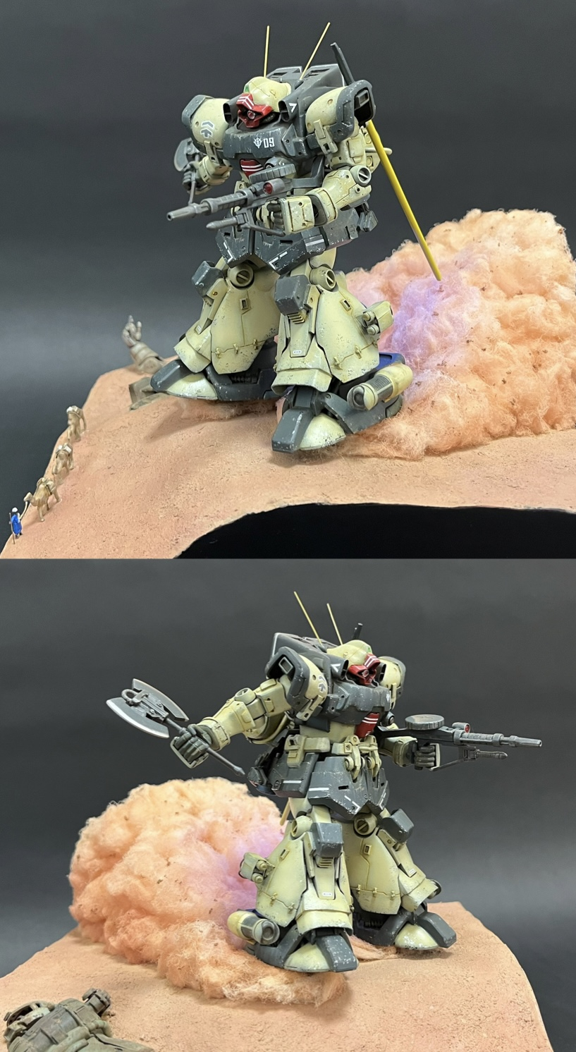 足元の浮遊感、砂煙、スカート裏のバーニアの炎によりドムらしい疾走感を上手く表現出来たと思います。手前のラクダキャラバンが現実感を与えジオラマに臨場感を出す事が出来たと思います。やはりフィギュアを添えるとジオラマは良くなります。