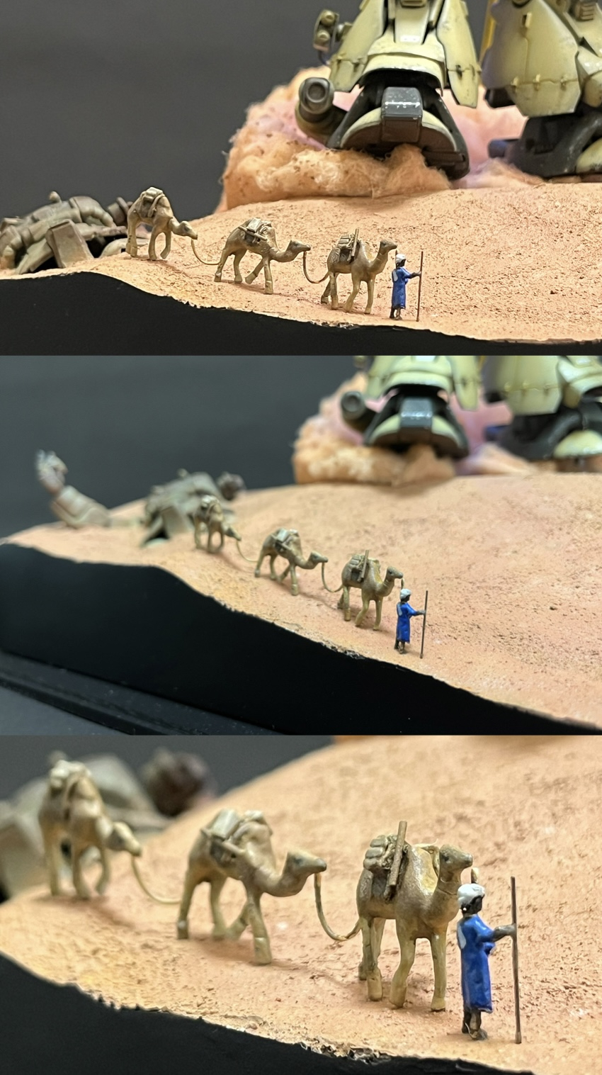 こだわりのラクダキャラバンです。コレも資料見まくってなんとか馬をラクダに変身させました💦ドムとの衝突コースです…。果たしてこの子達の運命は如何に💦