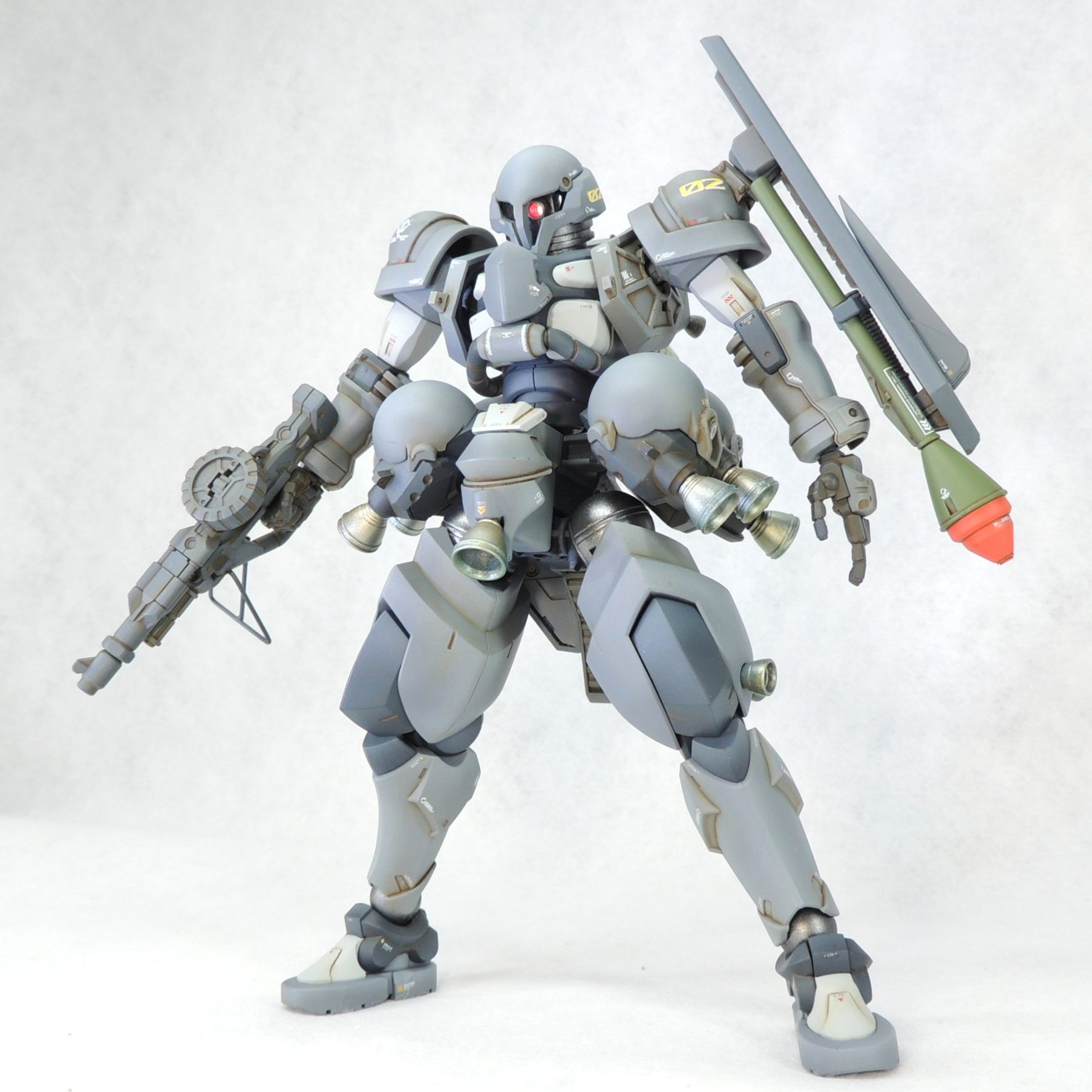 グレー2色を基調とし、ニュートラルグレーⅡや金属色をちらばめて、色数を減らすことによりミリタリー感を高める工夫をしました。シュツルム・ファウストにレッドとグリーンを用いてアクセントとしています。