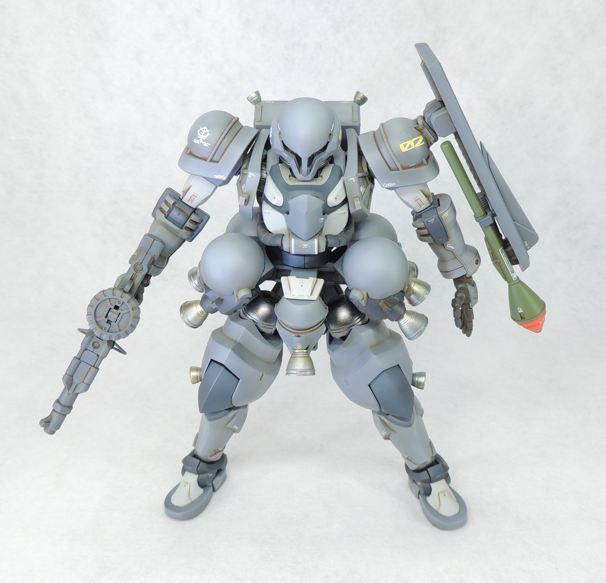肩及び二の腕はザク(GQ)のパーツを使用し、前腕はヅダのキットから流用しました。当初は宇宙世紀正史の「旧ザク」を意識して肩アーマーを右肩のみとしていましたが、製作途中でデザインを変更し、両肩にスパイクの無いアーマーを取り付てみました。左肩には巨大なシールドを装備し、白兵戦用の2本のピックはヤスリで先鋭化しています。シールドの裏面は、凹凸モールド入りプラ材でディティールを追加して情報量を上げています。