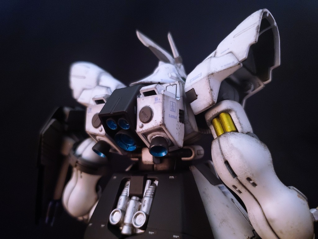腹部粒子砲、各バーニア、ファンネル、プロペラントタンク等がオミットされているシンプルな形状です。量産化計画で試験的に製造されたワンオフ機なイメージです。モノアイからツインアイになっています。