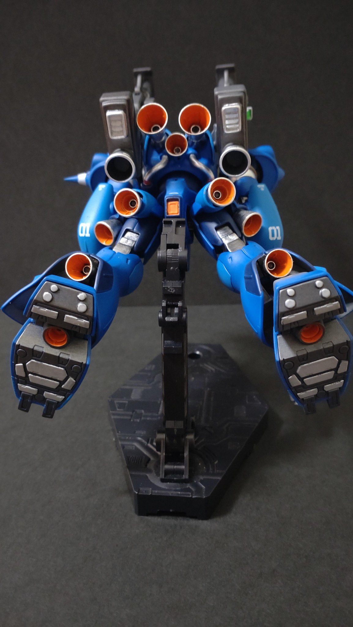 HG ケンプファー筆塗り全塗装で仕上げました。合わせ目消し、パーティングライン処理、モノアイHアイズ変更、スパイクシャープ化、バーニアの大型化、若干の墨入れをしました。メタリック塗装部分以外つや消しトップコートで仕上げました。
