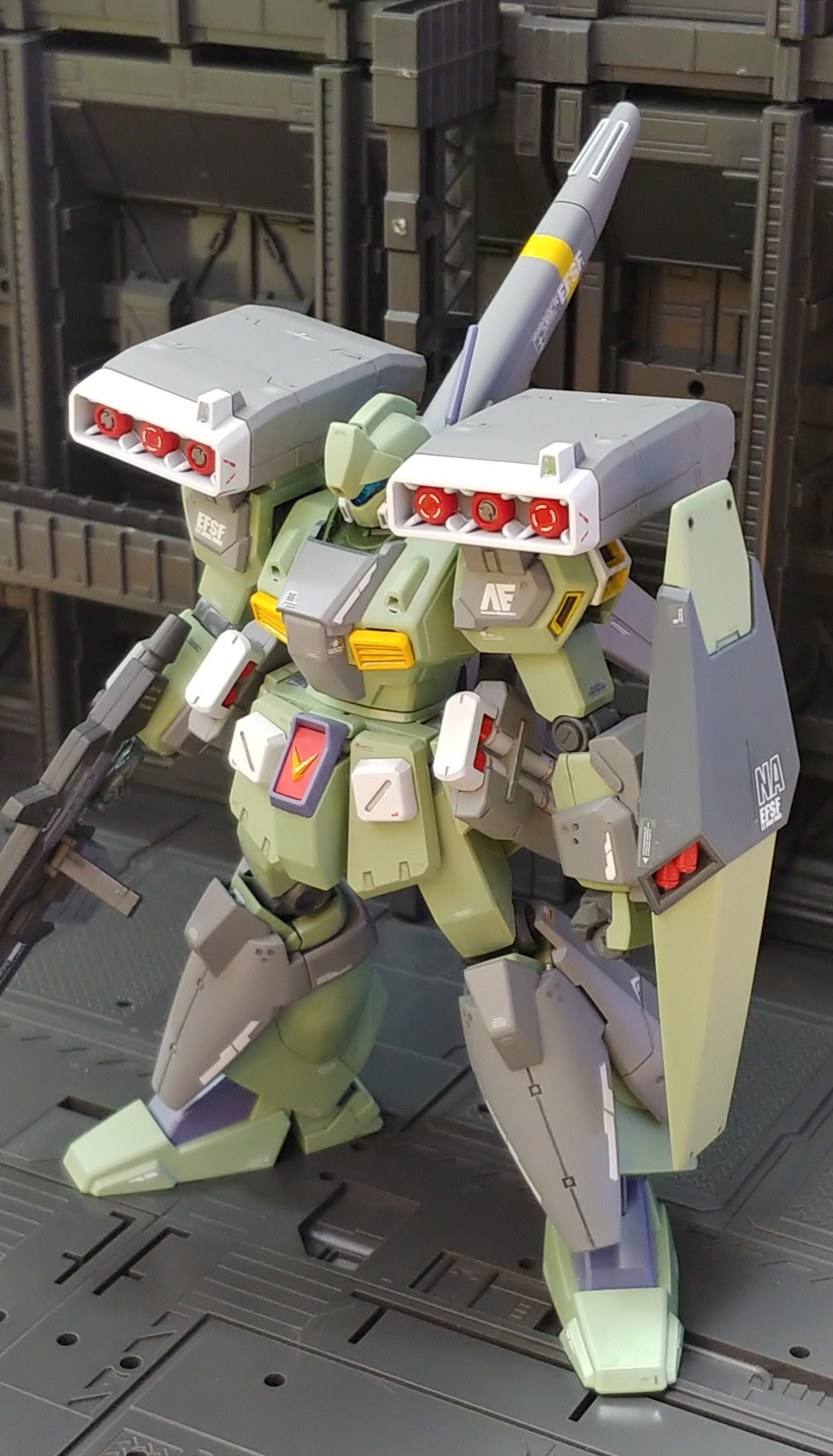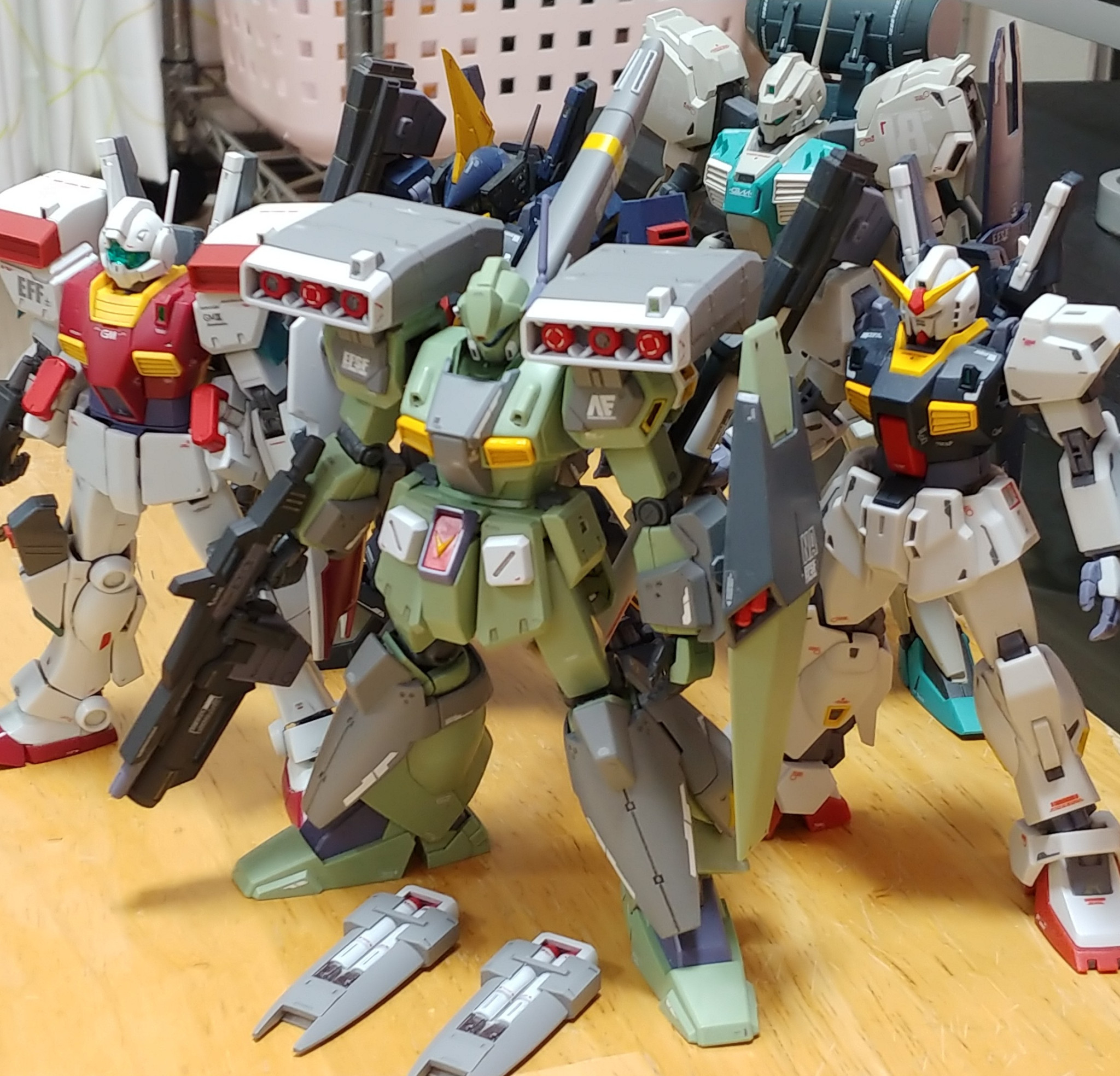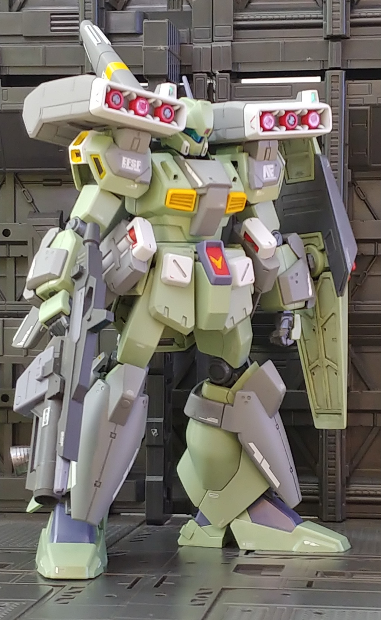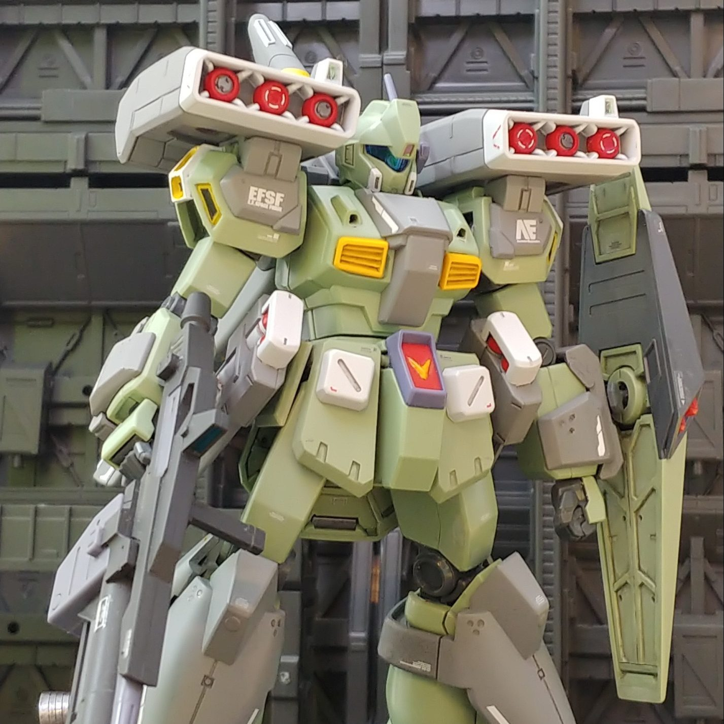 腰部のミサイルポッドはジム3、ビームライフルはバーザム改、フロントアーマーはパワードジム、胸部ダクトはジムクウェル、ミサイルポッド装着の腰部サイドアーマーは寒冷地仕様ジムから流用しました。マーク2やジム3、ネロなど連邦のMSの集大成というか寄せ集め感強くなったような…