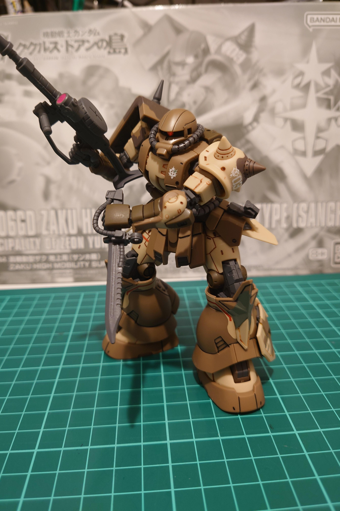 まずは、高機動型ザク 地上用( サンホ機)です。スミ入れ、デーカール貼りとツヤ消しトップコート吹いてみました😗