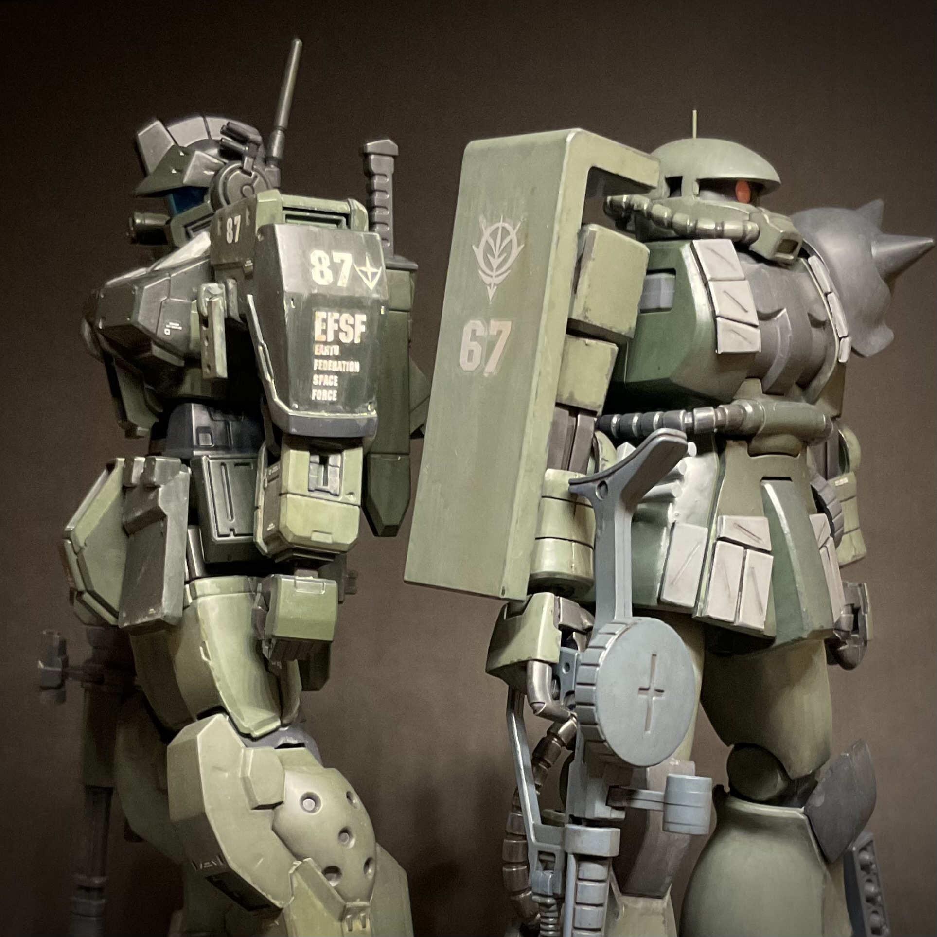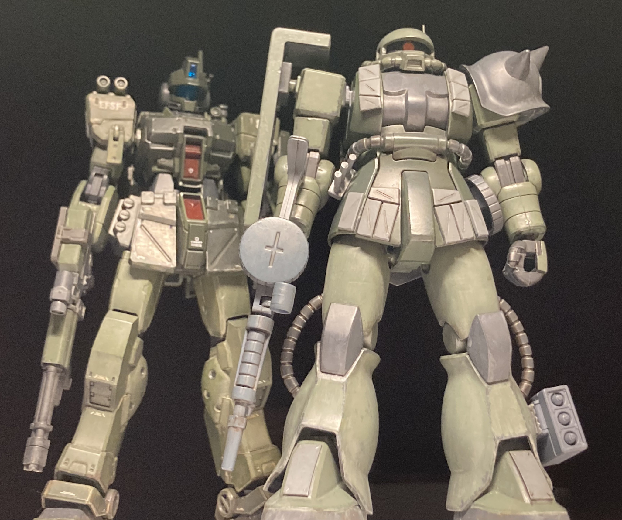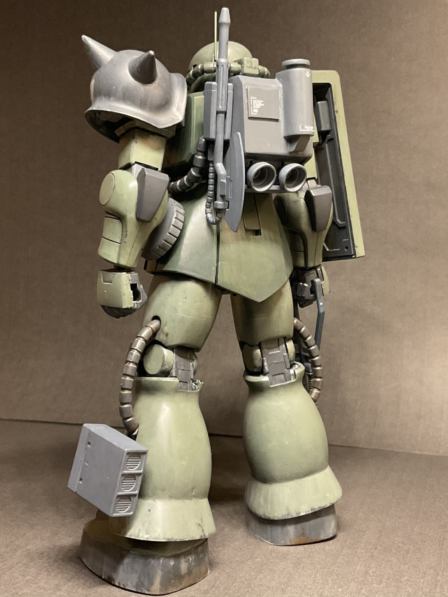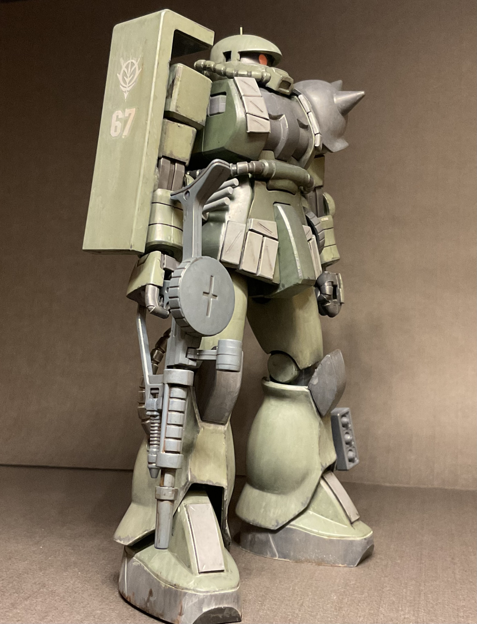 ジムスパルタンと身長を合わせるため、股関節らへんを3mm、大腿を3mmプラ板で延長。頭部は口を短くしてモノアイスリットを狭めてます。今回も筆塗りオンリーでウェザリングは強めに。