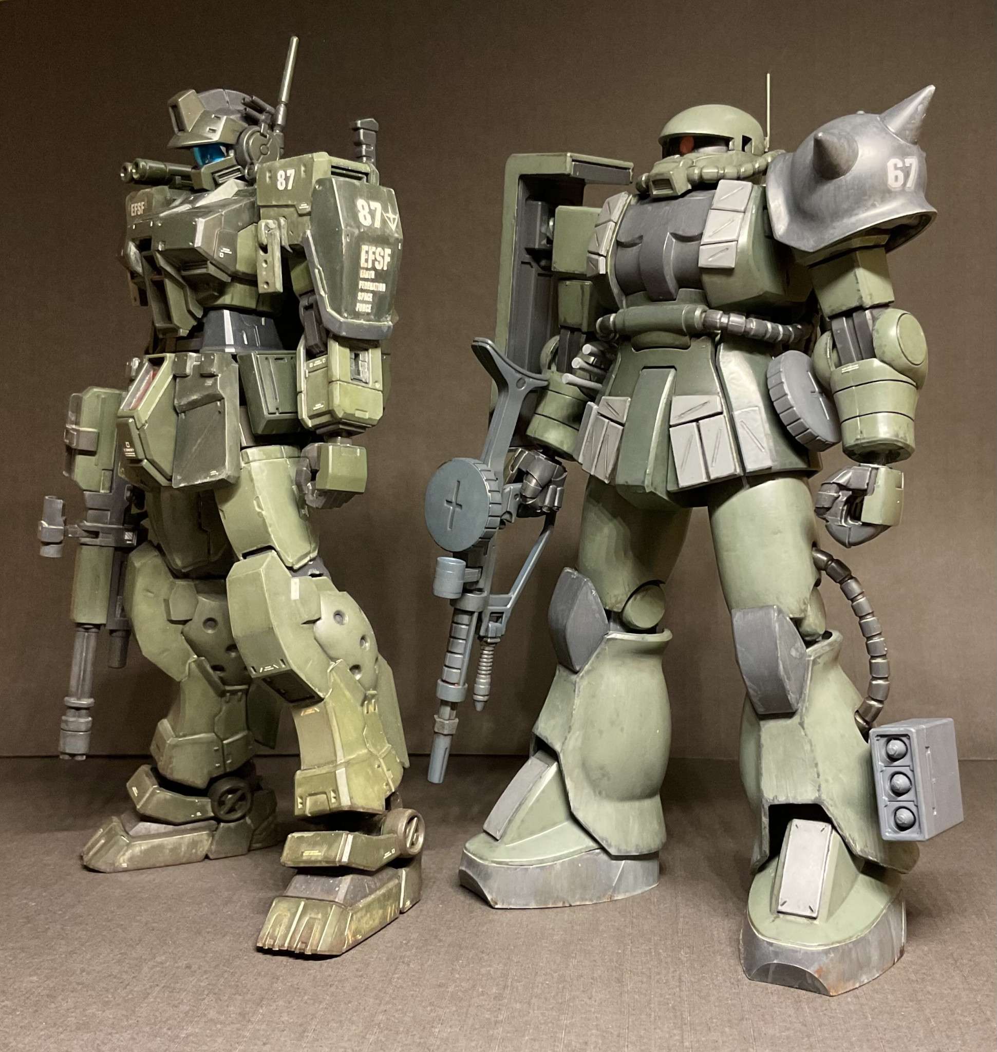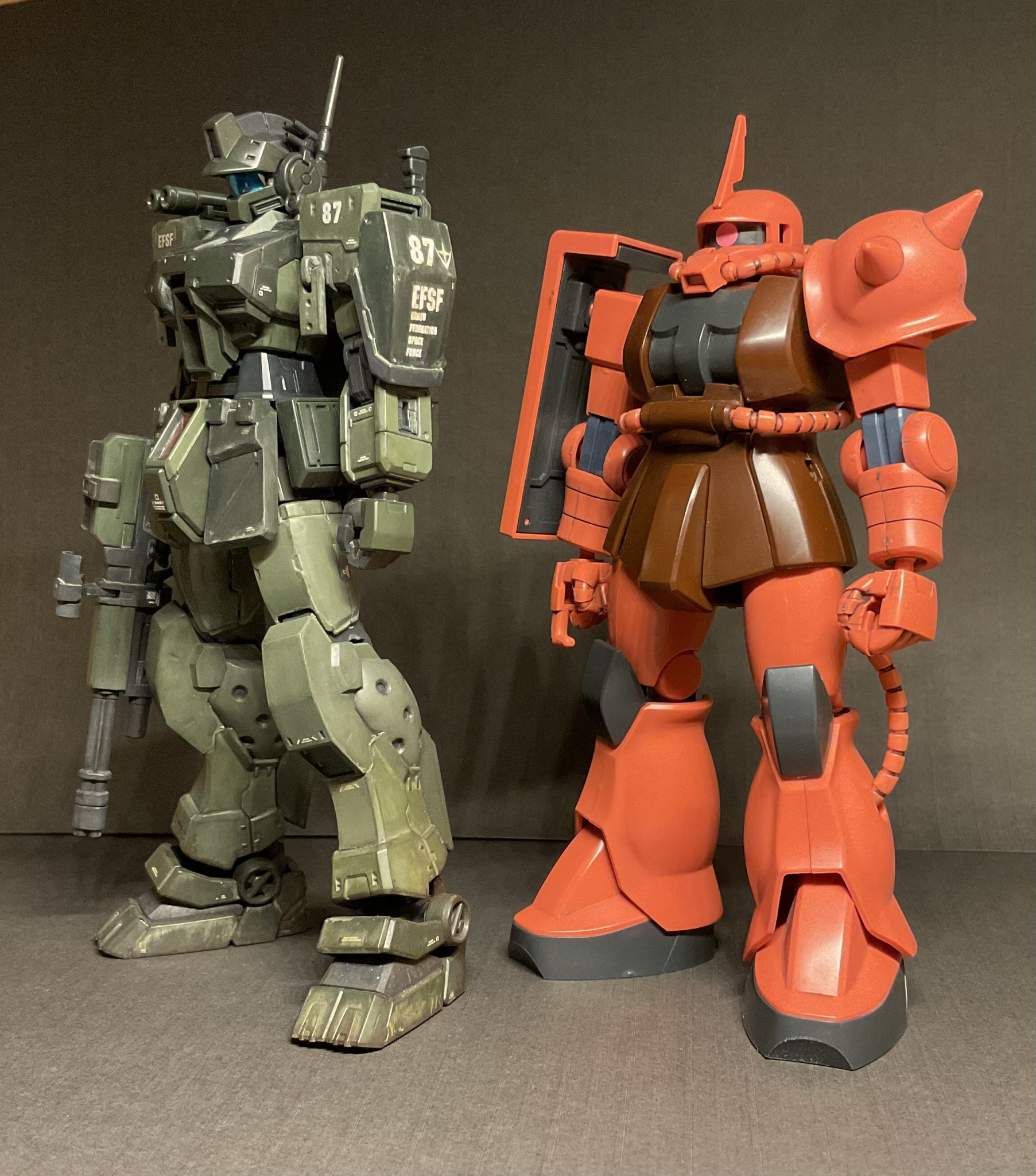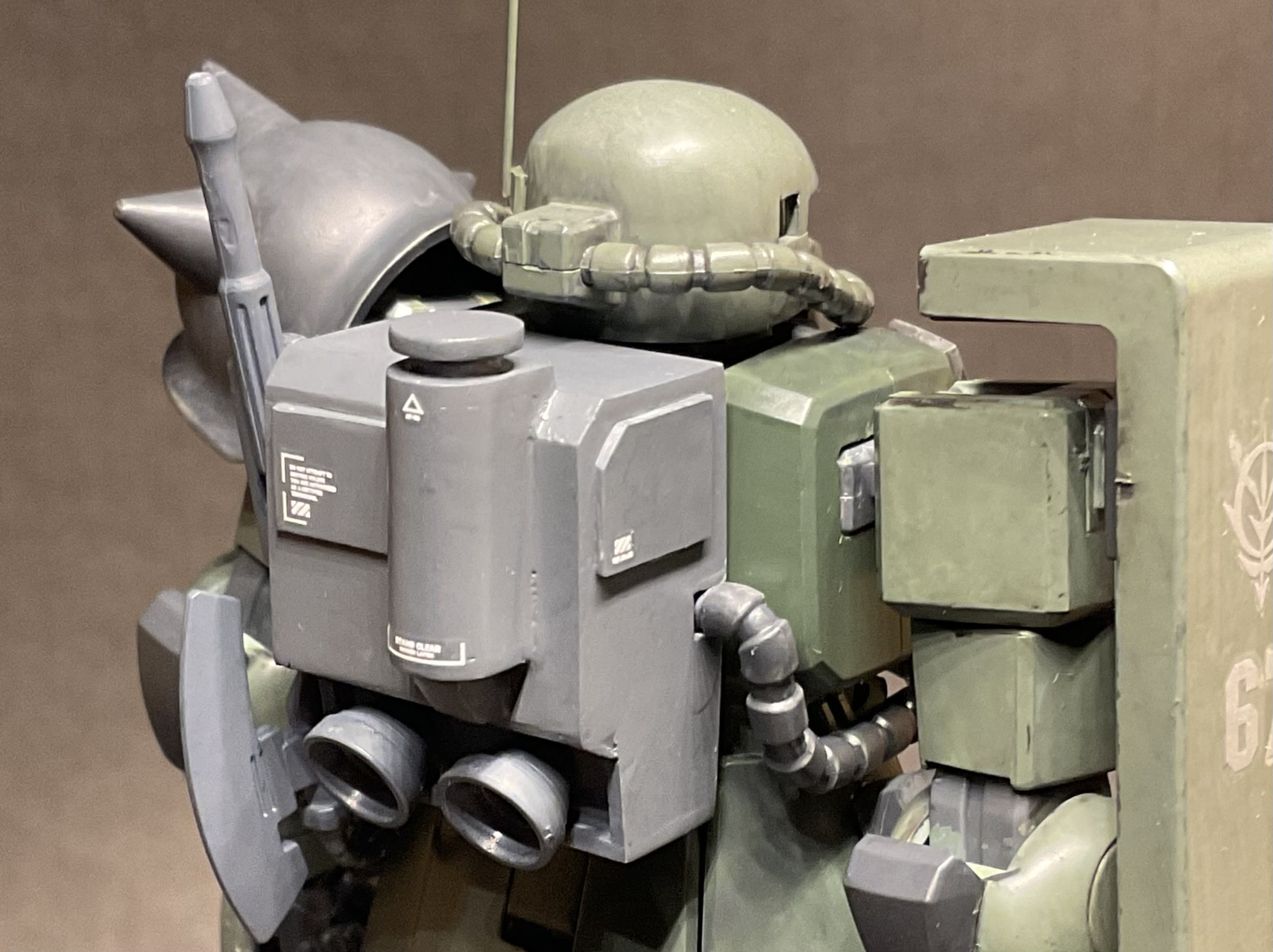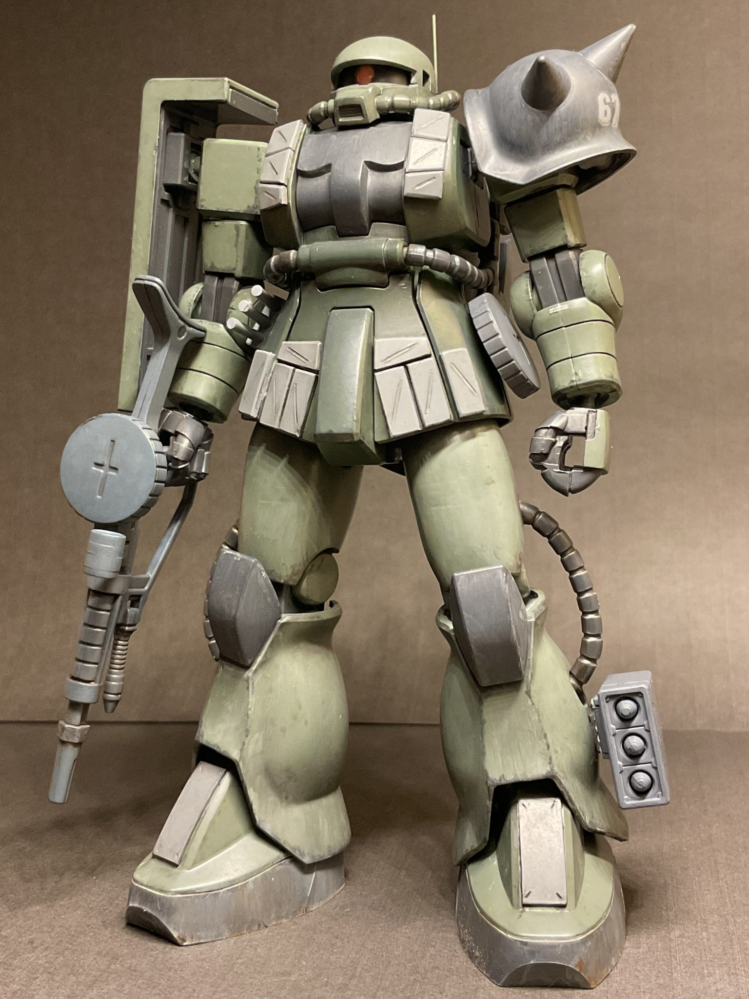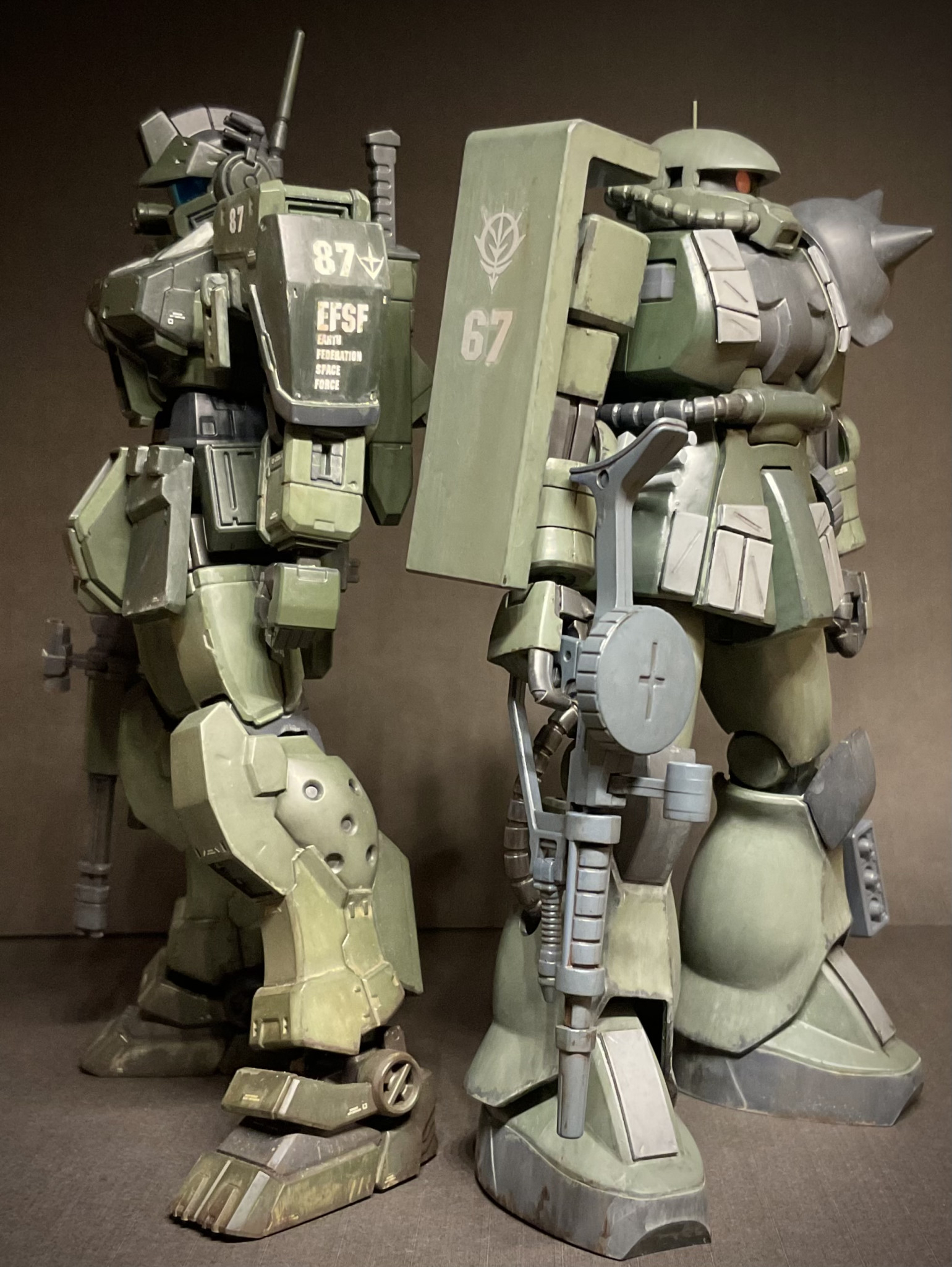 ジムスパルタンと身長を合わせるため、股関節らへんを3mm、大腿を3mmプラ板で延長。頭部は口を短くしてモノアイスリットを狭めてます。今回も筆塗りオンリーでウェザリングは強めに。