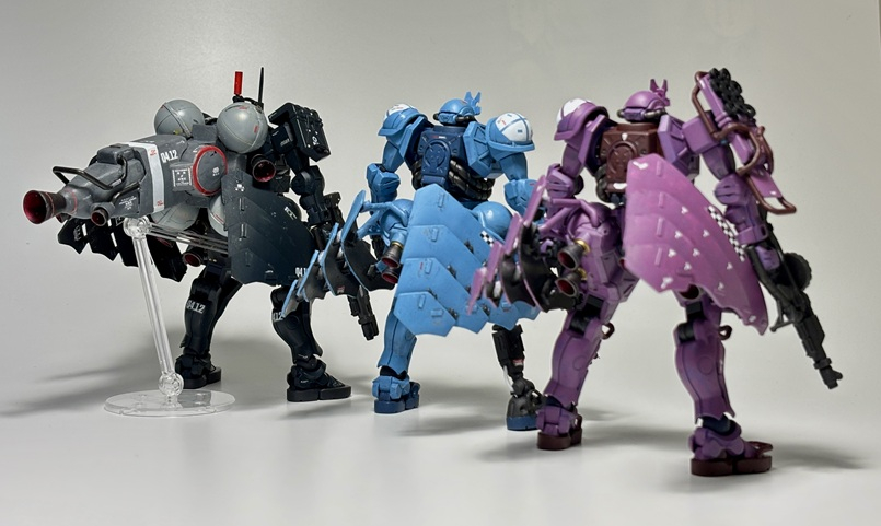 公式サイトのメカページに掲載されているGQザク/軍警ザクでキット化されていないものの自作はコンプリートです。あとは赤と緑のGQザクを素組みすれば完全コンプリートですね。