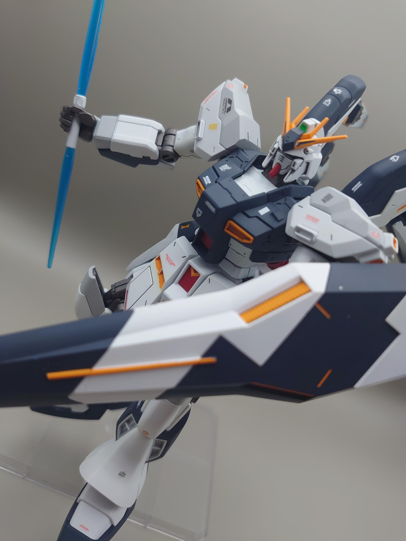 ガンダムカラーのνダークブルーが発売されたのでHI-νをνカラーで塗装しました。フィン・ファンネルバリアは100均のプラ板で製作し、バリア分のフィン・ファンネルのみOPパーツセットの無塗装を使用しています。