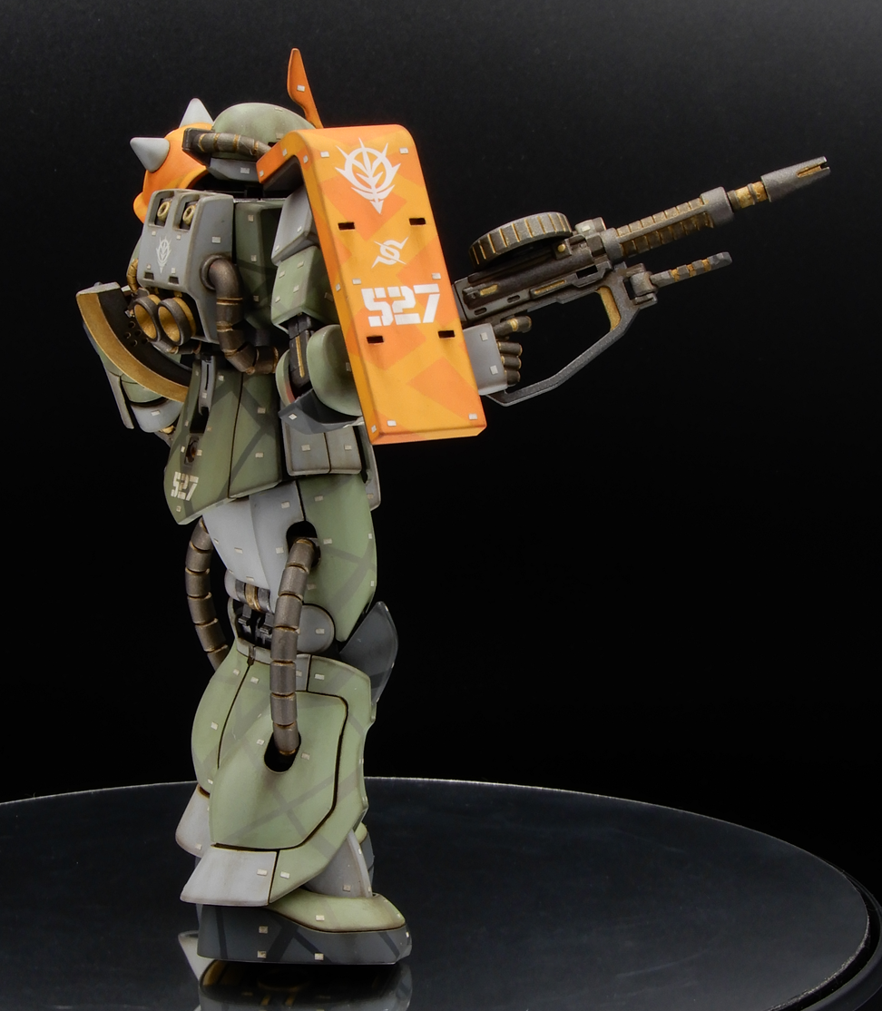お気楽汚しするつもりで無塗装デカール+クリアで放置してたHGUCシャアザクを