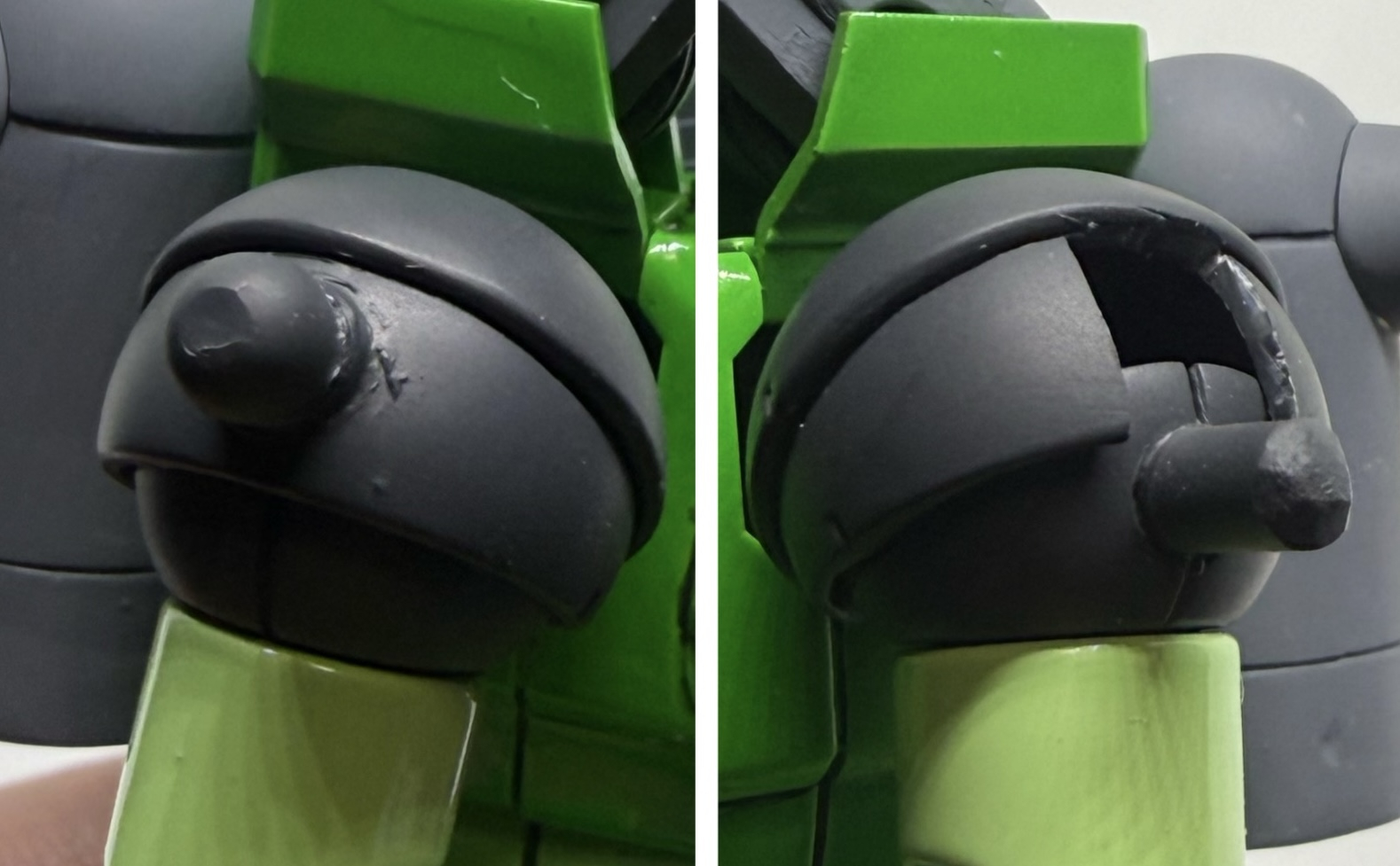 右肩はボールジョイントを移植し、左肩は3ミリプラ棒を接着し、可動に干渉する部分を切り欠いてます。