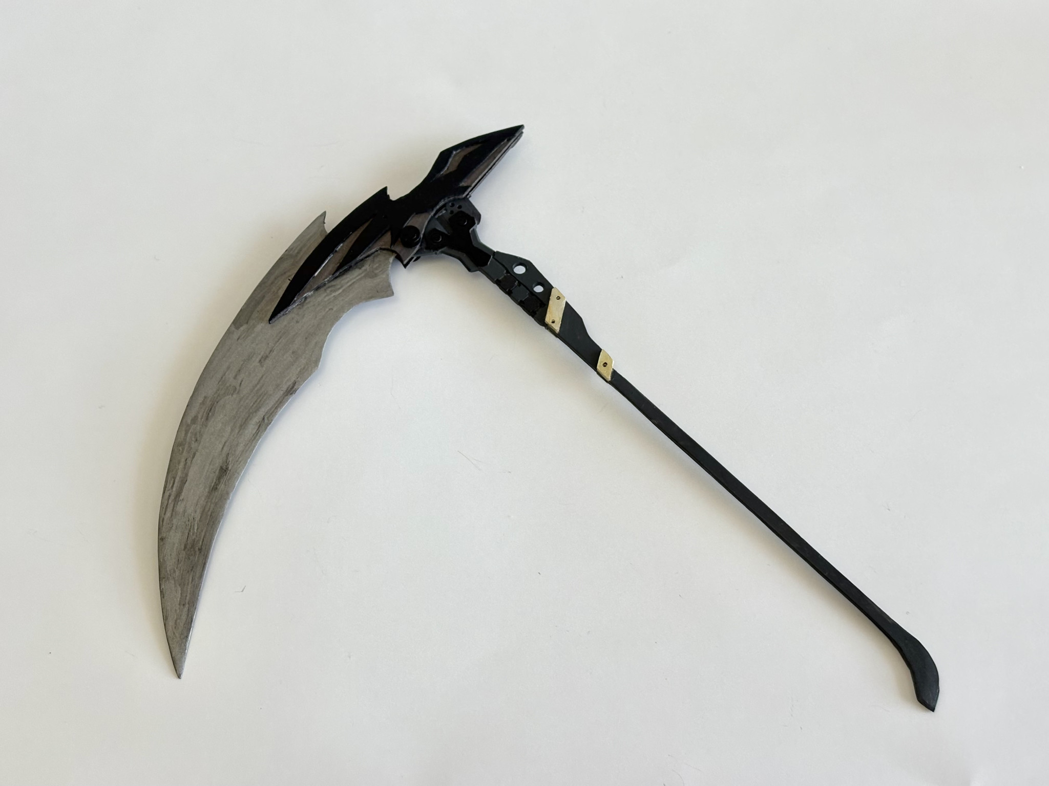 コトブキヤの鎌ベースですが、ほぼフルスクラッチといって差し支えない気がします。柄と刃はプラ板製です。刃は鉱石を研磨した感じを表現したかったので手塗りで色もムラを残してます。間違っても言い訳ではない。
