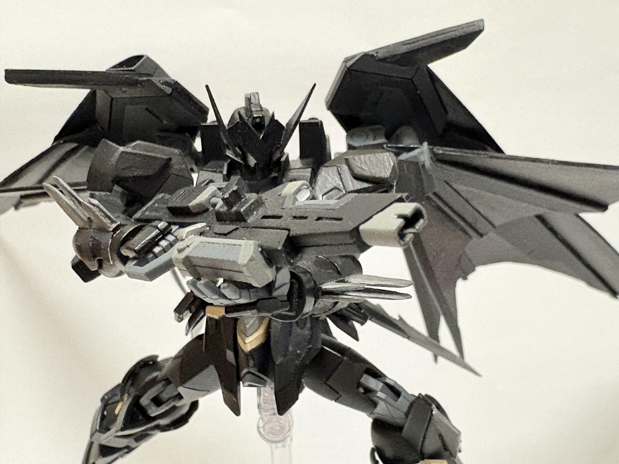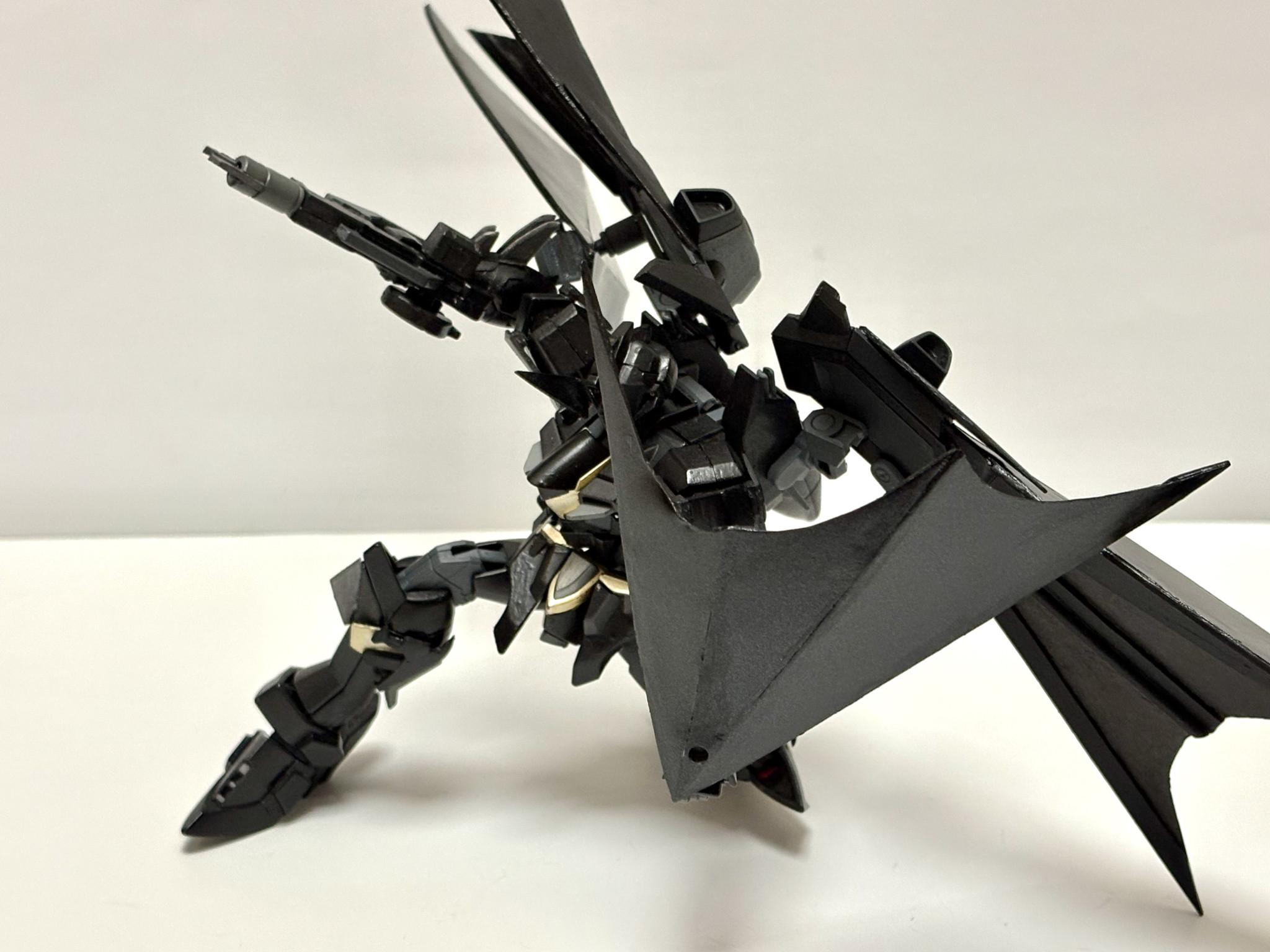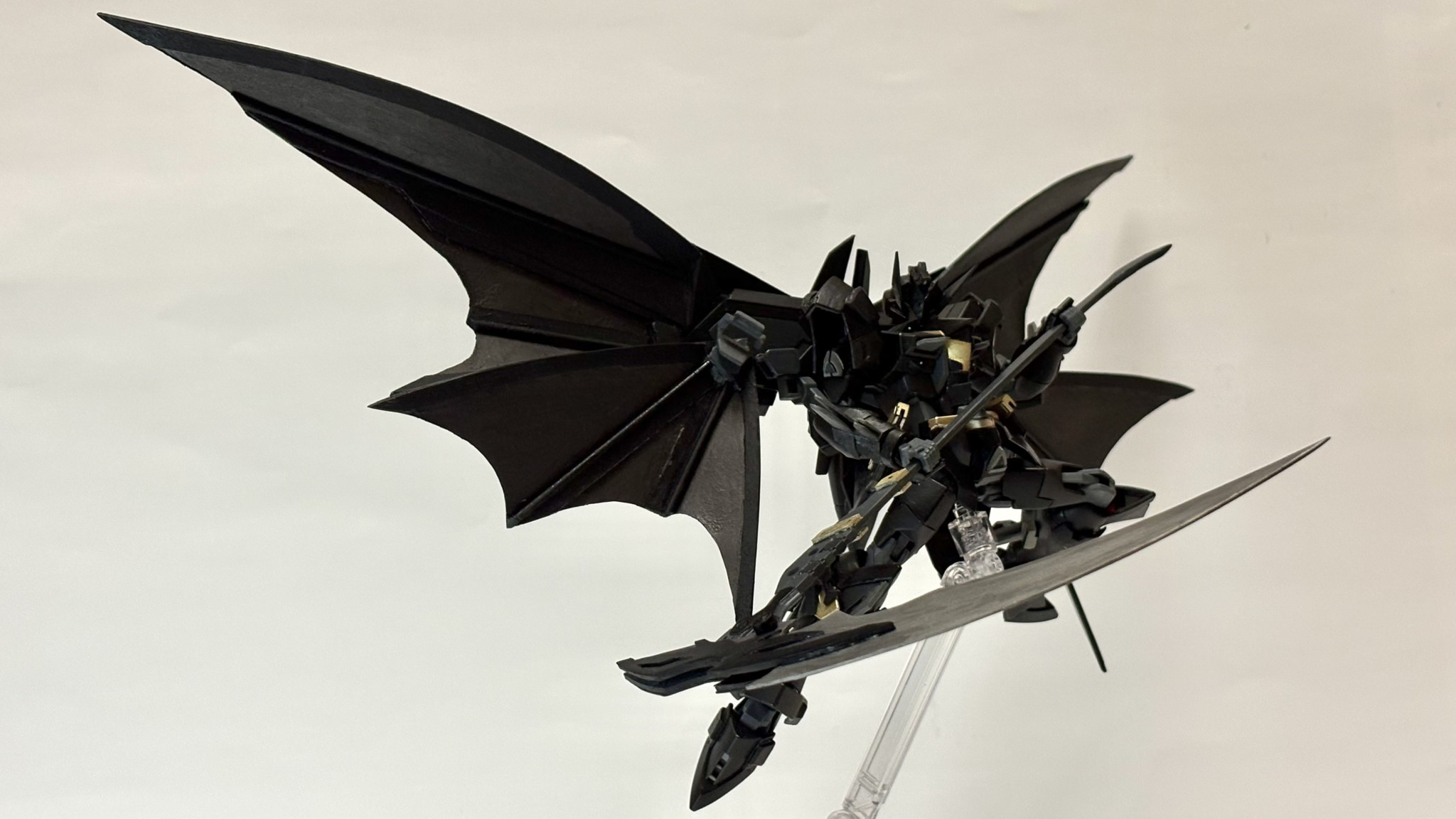 本体改造したときに余ったリフターをなんとか使いたいと思った末に、デスサイズみたいなメカコウモリウイング欲しいと思ったので作りました。飛膜はプラ板でスクラッチし、あとは細かい部分をいじってそれっぽい形にしています。ジャスティスらしさはしっかりどっかに棄てられたと思います。