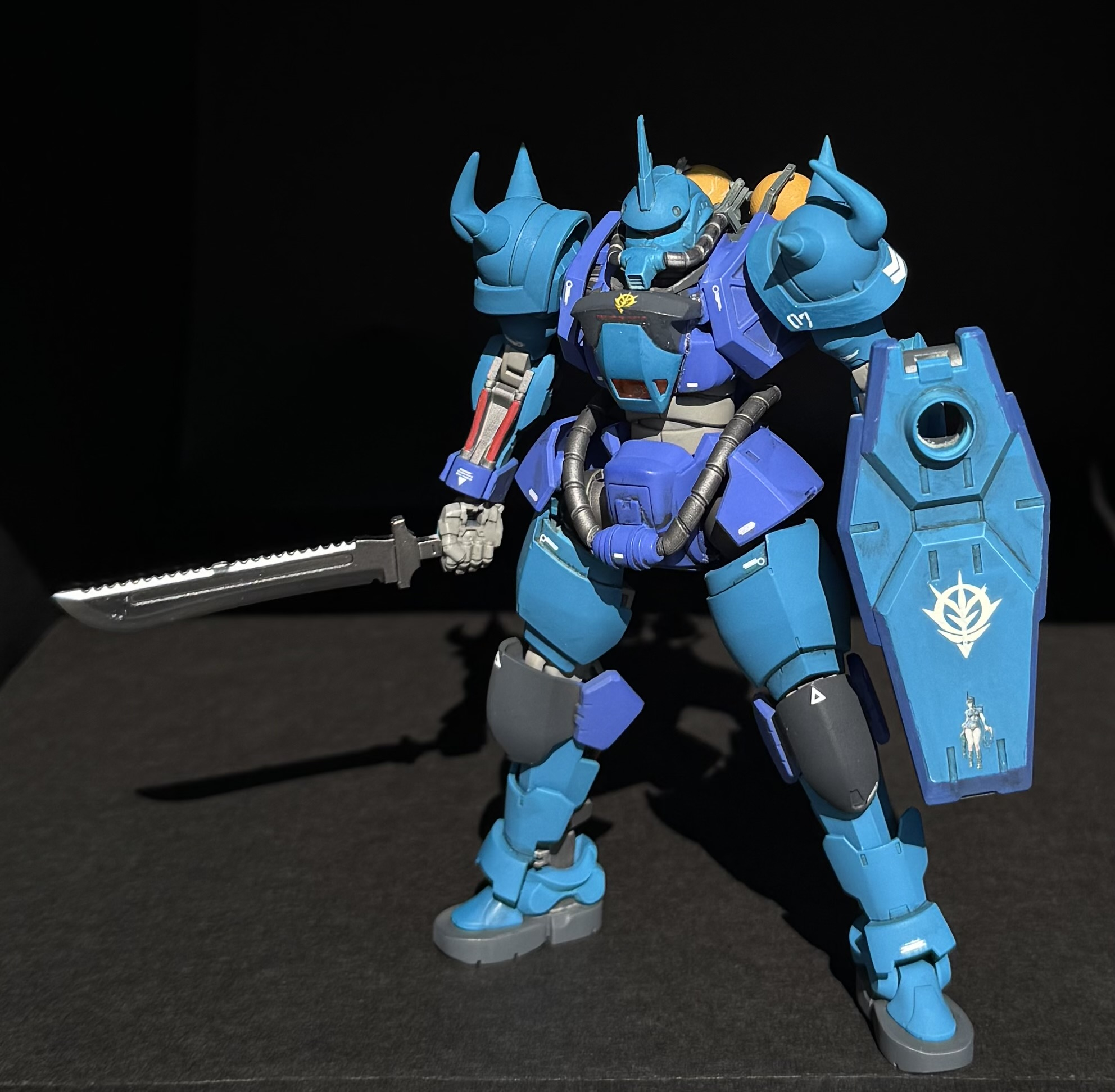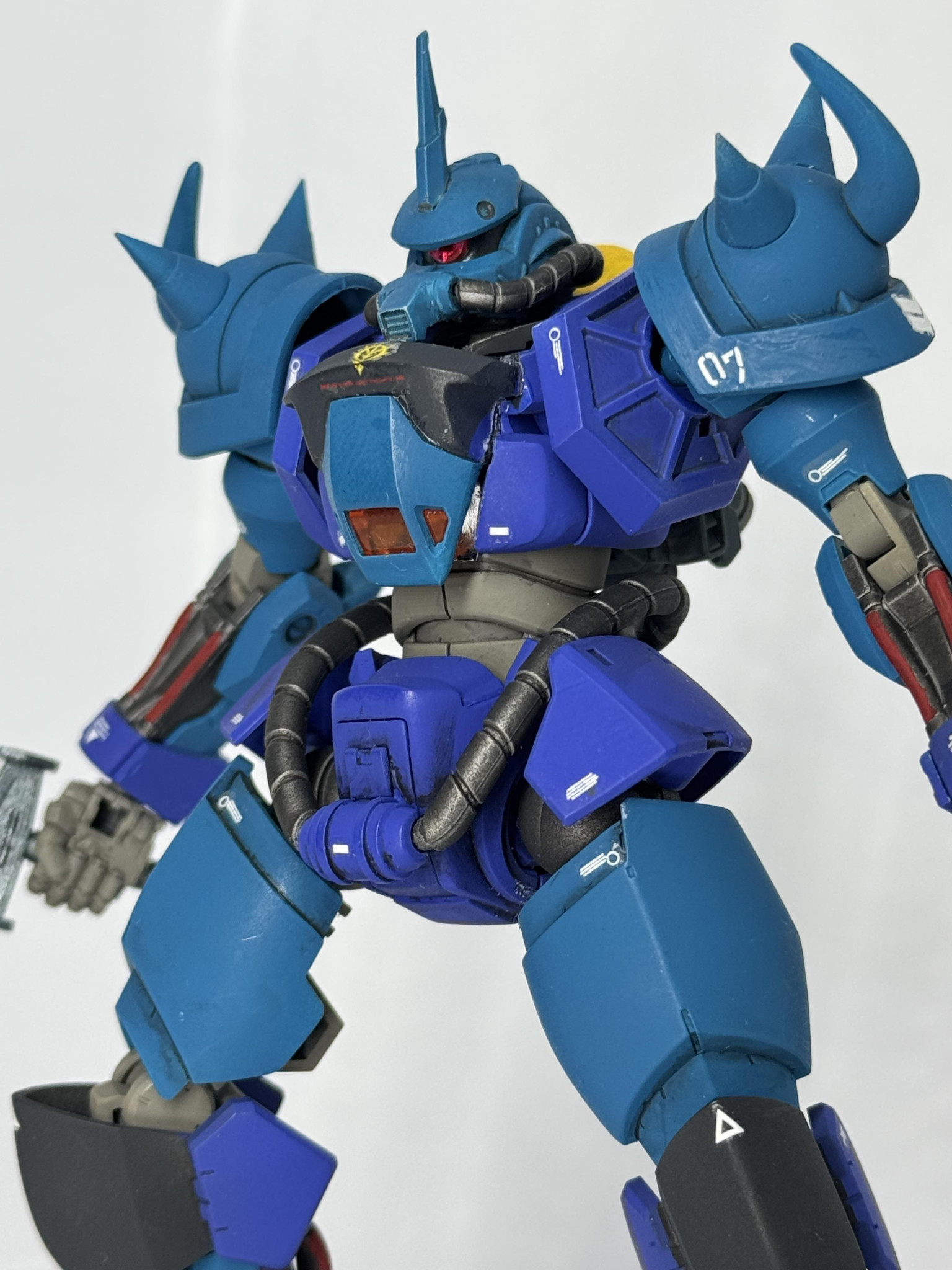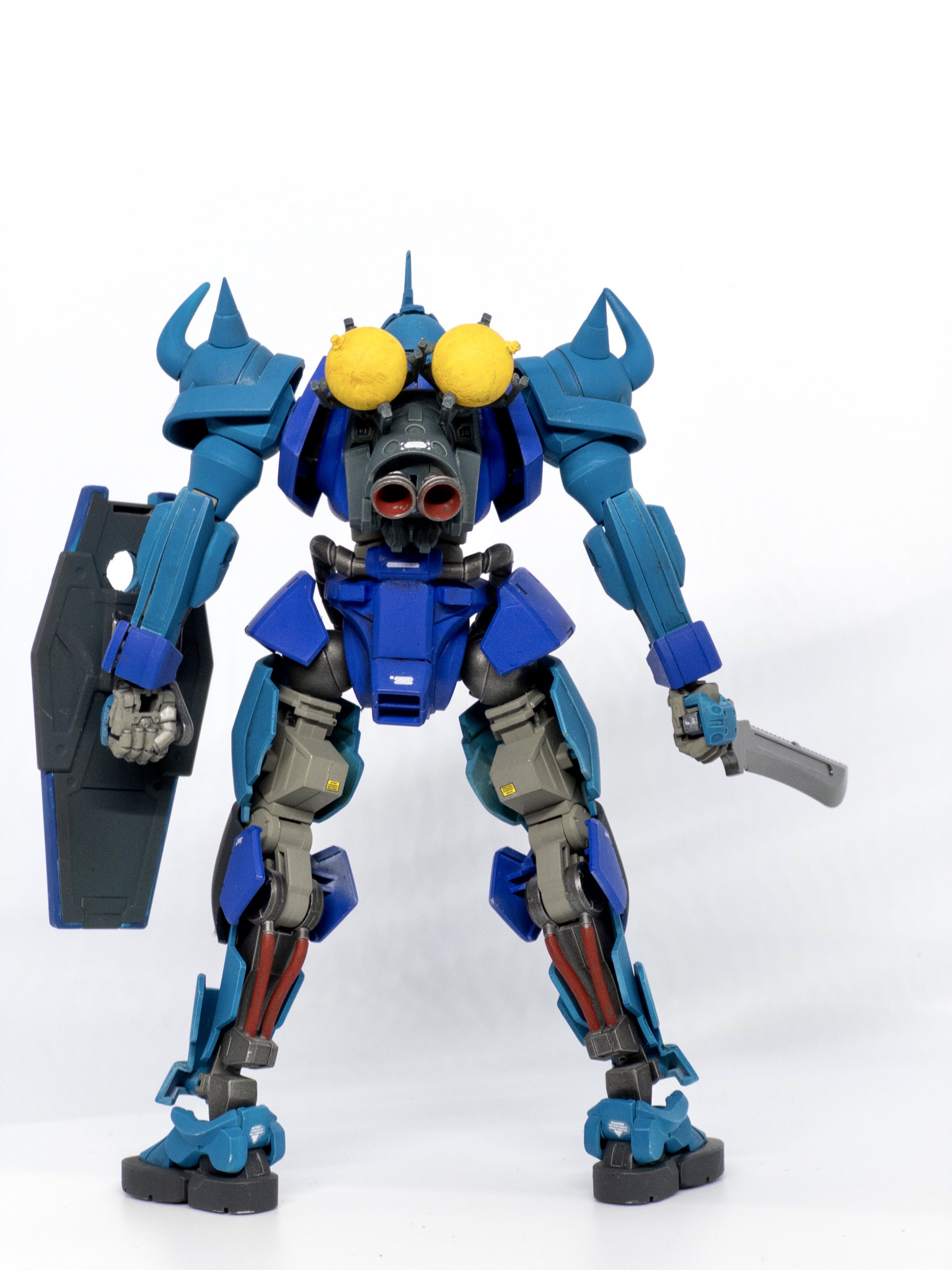 青くしてツノ付けて曲がったスパイク付けて…だけだとちょっと物足りなさそう、グフといえば地上用MS、地上だとあの脚部はないよなあ…ってことで動きやすいものに変更しました。