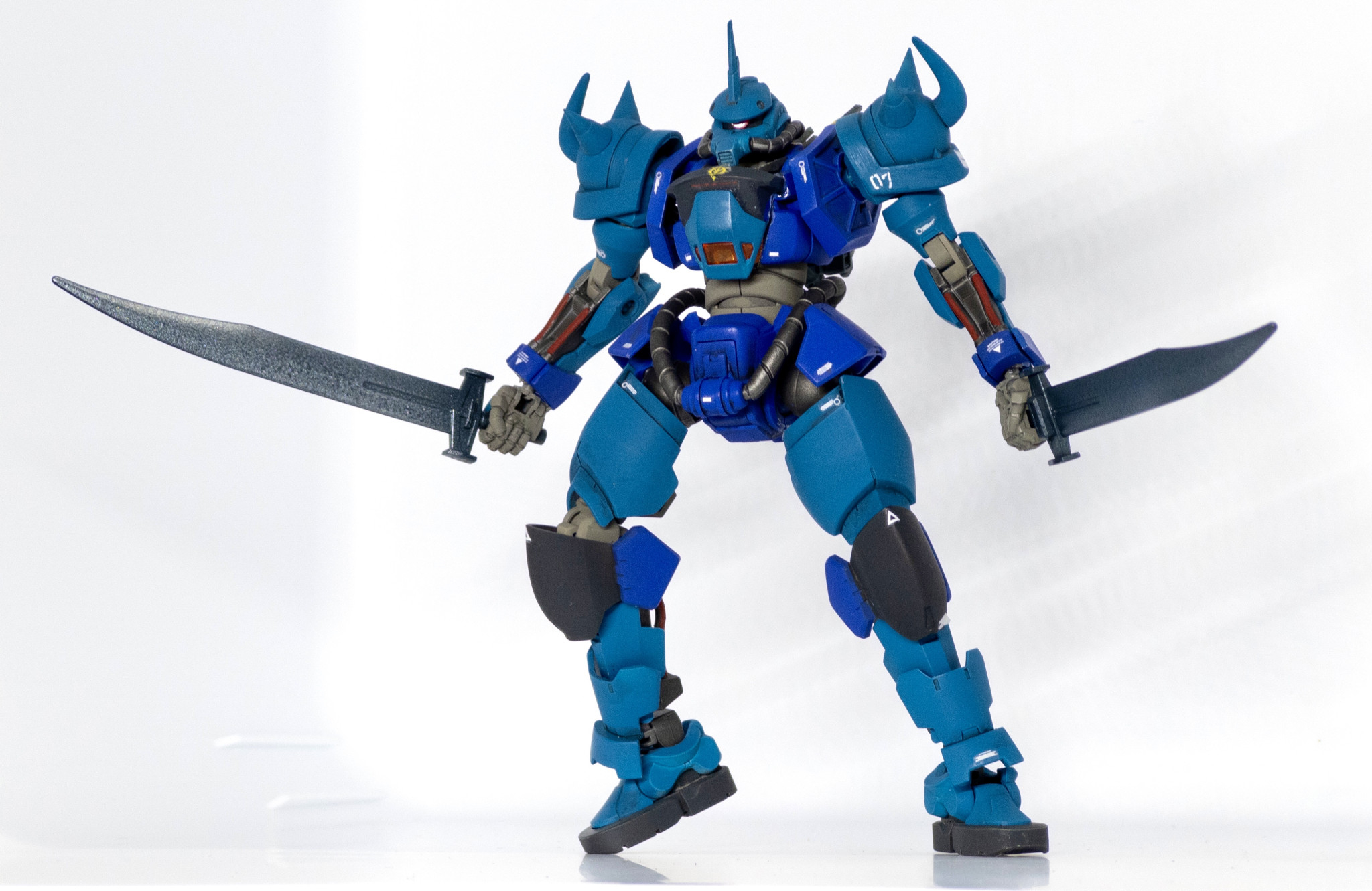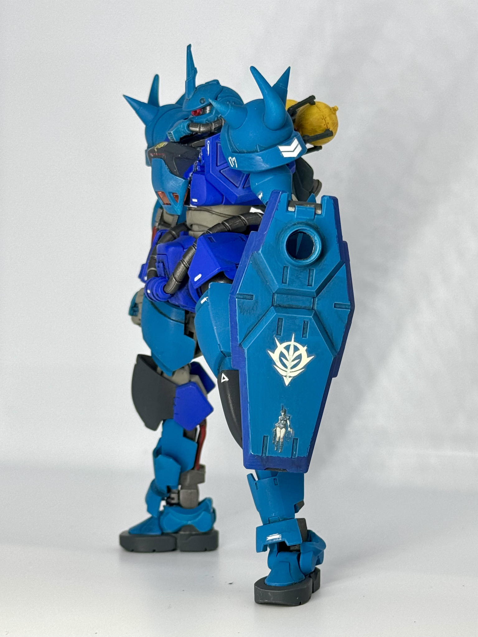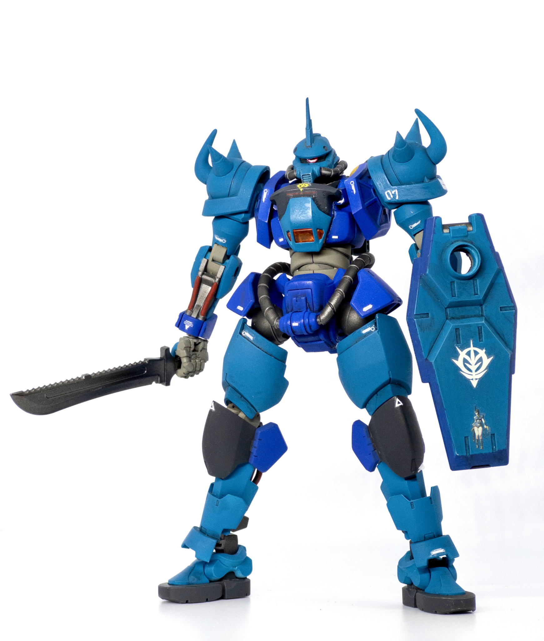 青くしてツノ付けて曲がったスパイク付けて…だけだとちょっと物足りなさそう、グフといえば地上用MS、地上だとあの脚部はないよなあ…ってことで動きやすいものに変更しました。