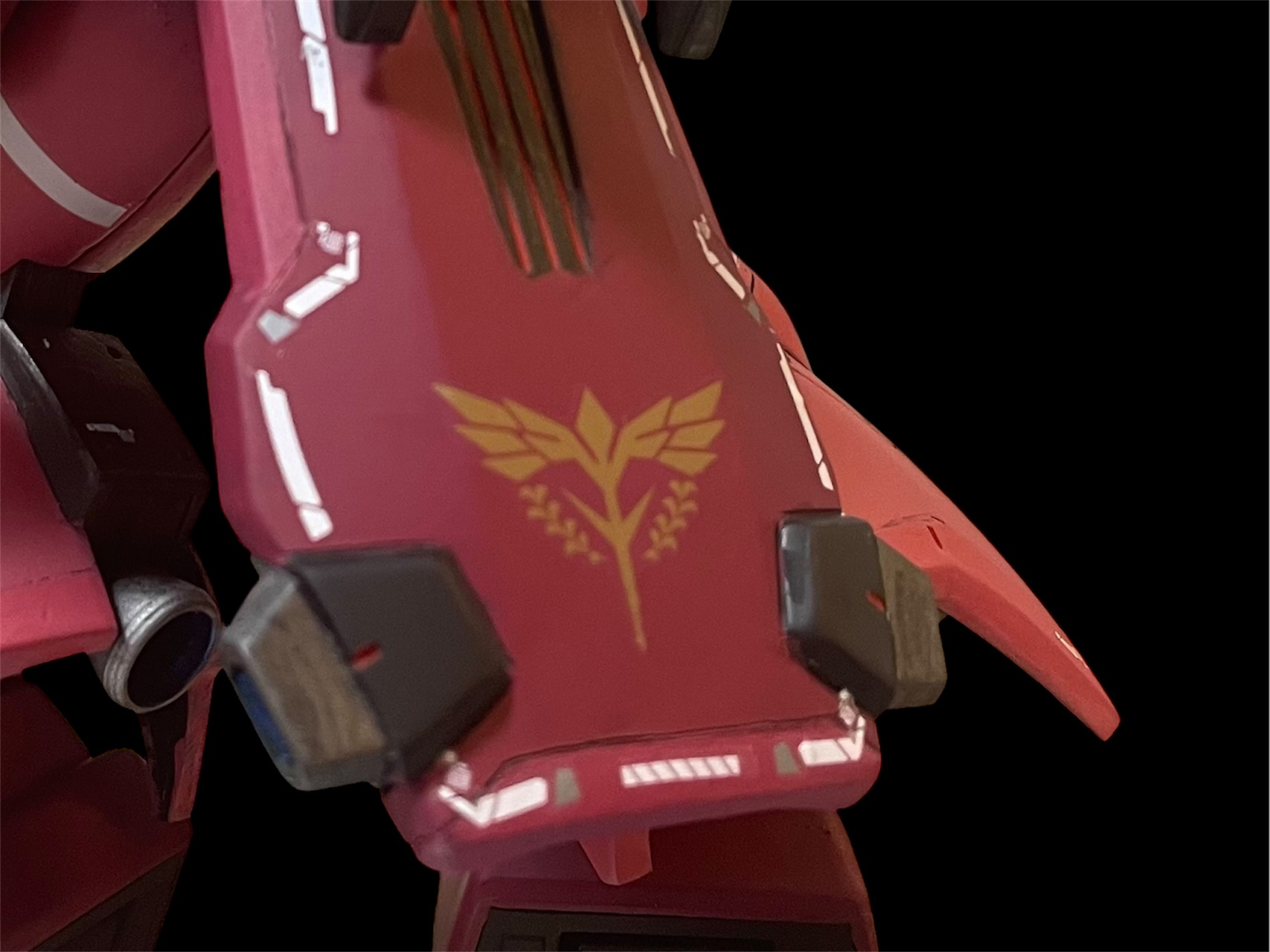 大きなリアスカートが特徴的な機体ですので、エンブレム凸モールドを削り落としデカールでエンブレムを貼り付け、ラインデカールも多めに貼り付けています。
