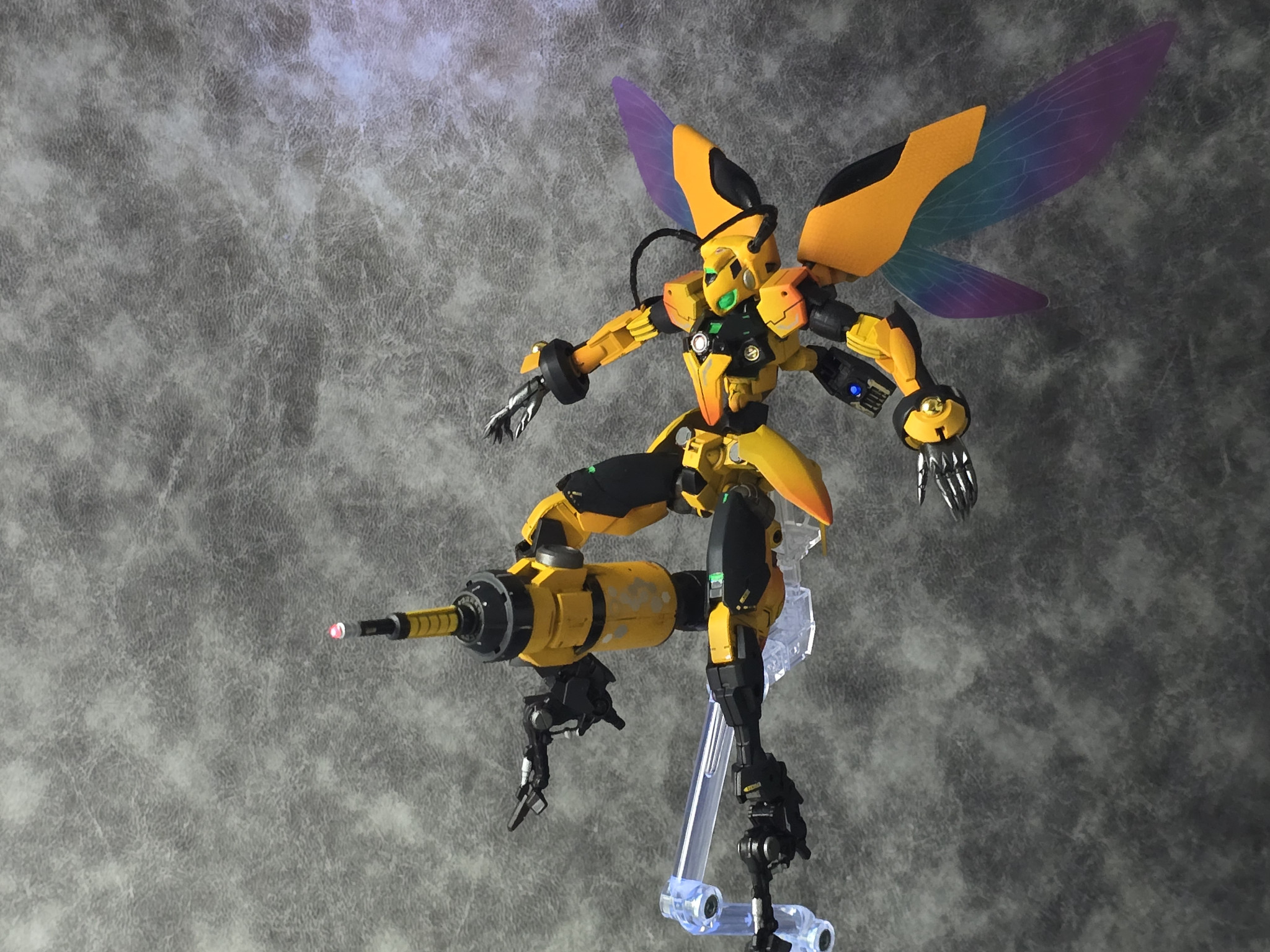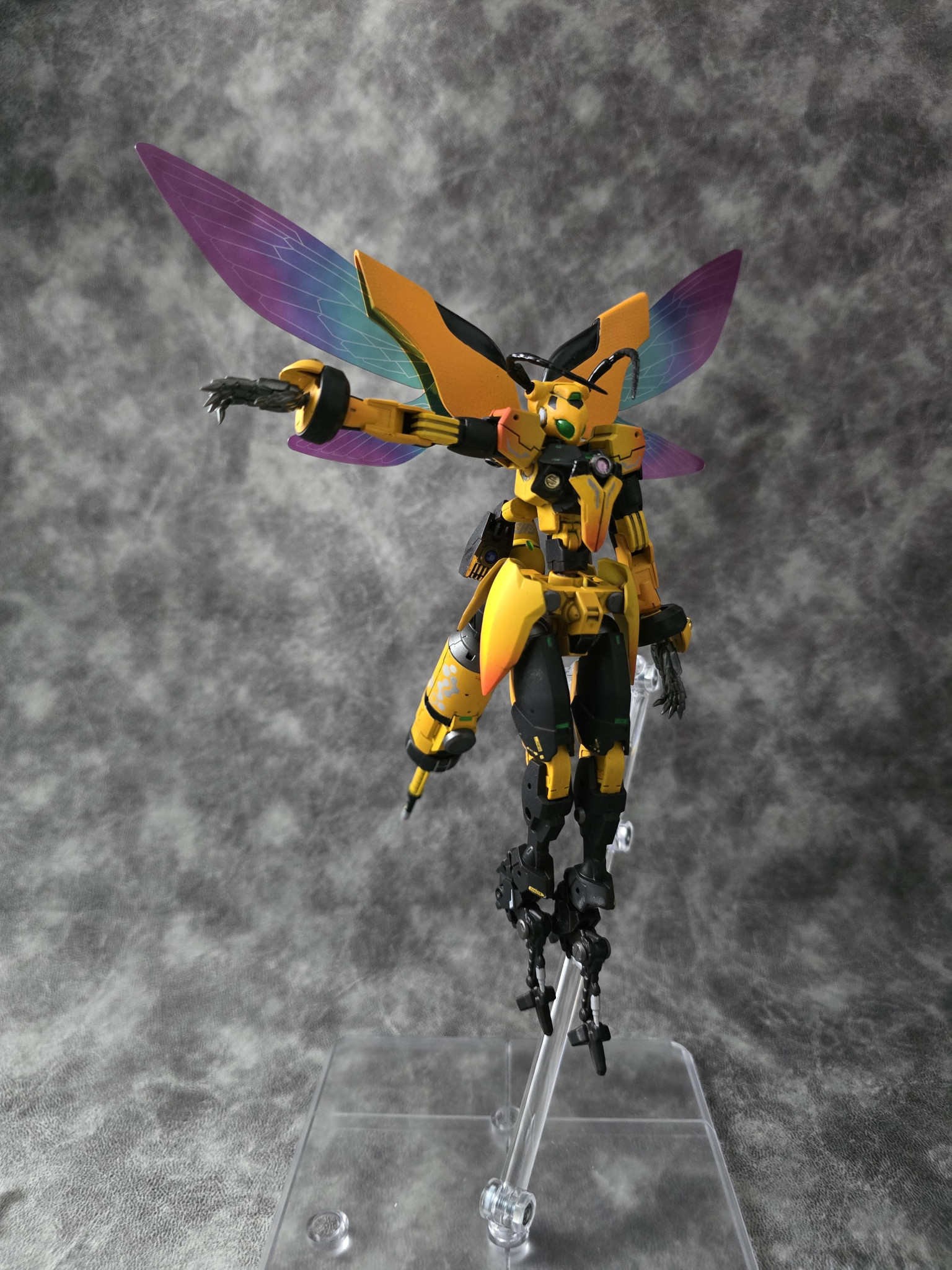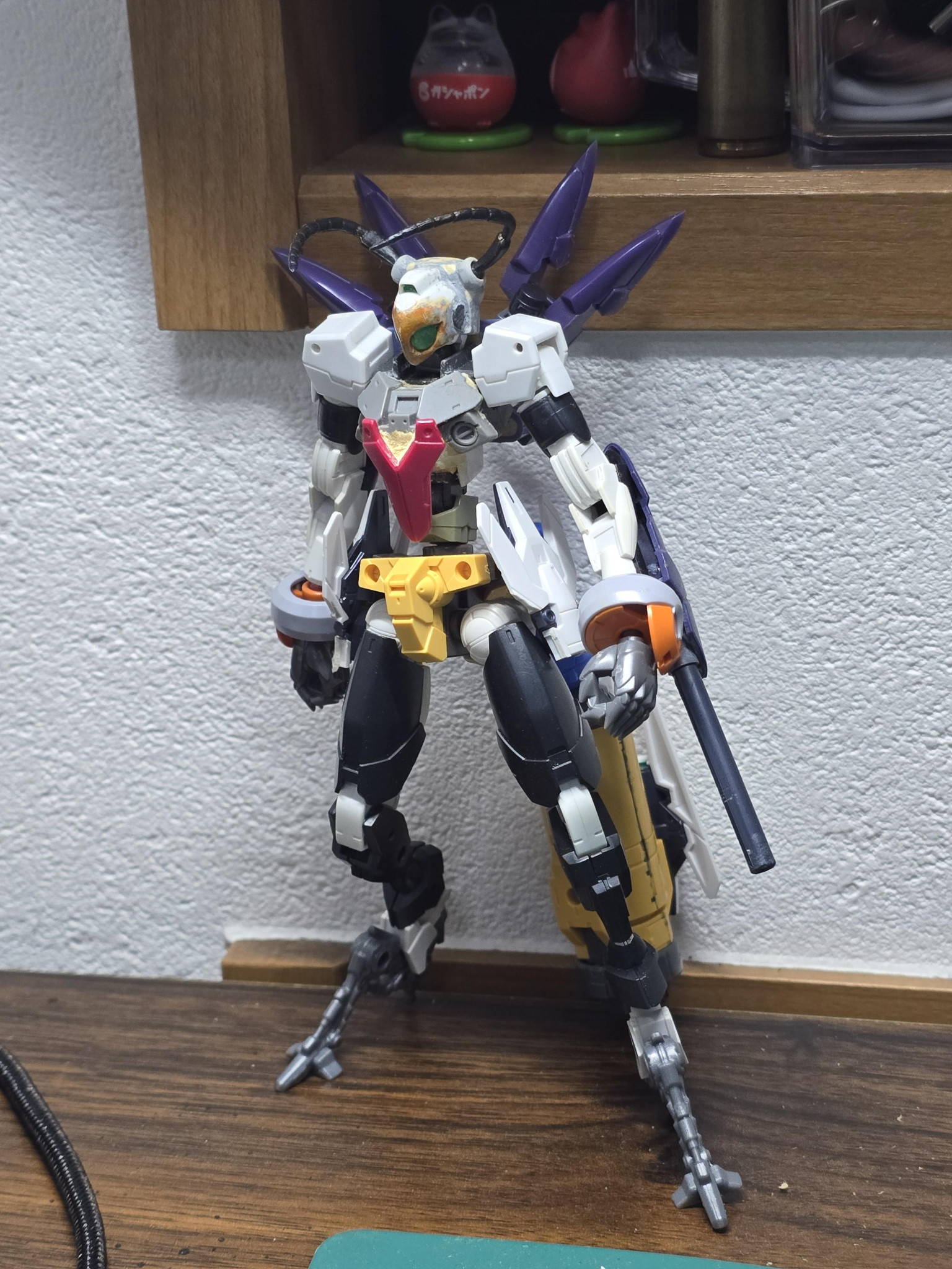 頭と胴体・肩はGNアーチャー、他の部分はほとんど30MMです。足はゾイドの昆虫系、頭の触覚はガチャガチャのスズメバチフィギュアから取ってきてます!