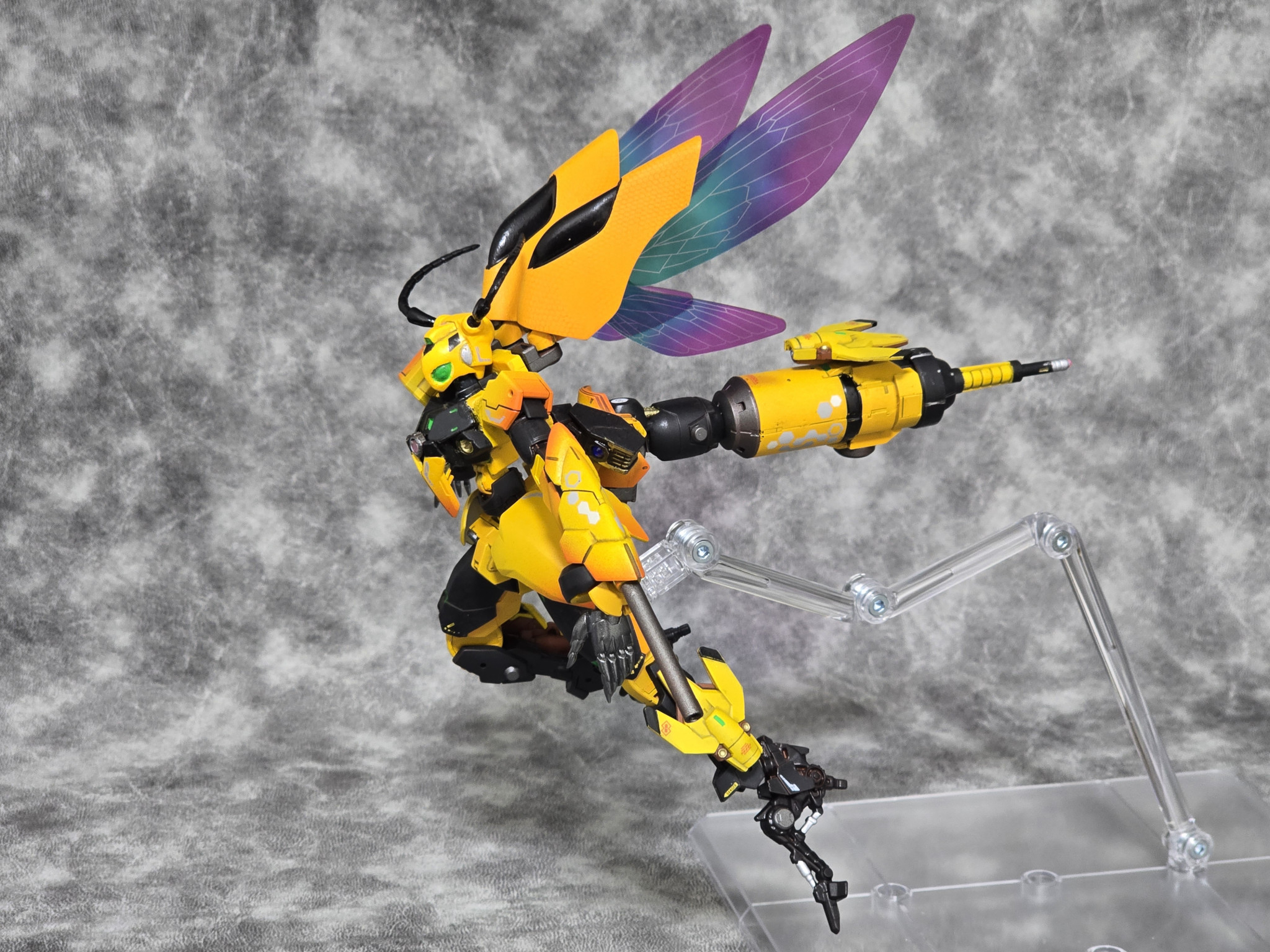 蜂の針を刺す体勢を取らせたくて、未熟ながら腰周りと尾の関節に試行錯誤しました。