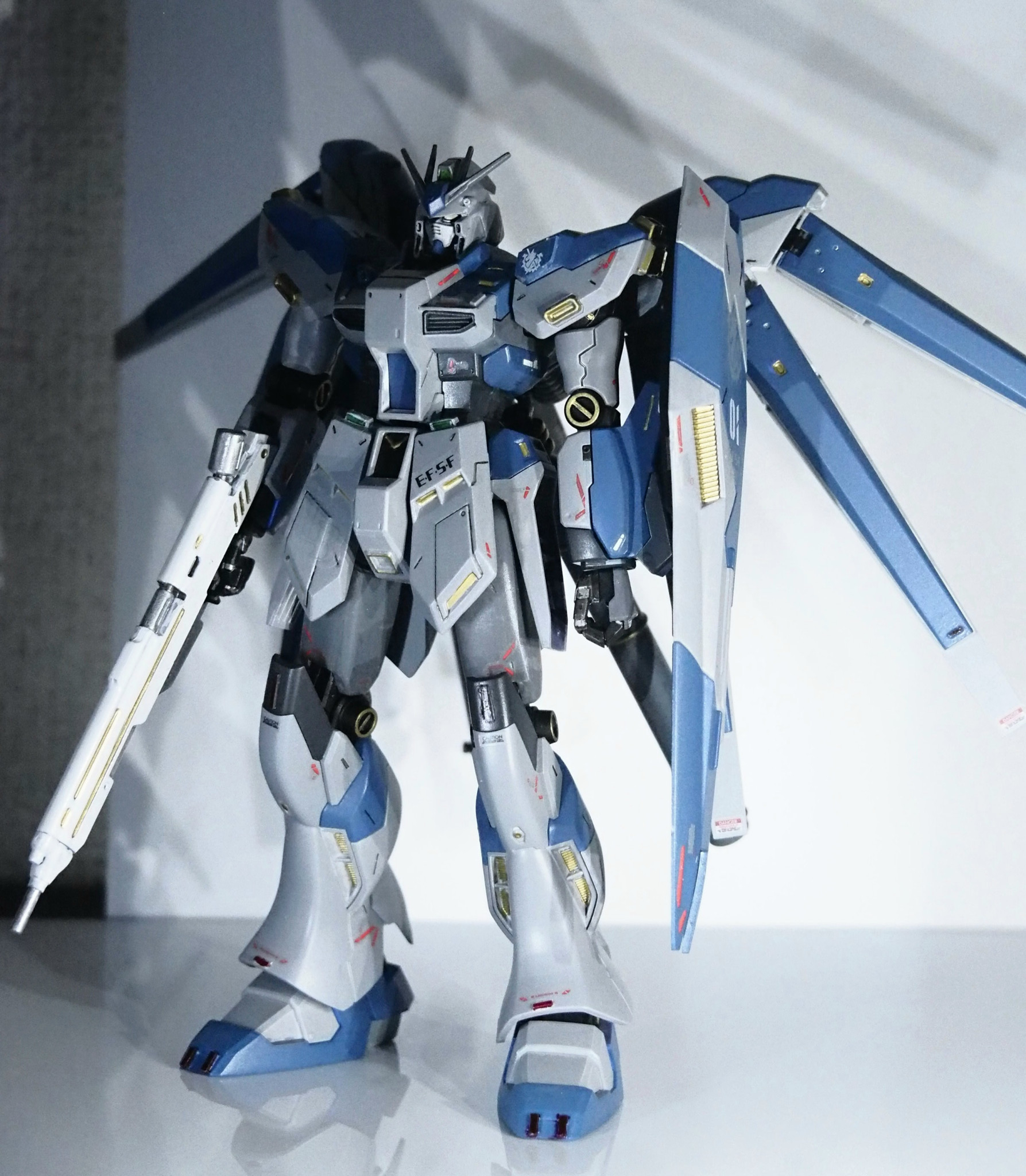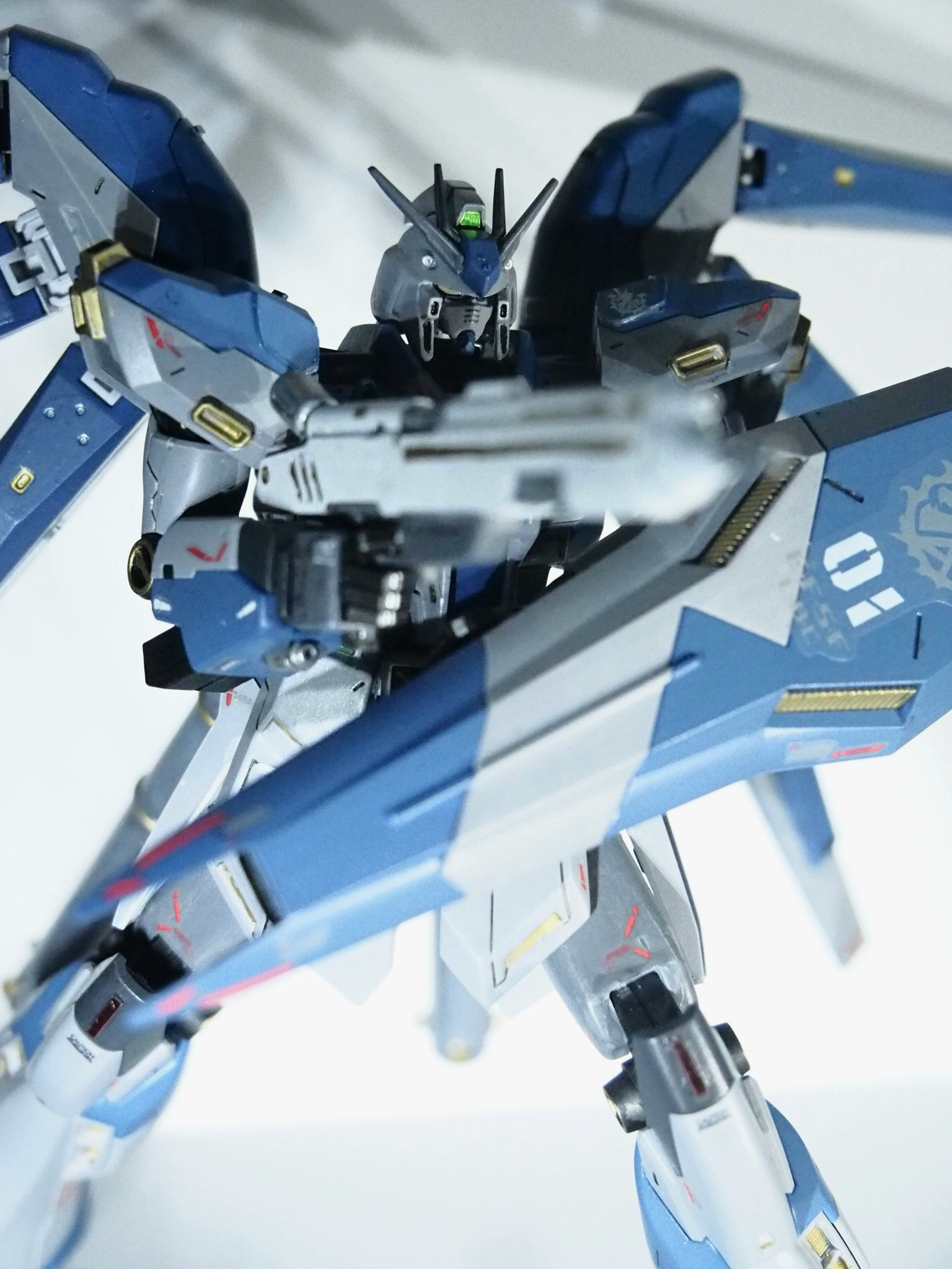 「旧キットgp02」「デスティニーSPEC2」をイメージしたカラーリングになっています。そこに金を差し色で入れる事で大人っぽく、RGHi-νのような仕上がりになりました!