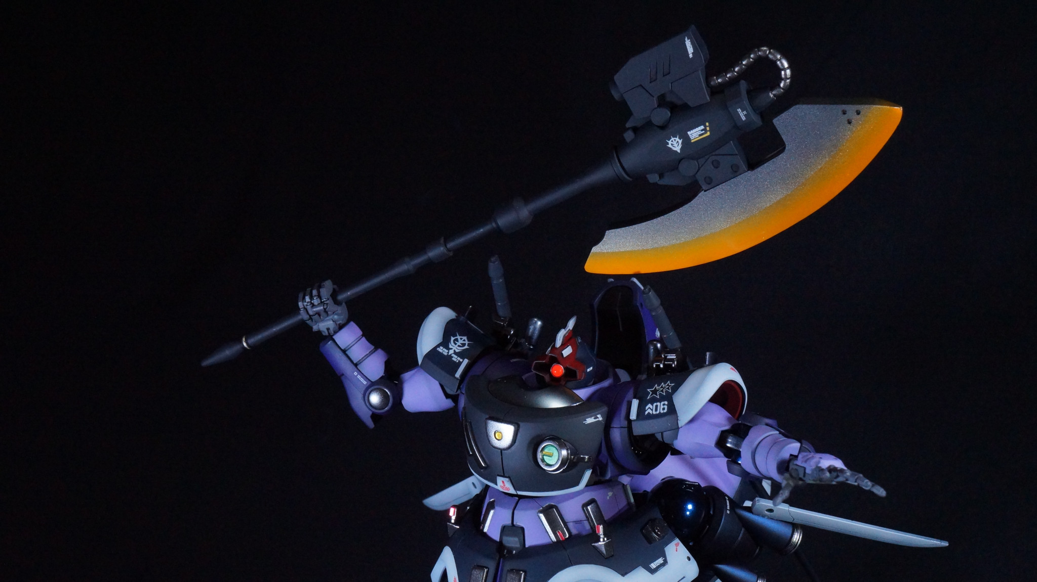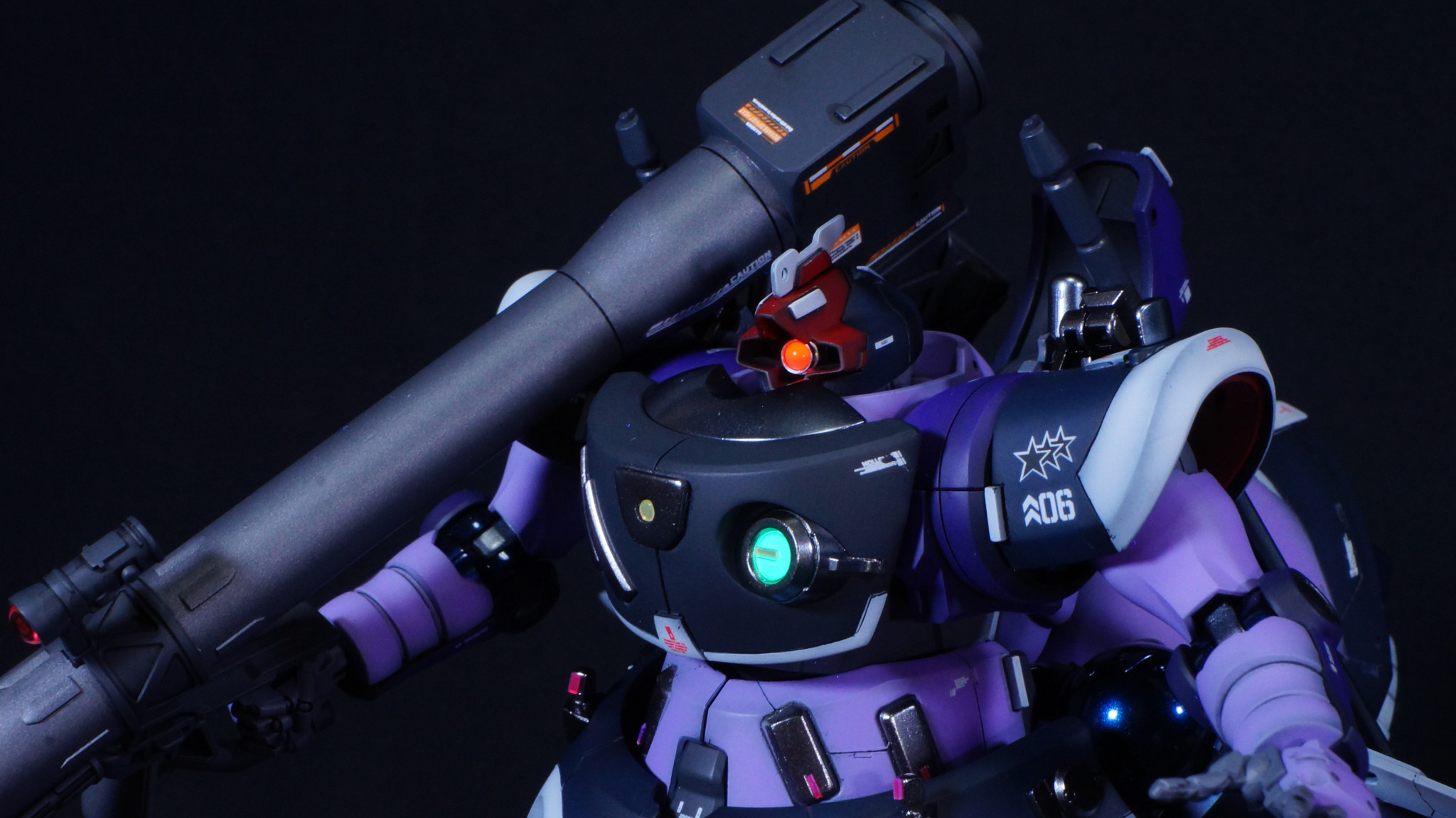 モノアイはハイキューパーツのルミドームとベース部にSPプレートを使っています。胸部のフラッシュライト的な?緑色の部分ともどもUVライトで光ります。(zaku-kao5)
