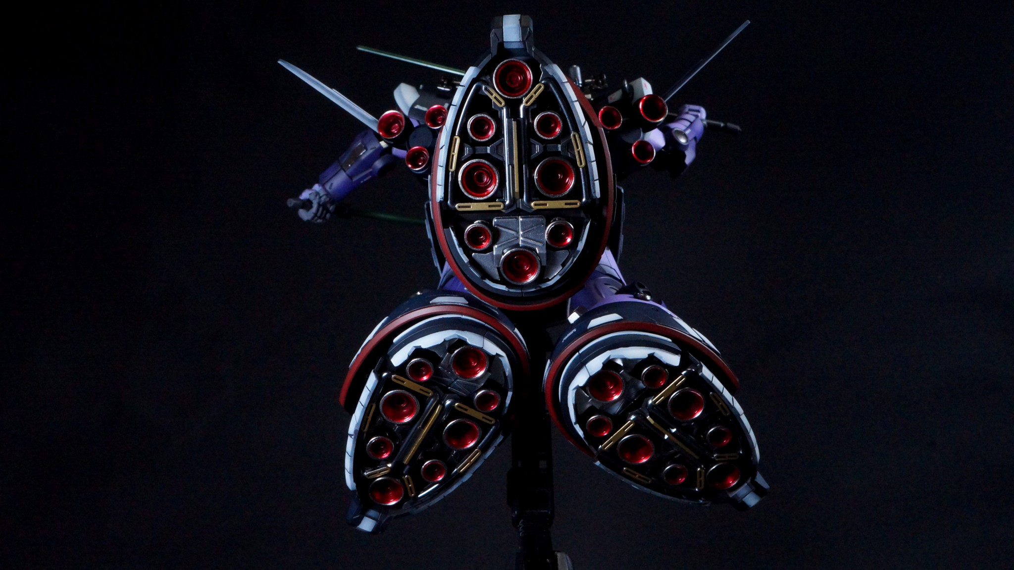 脚の裏は一応メタリック3色使って塗り分けています。黒下地にガイア パールシルバーを主に挿し色でゴールドを塗りました。バーニアの外側はスターブライトジュラルミンになっています。内部は先ほど言ったようにMr.Color GX クリアールージュでキャンディ塗装にしています。以前のゲルググ同様、蛍光クリアーで塗ってあるのでUVライトで青く光るのですが、広範囲過ぎて手持ちのライトだと全体をキレイに発光させれなかったので、写真はお蔵入りです。(zaku-kao10)