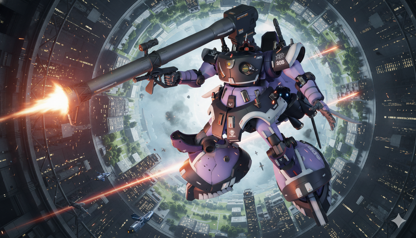 コロニーを背景に。ノールックでバズーカ撃っているのが違和感ですが…ご愛敬。