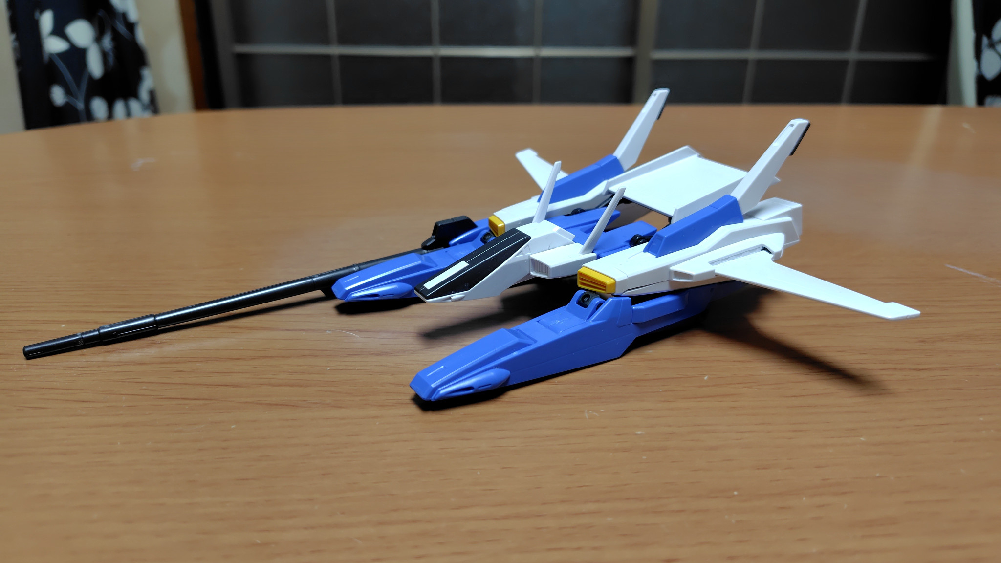 ディフェンサー単体。右舷にロングライフルを外付けしてコクピット両脇の青い双胴部分にミサイルポッドを搭載。
