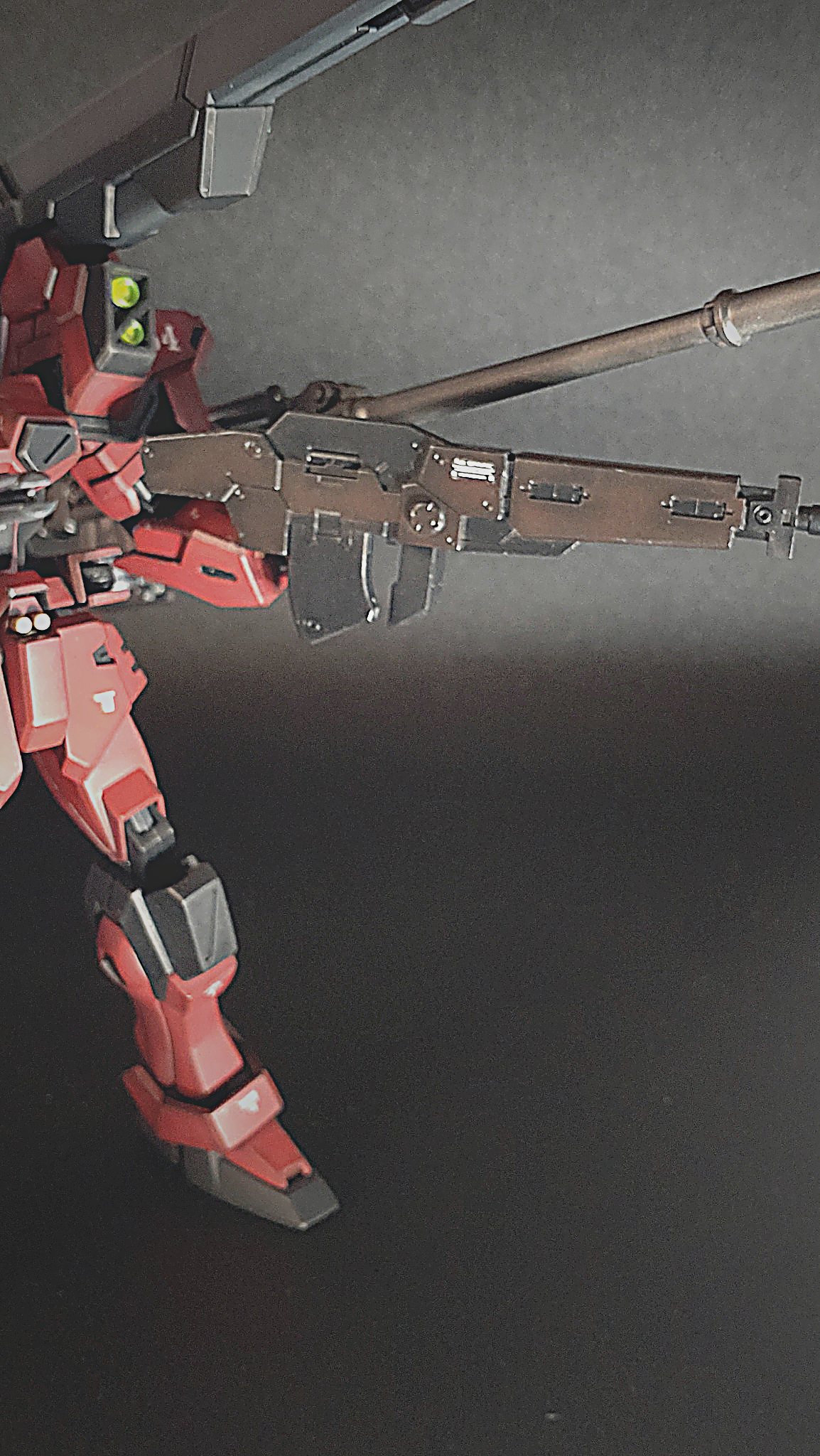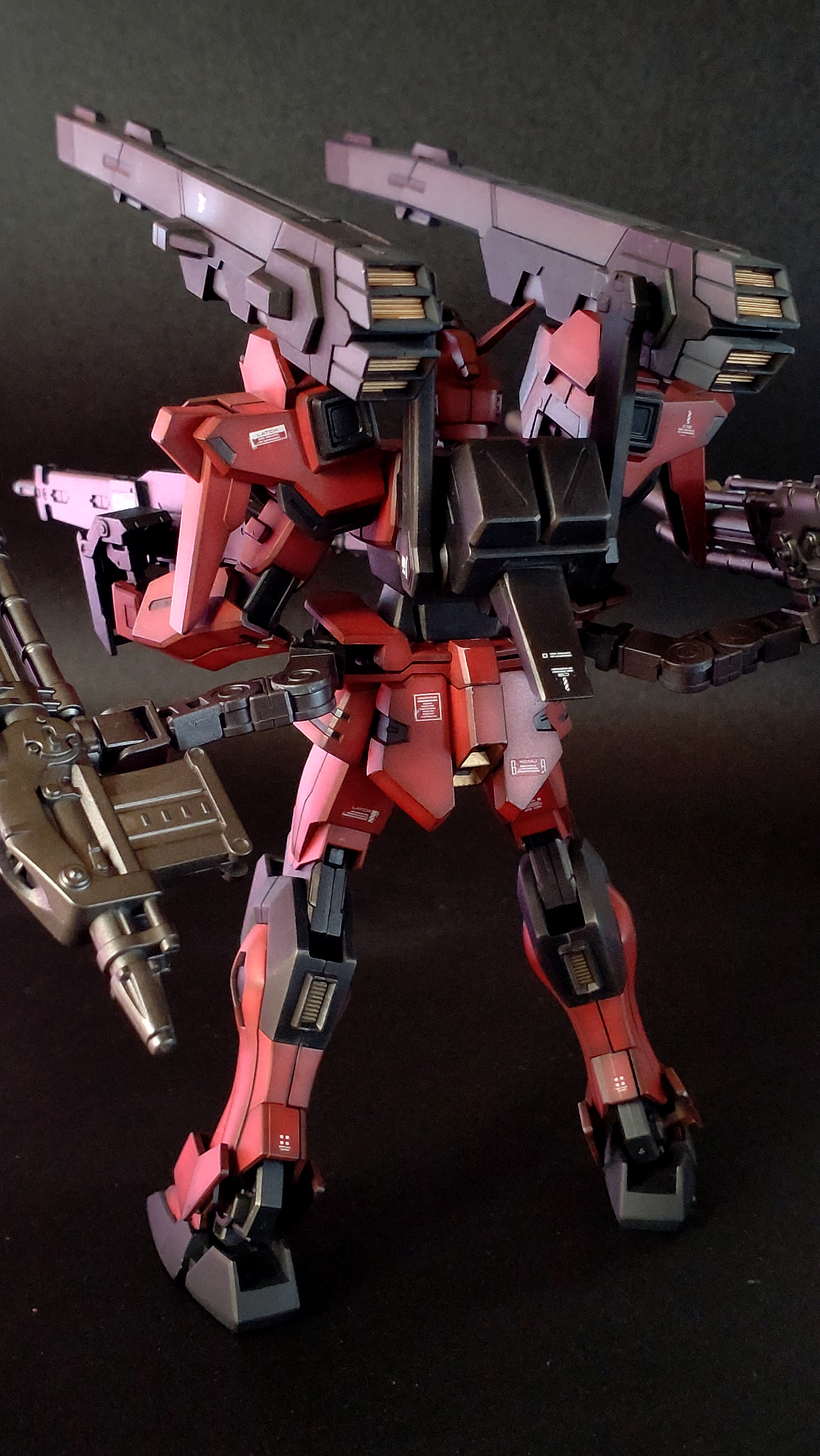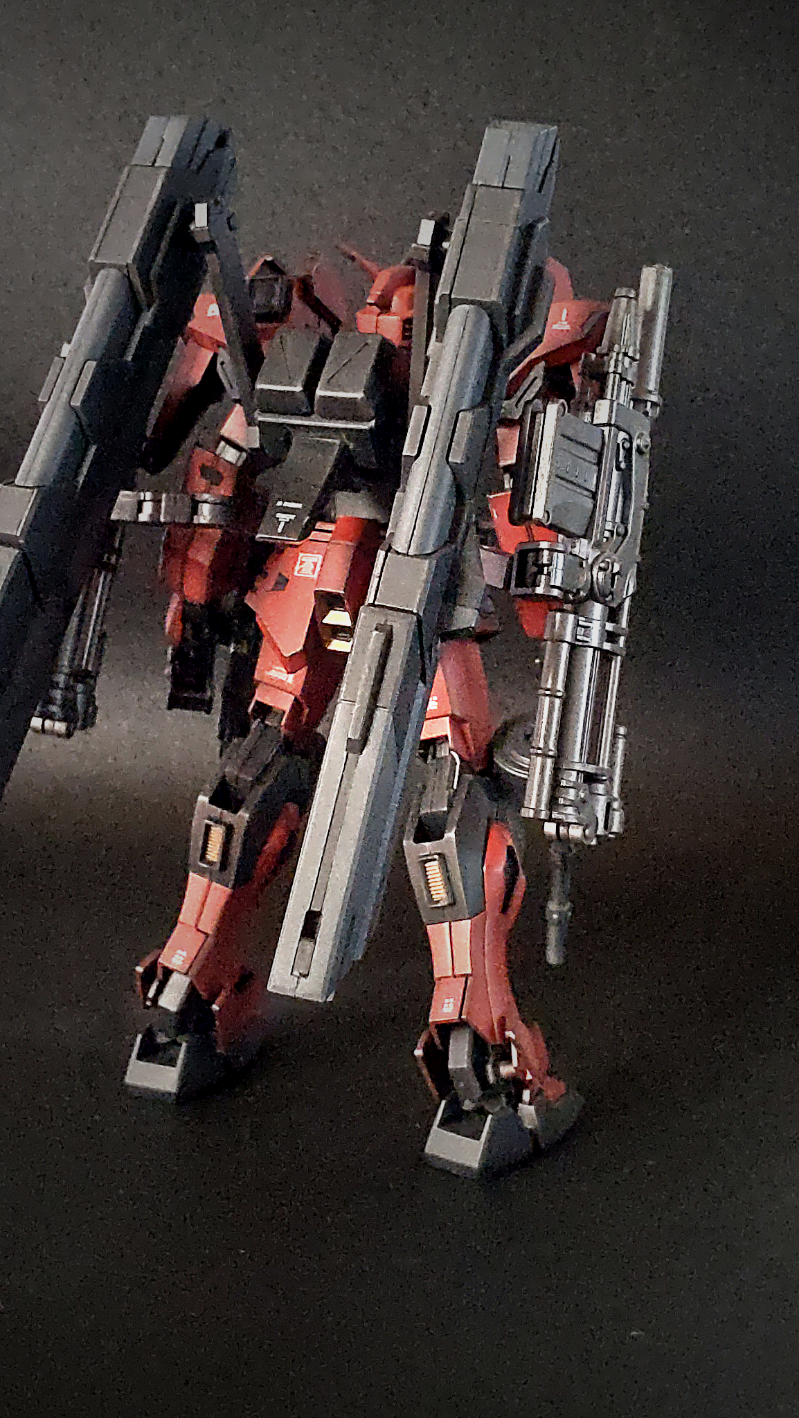 HGのライトニングバスターに武装モリモリで見るからに壁と思える様に作りました。元の武装にマシンガンとライフル両手持ち、腰にはロングキャノン砲と盛りだくさんにしてみました。