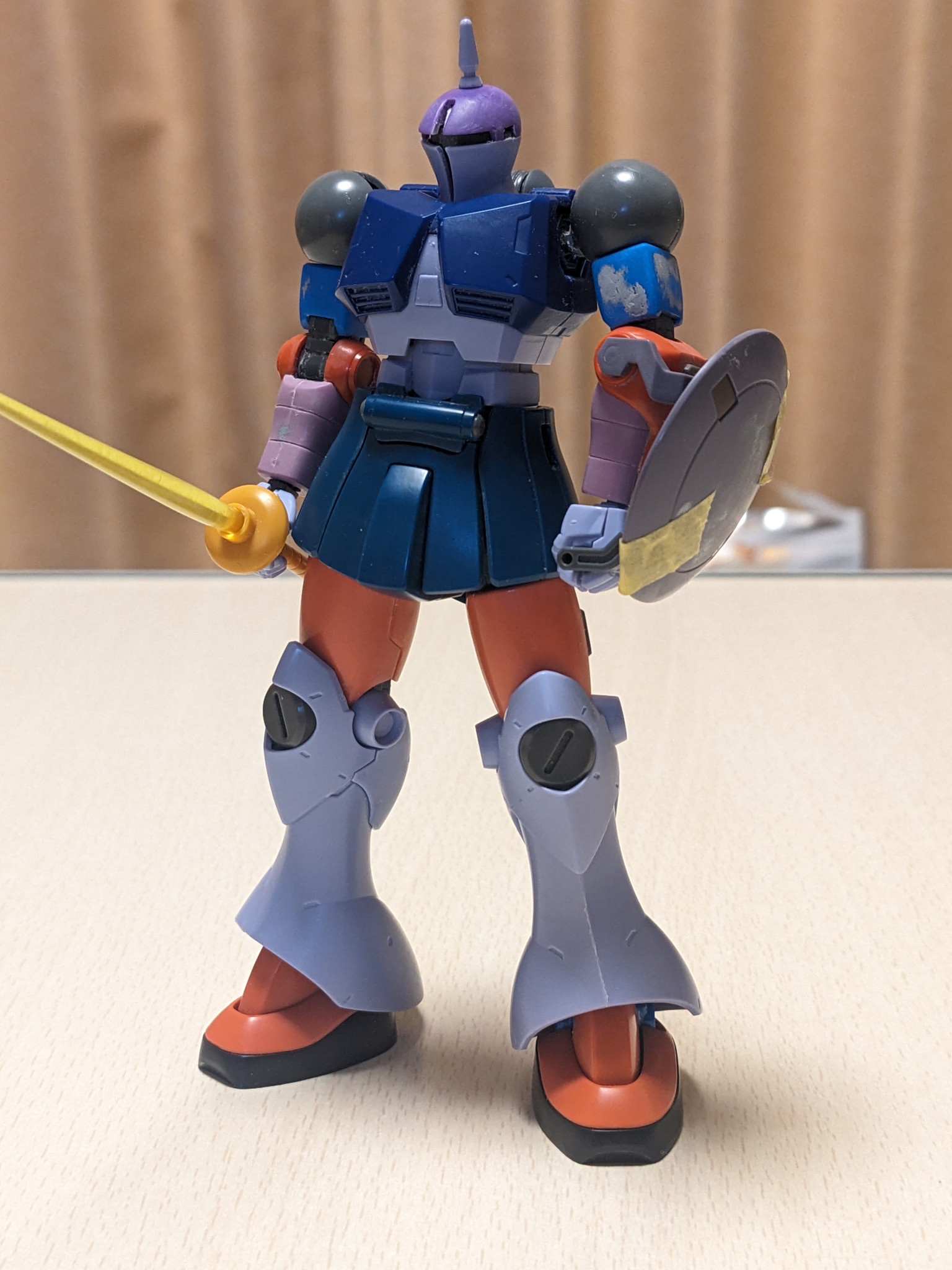 リアショット。ギャンには2本あるバーニアが1本になってるのが大戦末期でいかにも物資不足という感じが出せていてお気に入りポイントです。量産型のバーニアに付いてるサブバーニアの基部はhgucリヴァイブグフのヒートロッド基部パーツです。